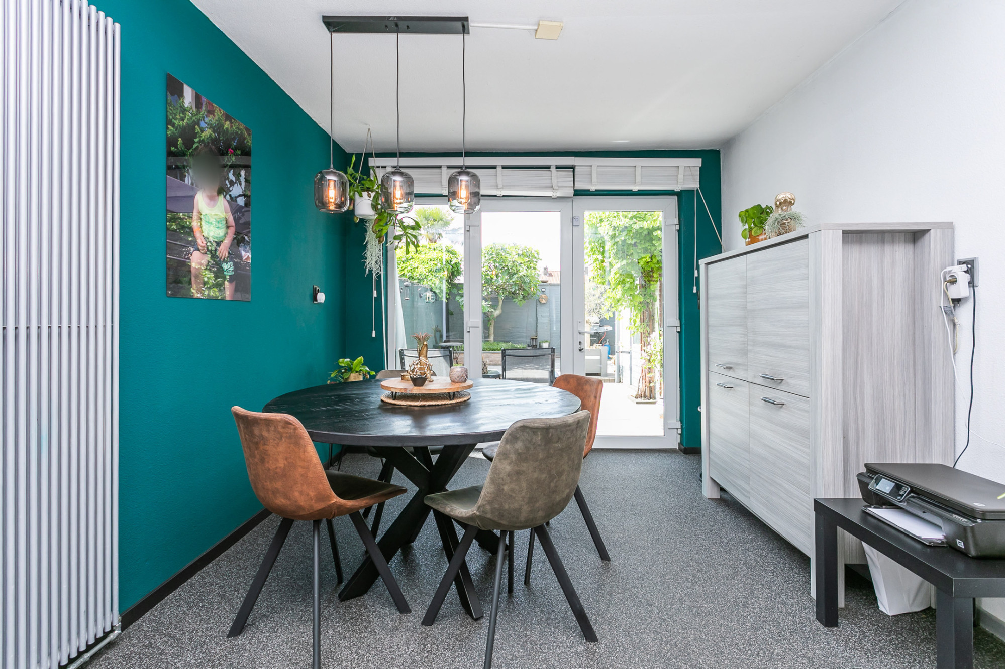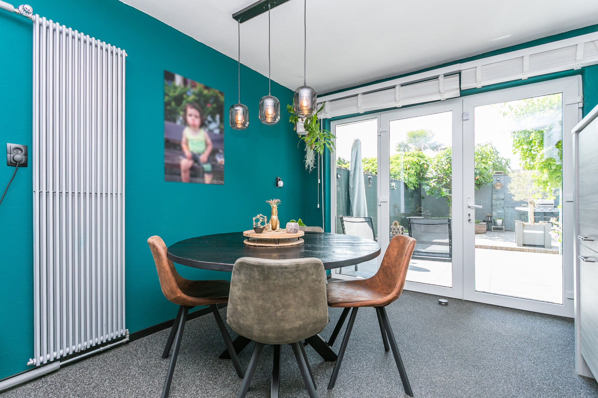 In de lichte aanbouw aan de achterzijde is de eetkamer gesitueerd, met een directe doorgang naar het terras en de tuin.