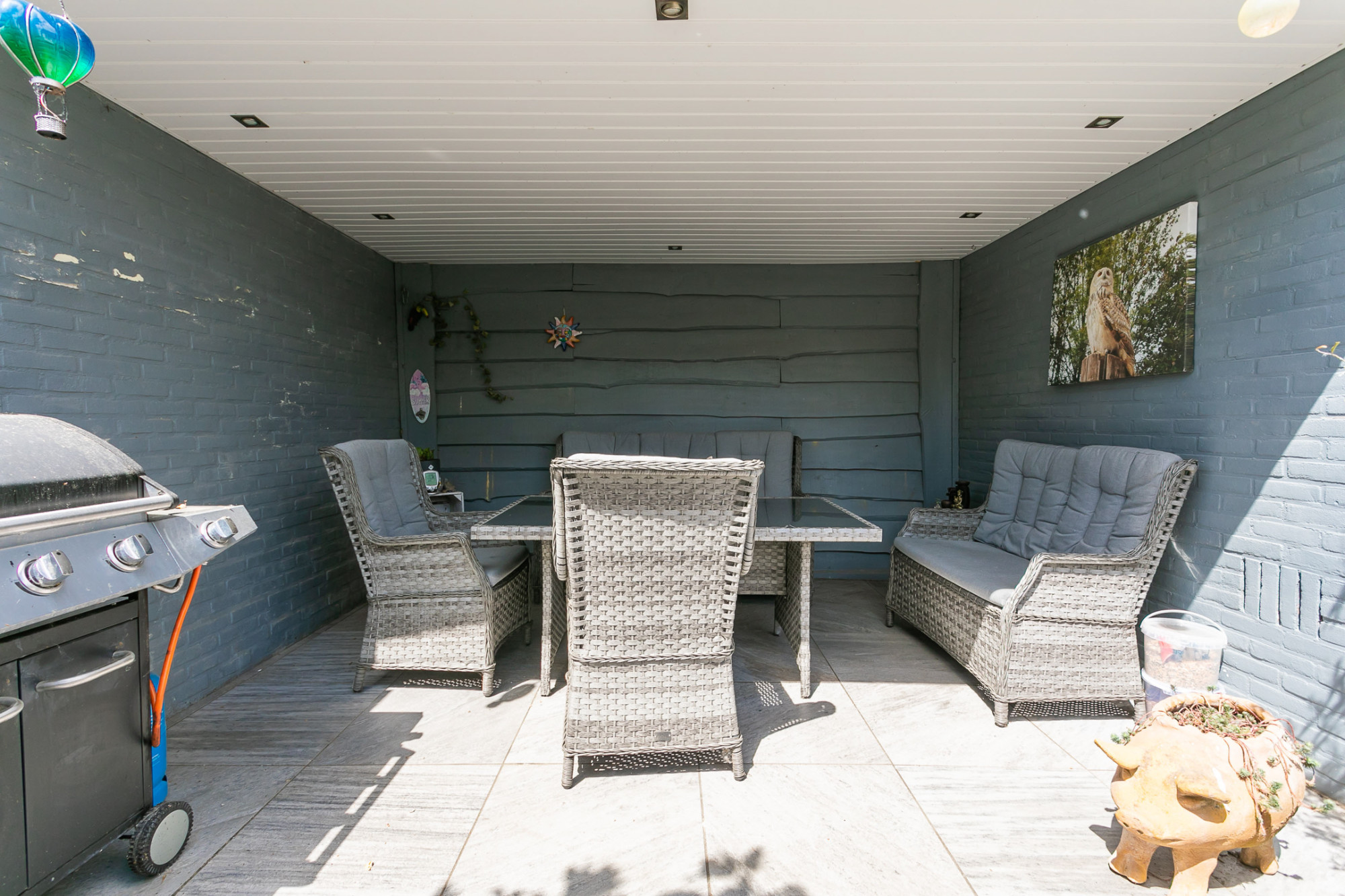 De geheel omsloten achtertuin op het zuidwesten is voorzien van een beklinkerd terras, een overdekte zithoek en een praktische stenen berging met kantelpoort.