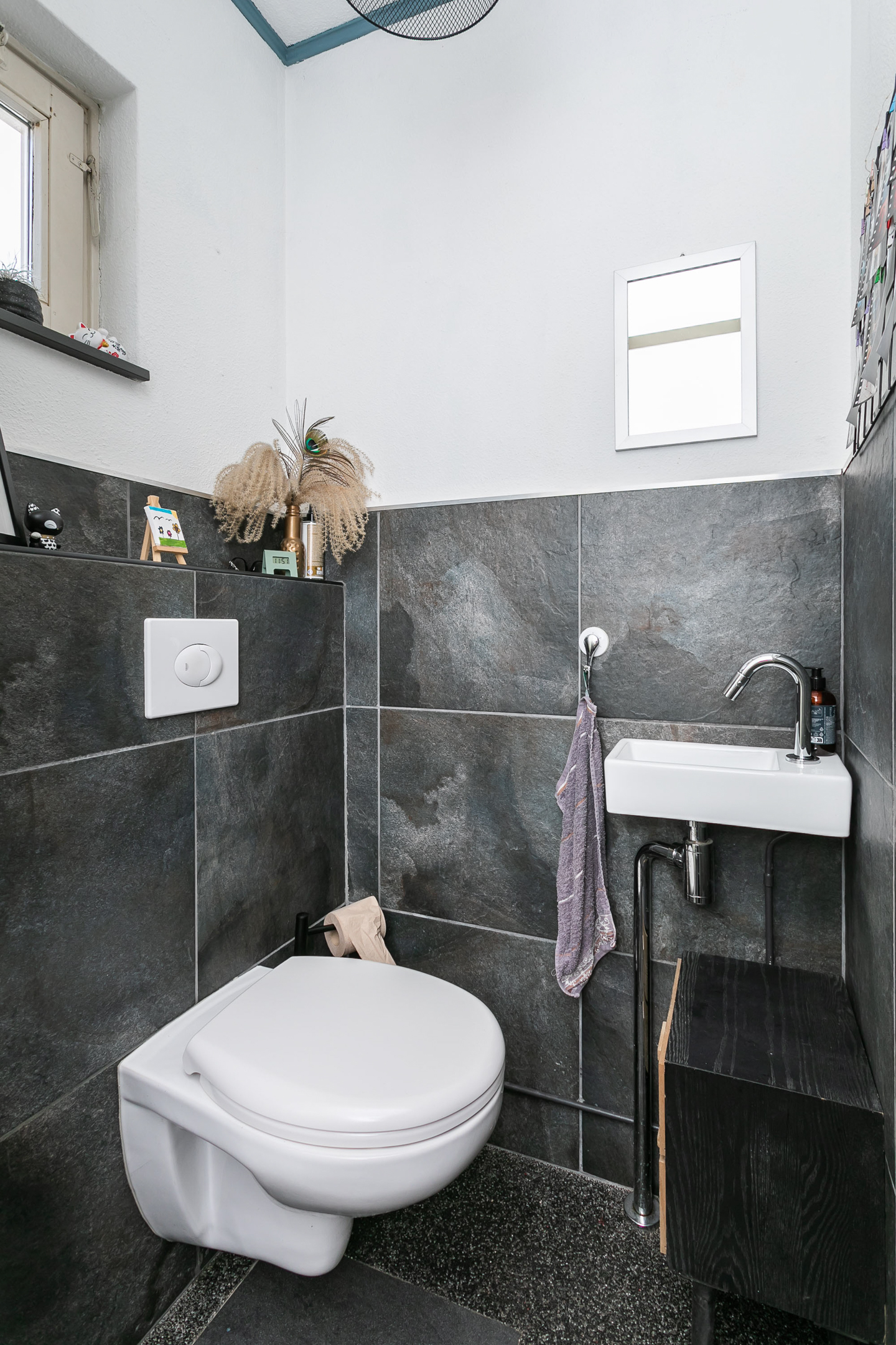 Hal / Entree, garderobehoek en trappenhuis naar de verdieping. Meterkast voorzien van 6 groepsinstallatie / 2x aardlekschakelaar / analoge meters met dag- en nachtstroomaansluiting. Modern afgewerkt, half betegeld, gastentoilet met zwevend wandcloset en fonteintje. Loopdeur naar de woonkamer.