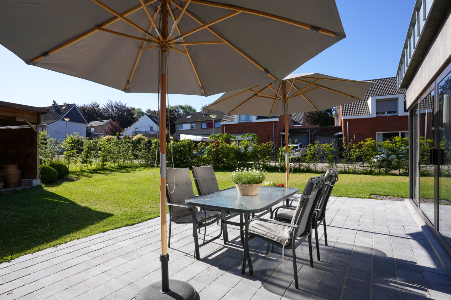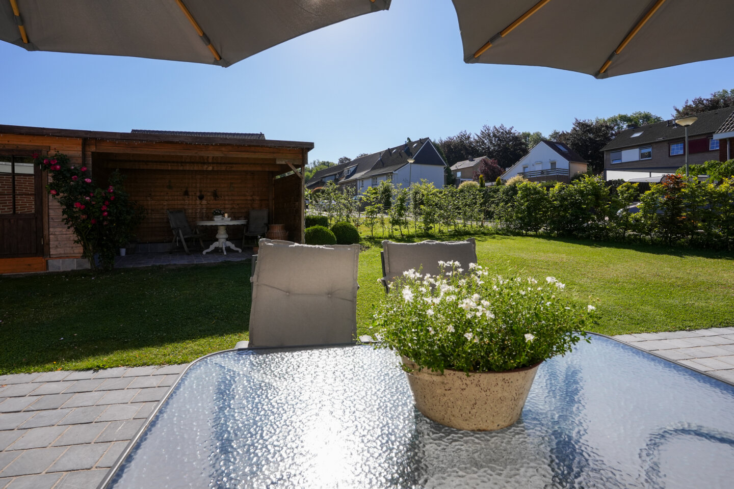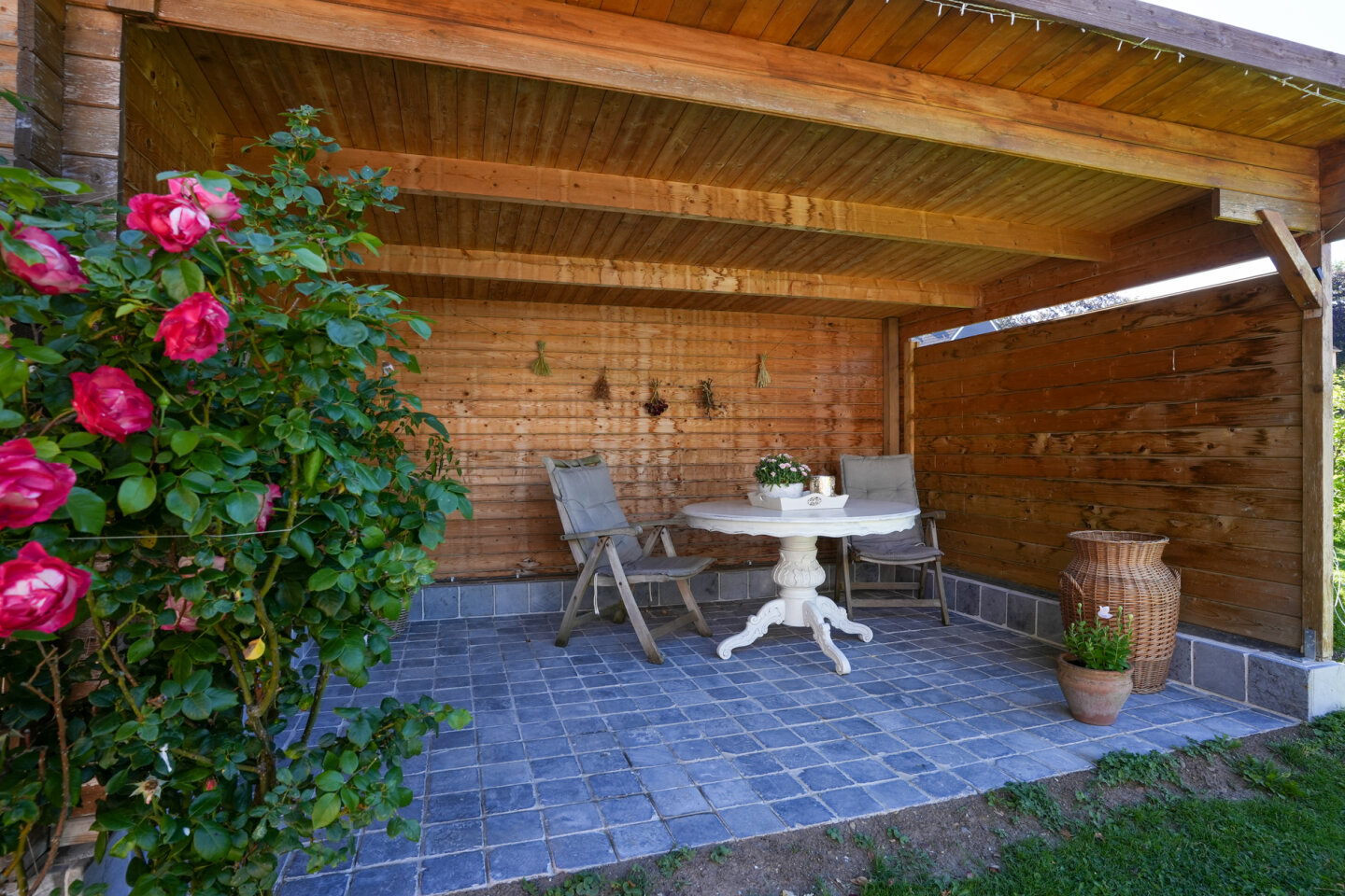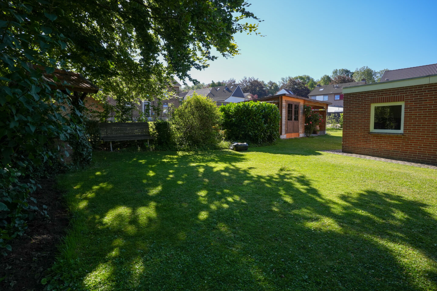 Fraai aangelegde achtertuin gelegen op het Oosten. Houten tuinhuis met overkapping.
