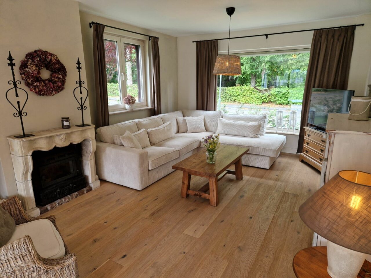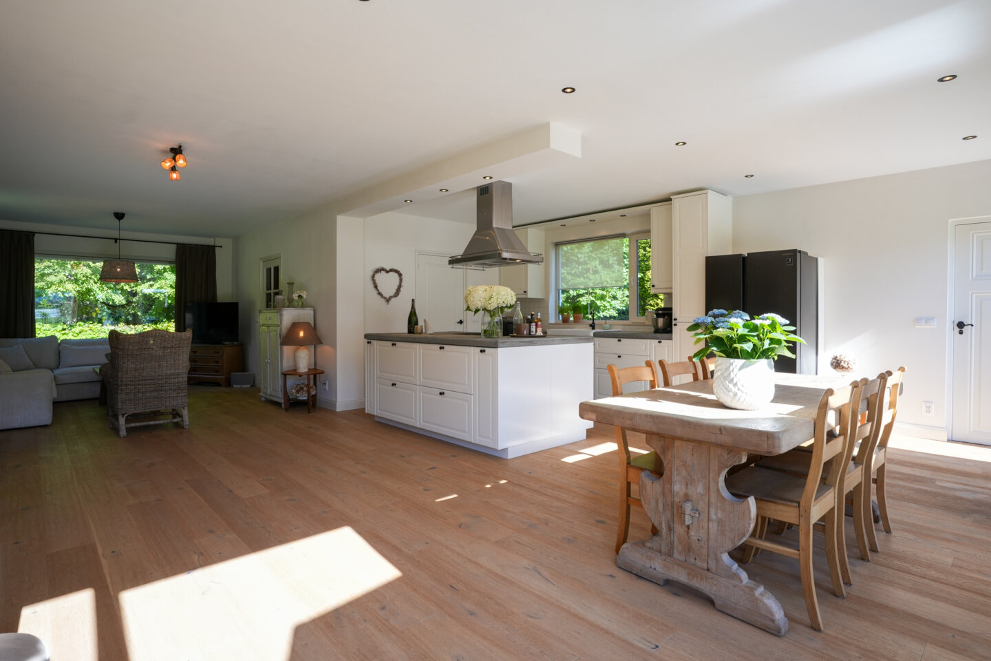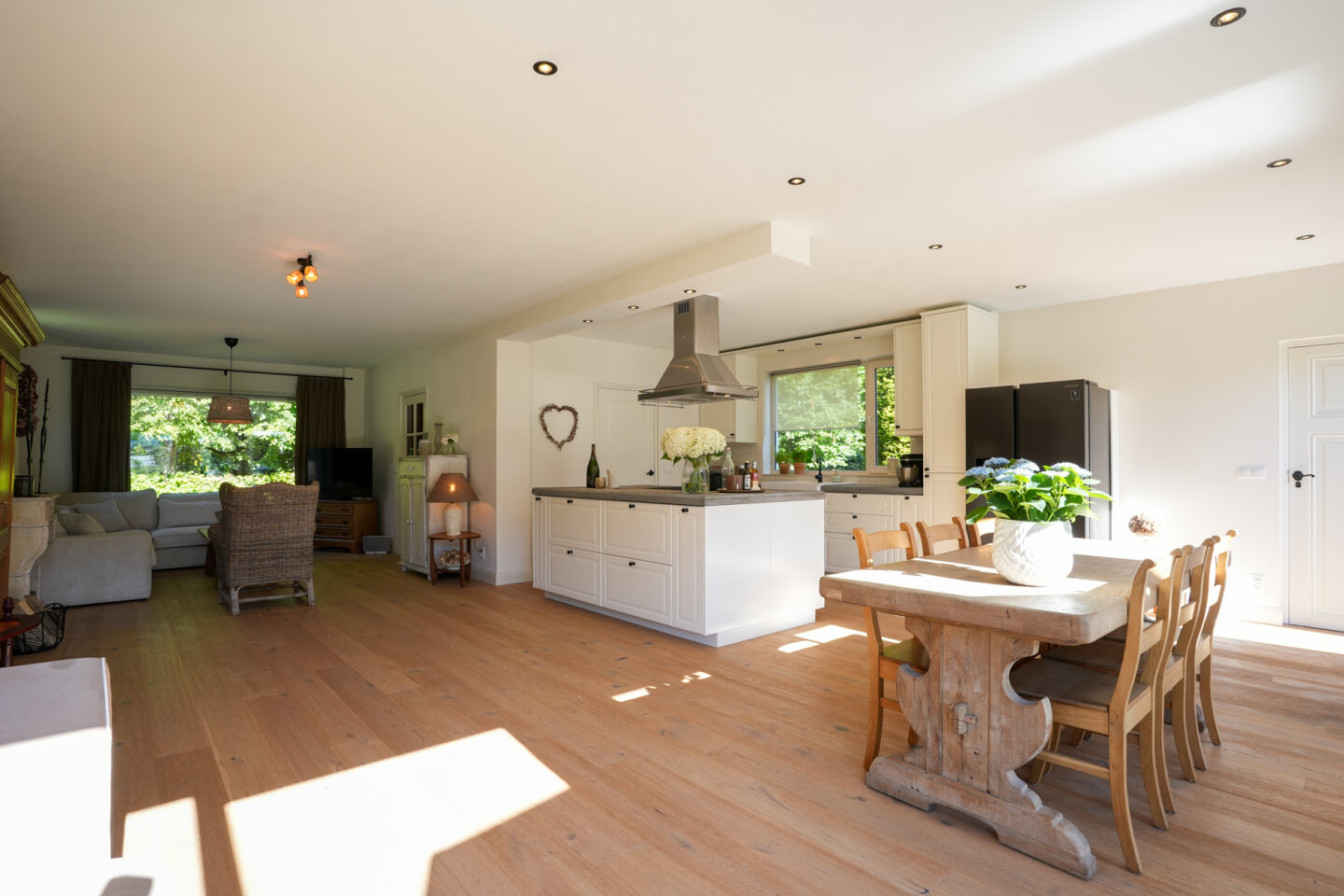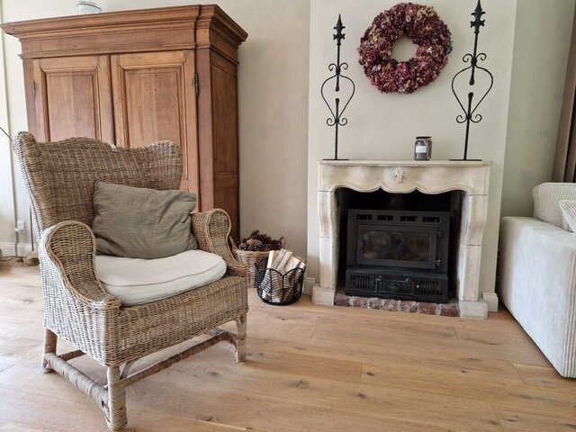 Royale woonkamer met leefkeuken die een totale oppervlakte biedt van 60m2. Sfeervolle woonkamer met houtkachel. De vloer in de woonkamer en keuken is voorzien van een parketvloer met vloerverwarming. Openslaande deuren naar de achtertuin.