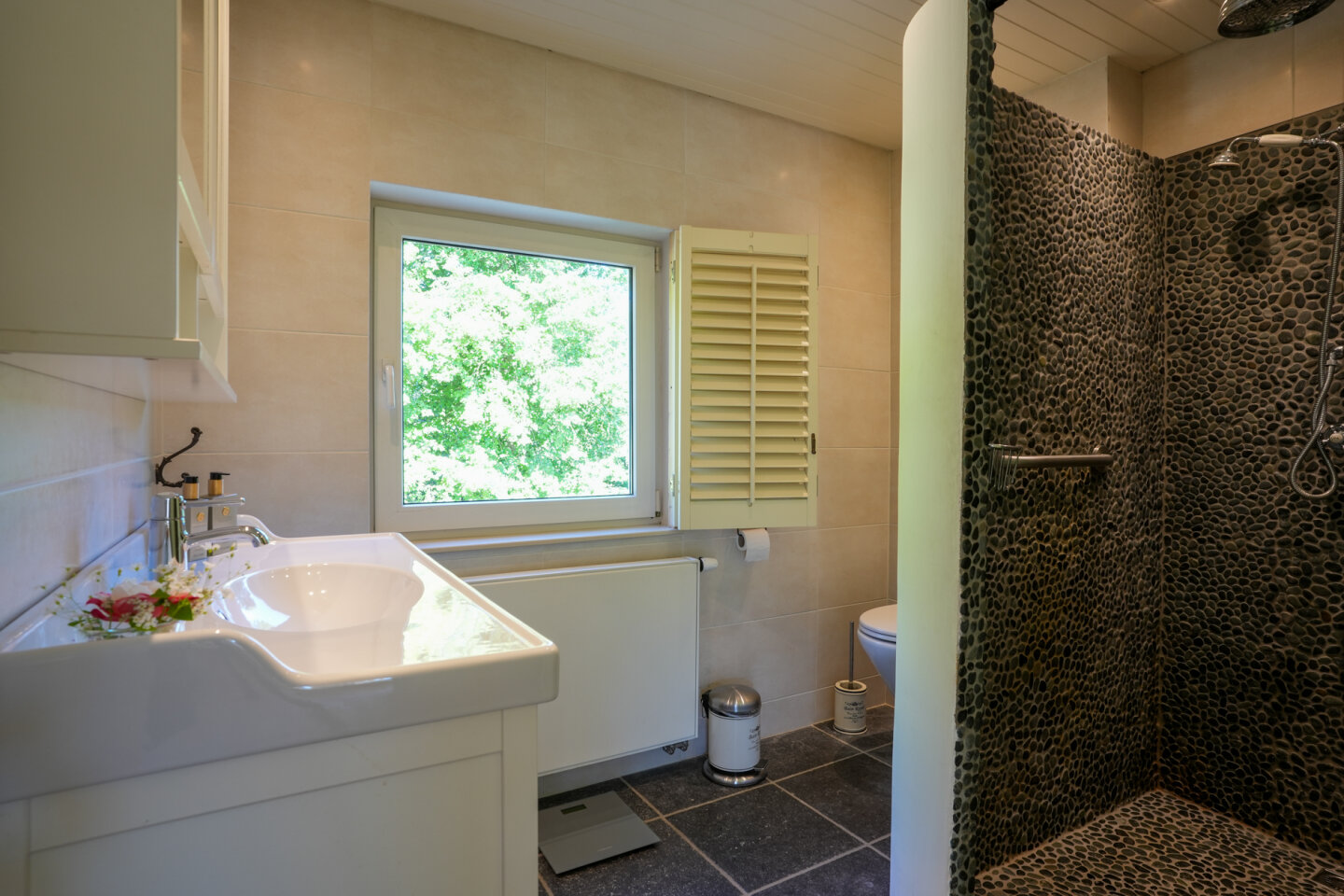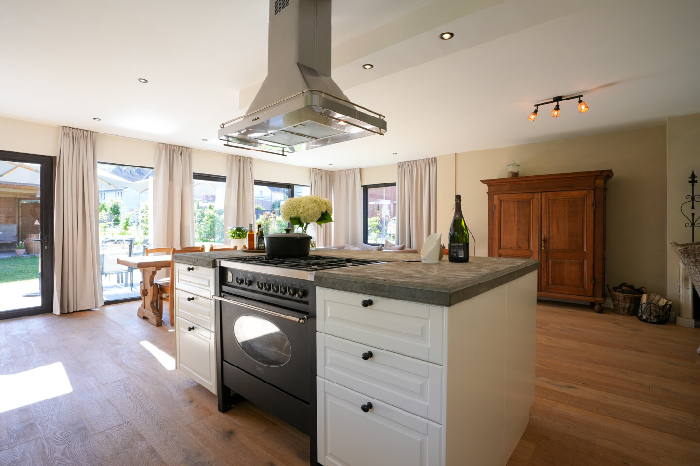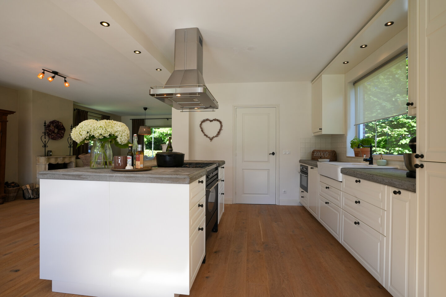 Royale woonkamer met leefkeuken die een totale oppervlakte biedt van 60m2. Sfeervolle woonkamer met houtkachel. De vloer in de woonkamer en keuken is voorzien van een parketvloer met vloerverwarming. Openslaande deuren naar de achtertuin.
