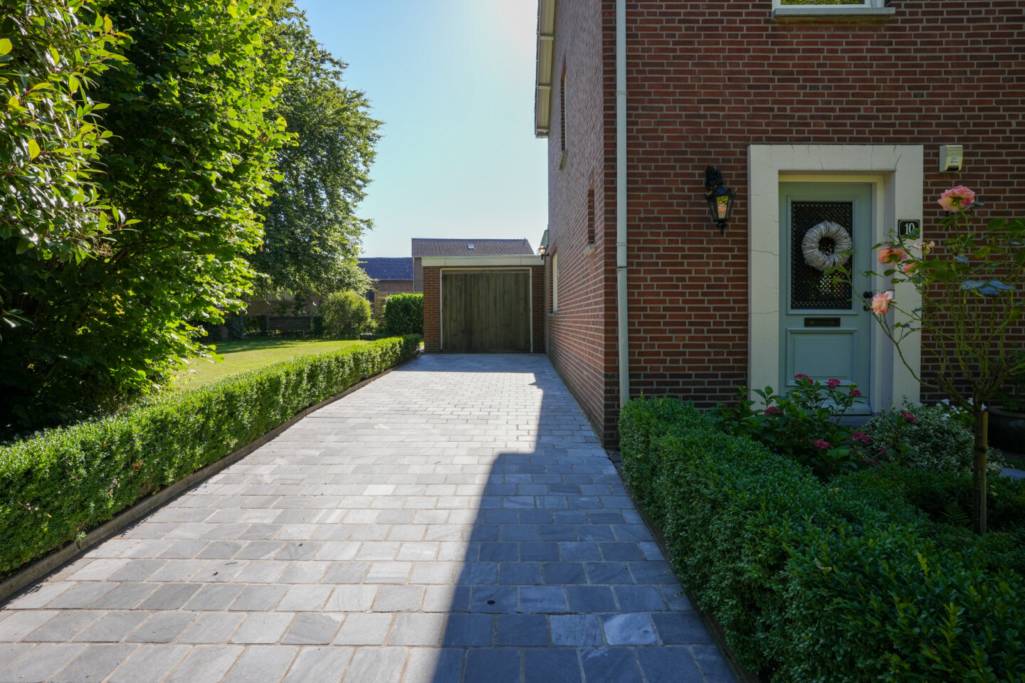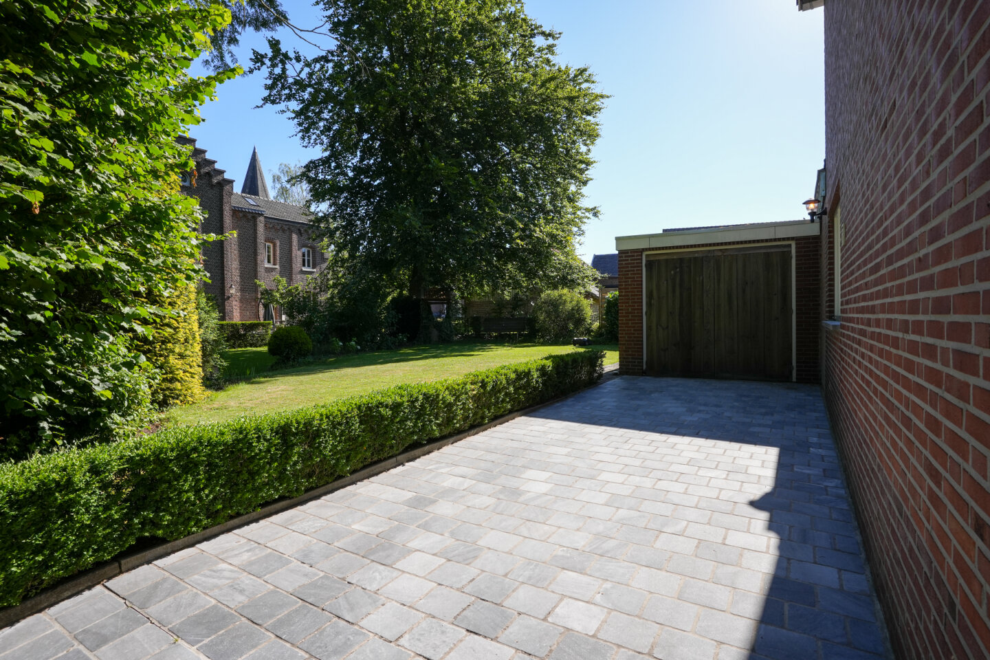 Voor de garage bevindt zich een oprit voor 2 auto's. Terras en oprit vernieuwd en voorzien van getrommelde blauwsteen.