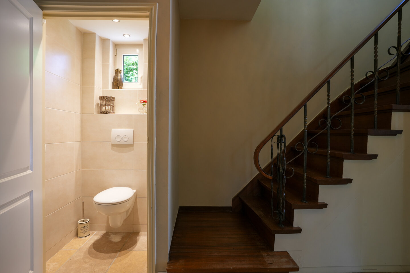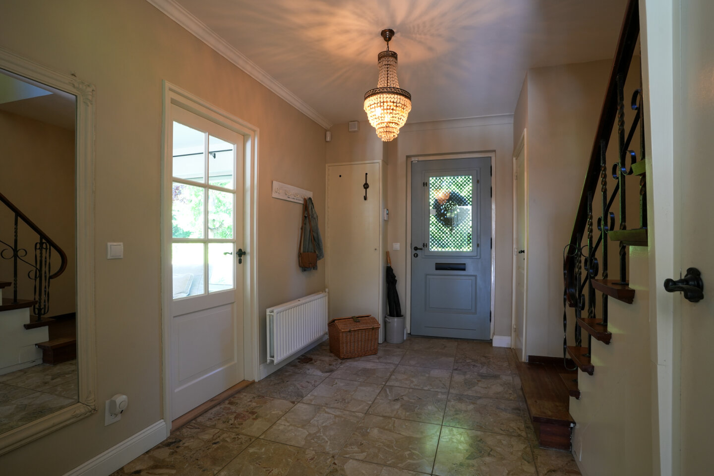 Royale entree met meterkast(vernieuwd) trap naar de eerste verdieping, trapkast en toilet.