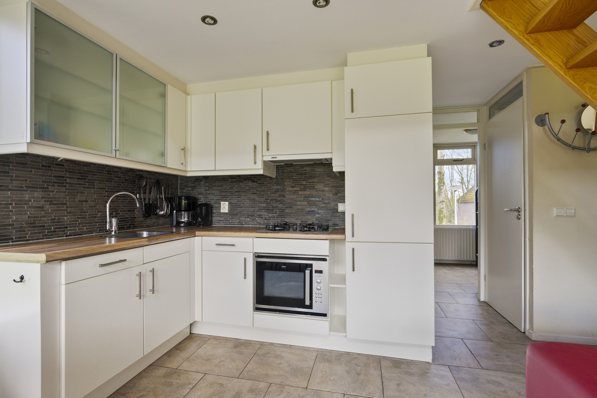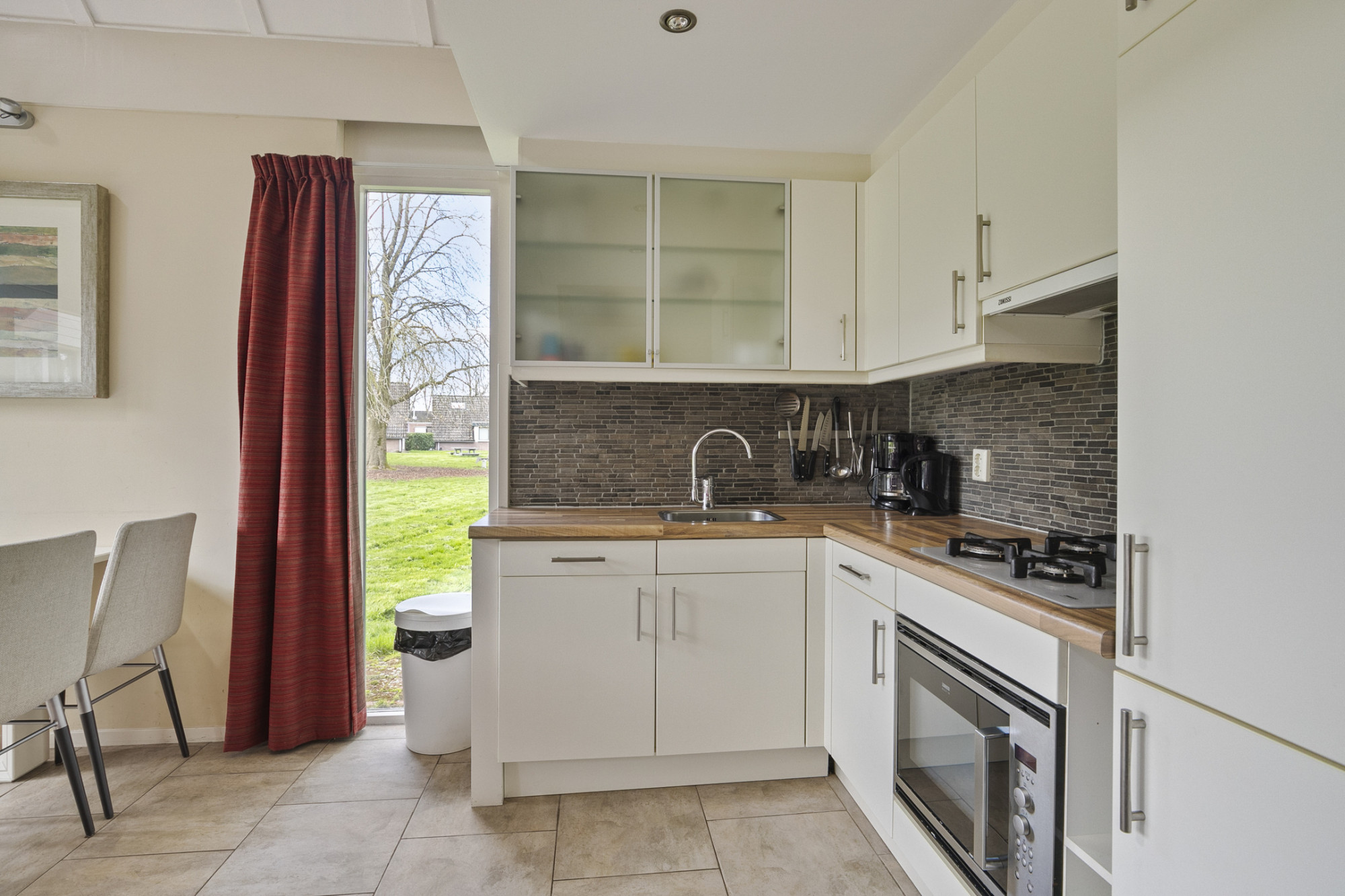 -open keuken in de woonkamer met gascomfort, afzuigkap, magnetron, koelkast met vriesvak.