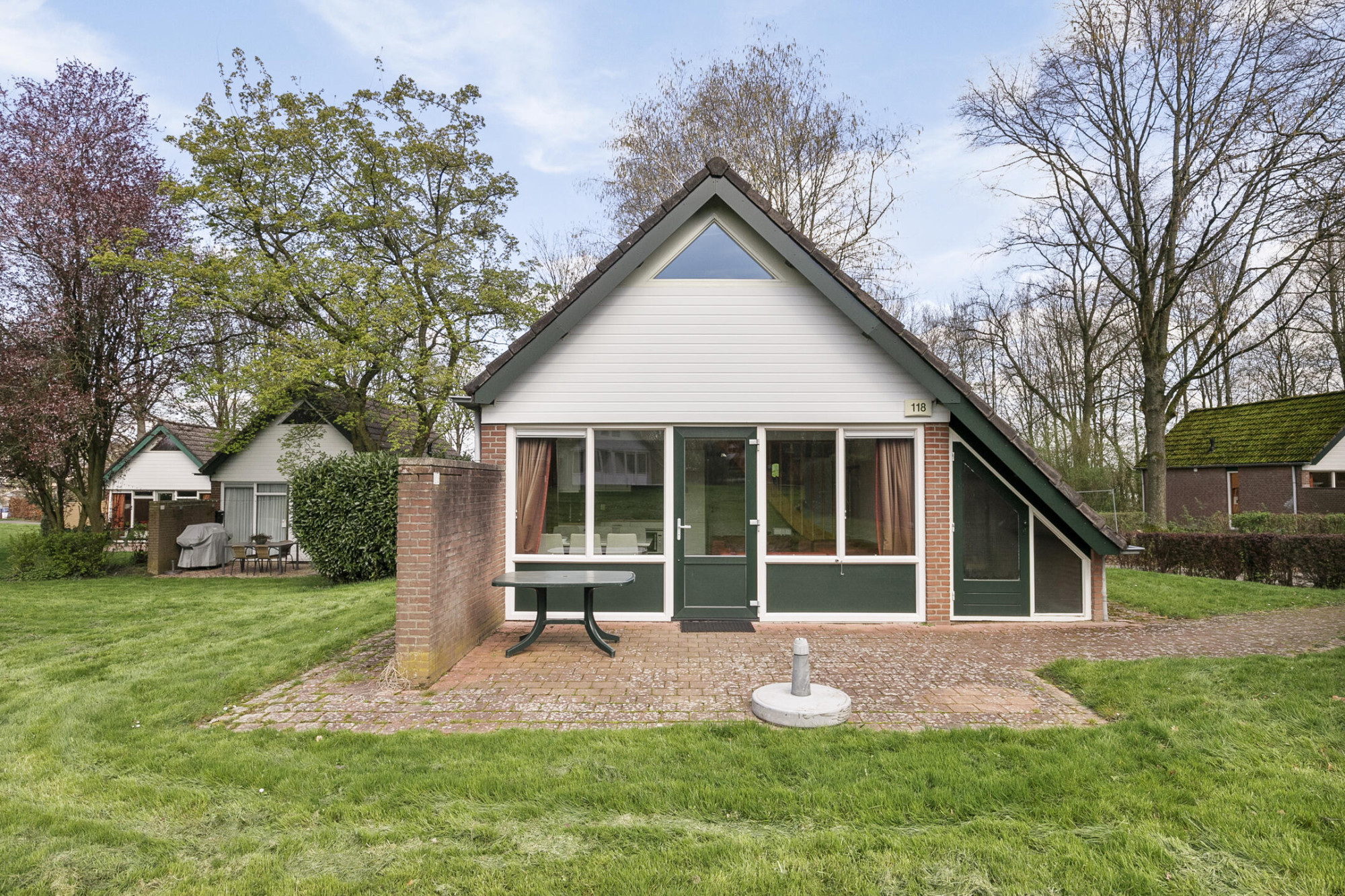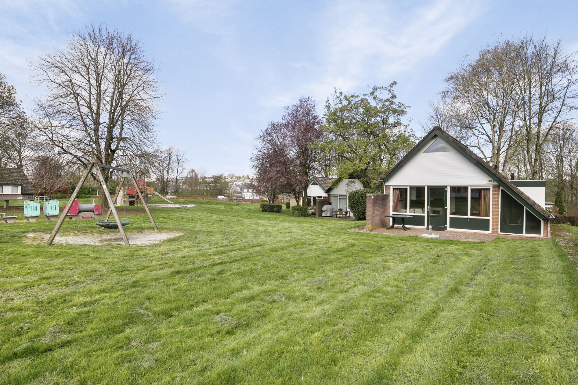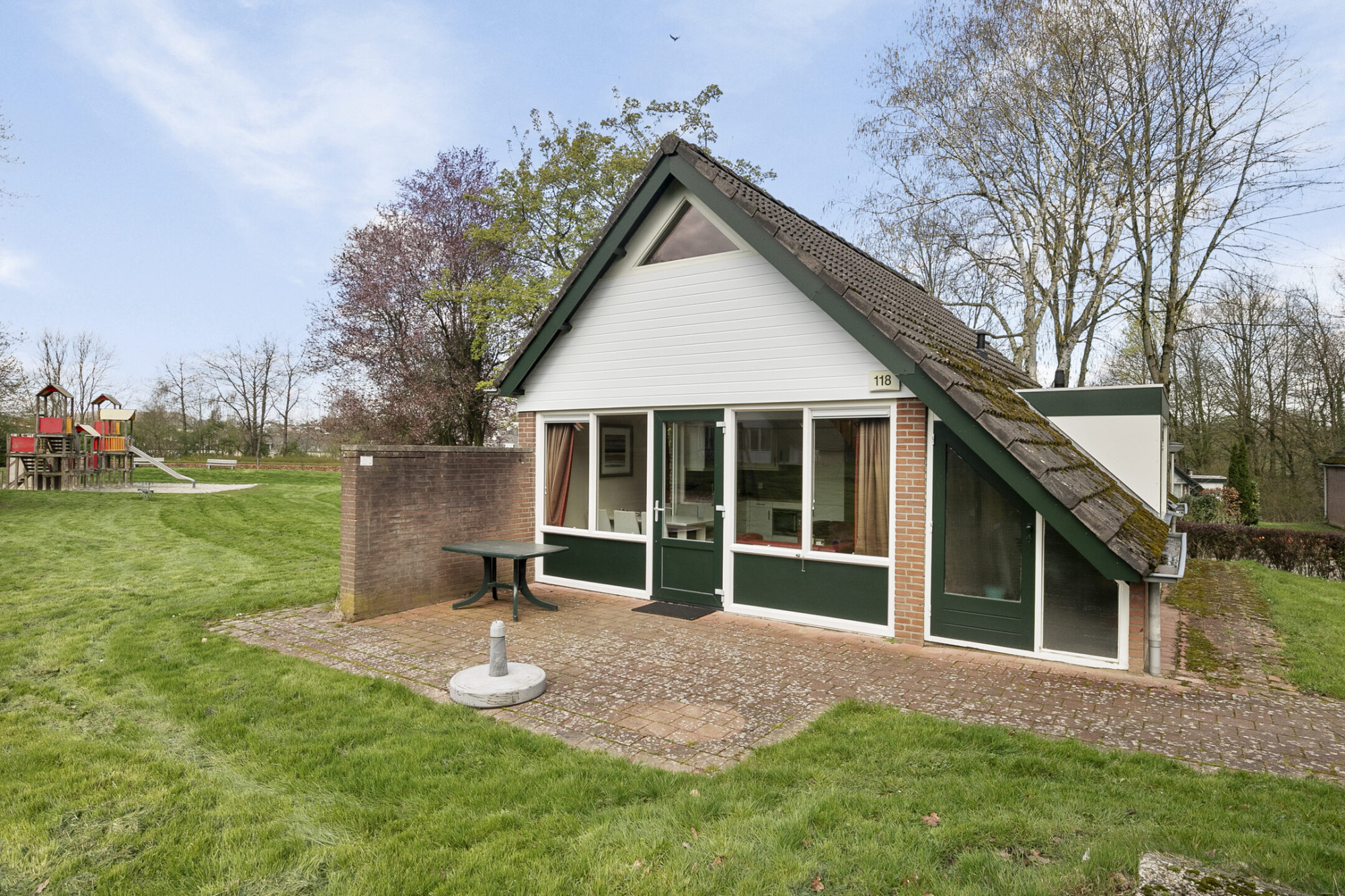 Deze vrijstaande recreatiebungalow nr. 118 met aangrenzend de buitenberging, terras en tuin. Het betreft een 6 persoonsbungalow van het type Delta en gelegen op het rustige gedeelte van het park met vrij uitzicht op het grote grasveld.