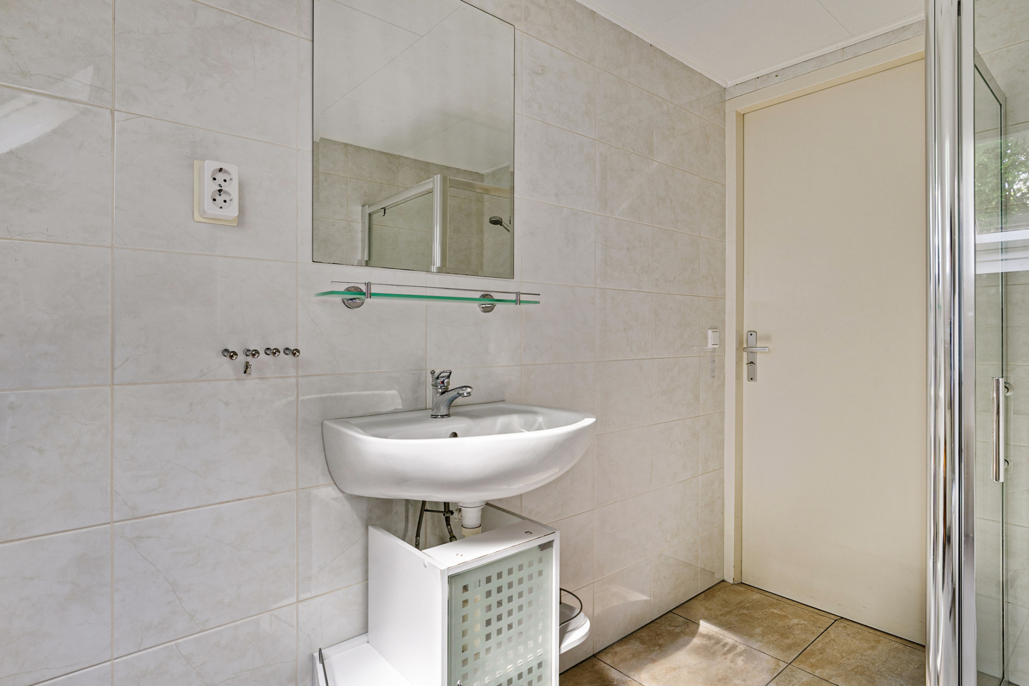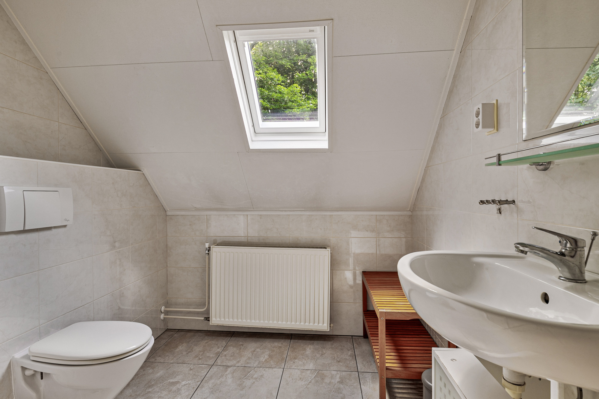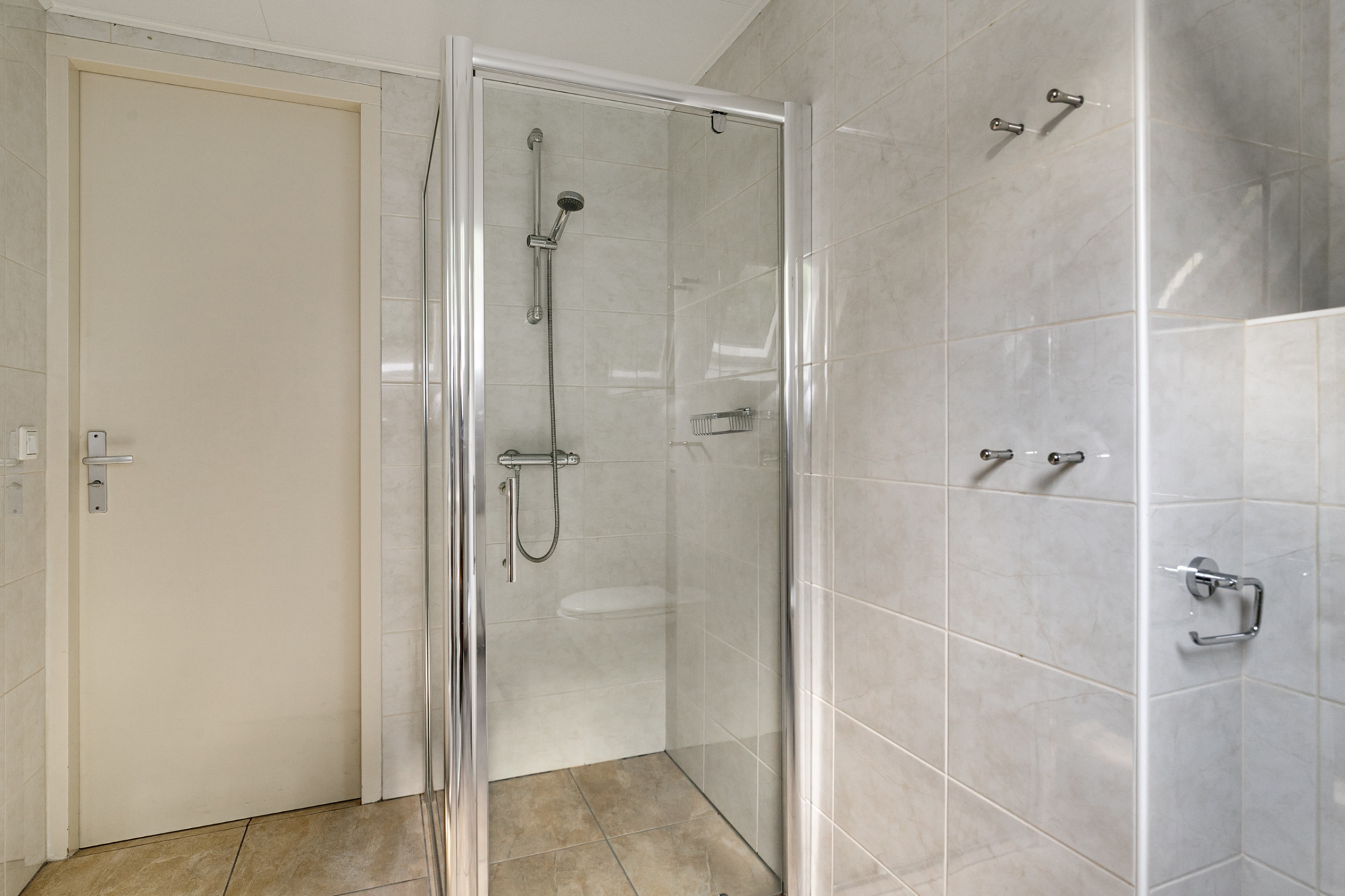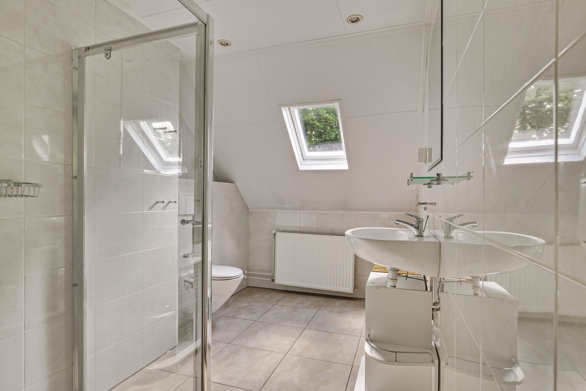 -gerenoveerde ruime badkamer met inloopdouche, toilet en vaste wastafel.