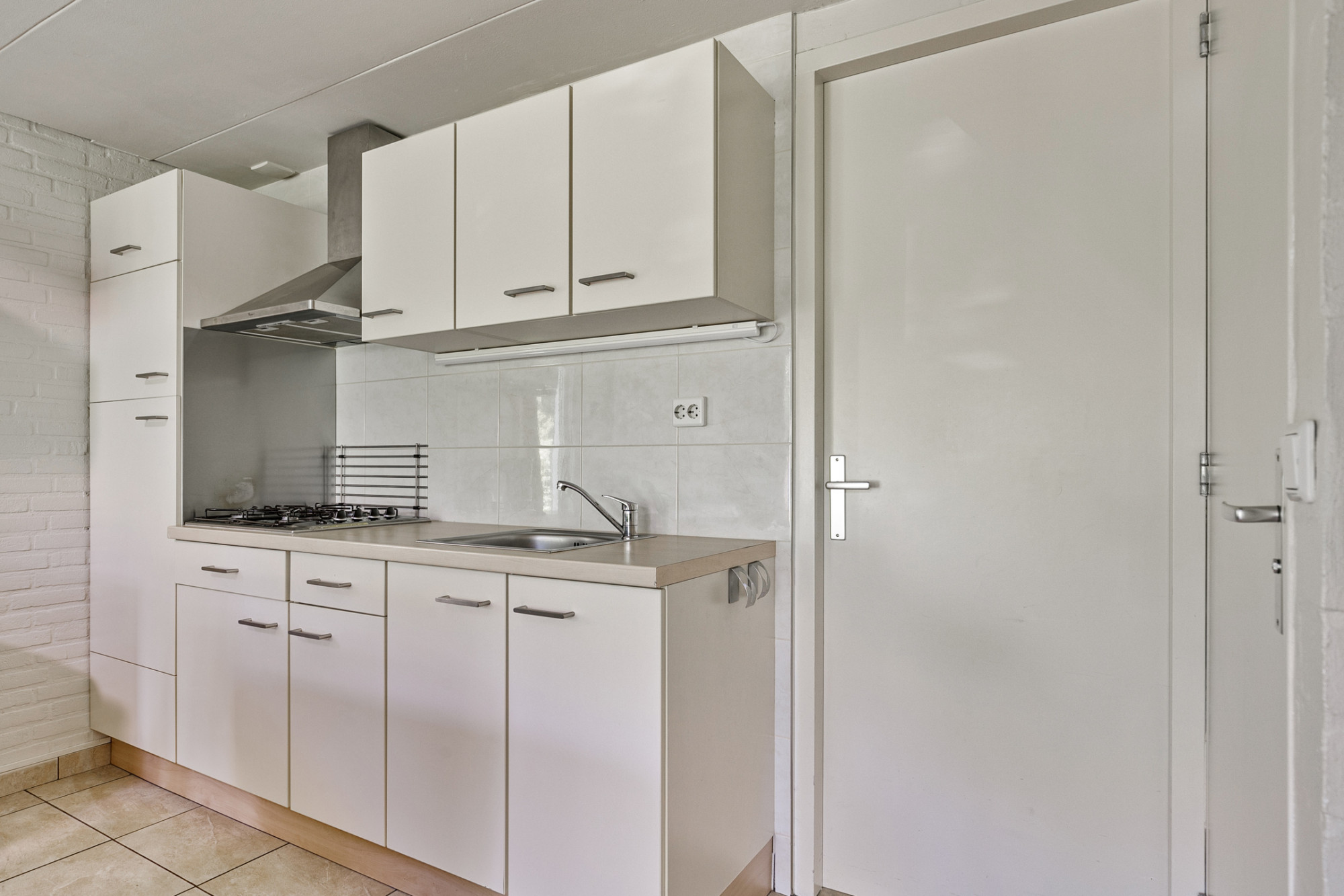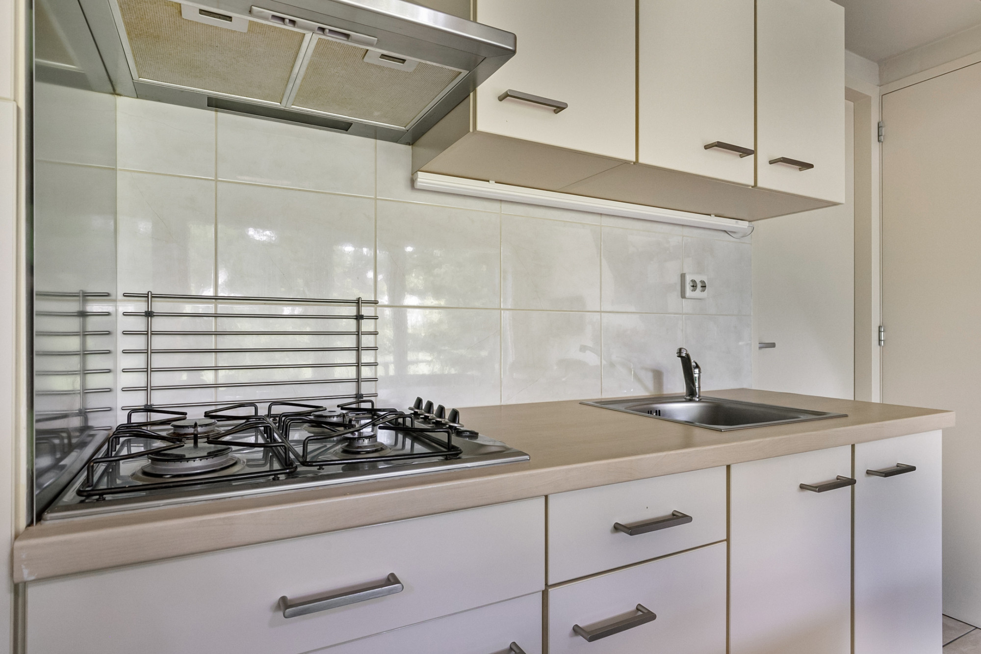 -open keuken in de woonkamer met gascomfort, afzuigkap, magnetron, koelkast met vriesvak.