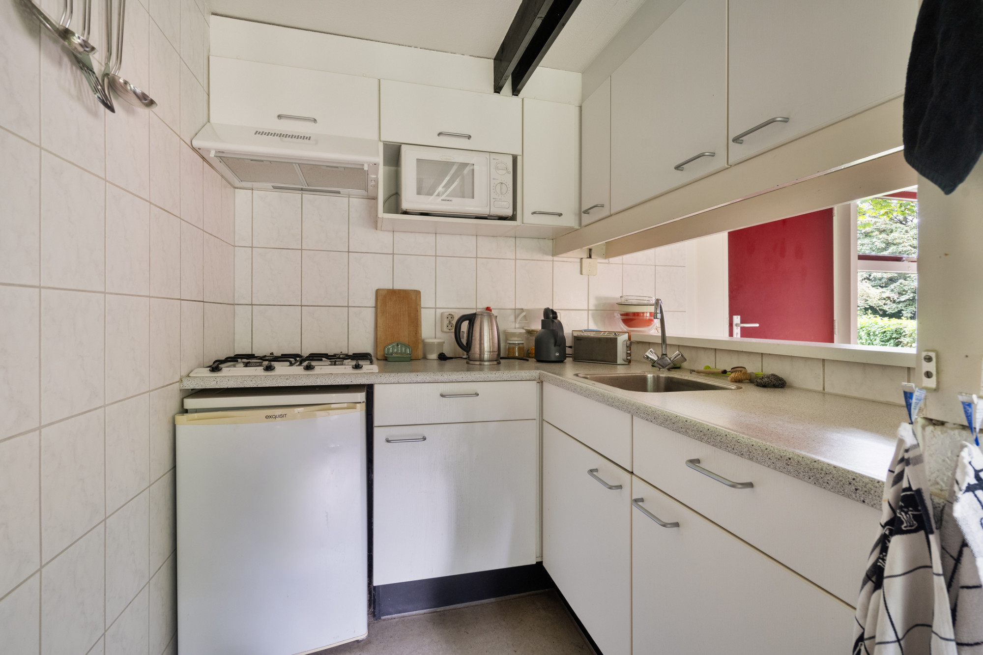 De open keuken is voorzien van de volgende apparatuur: gaskookplaat, afzuigkap, koelkast met vriesvak en magnetron.