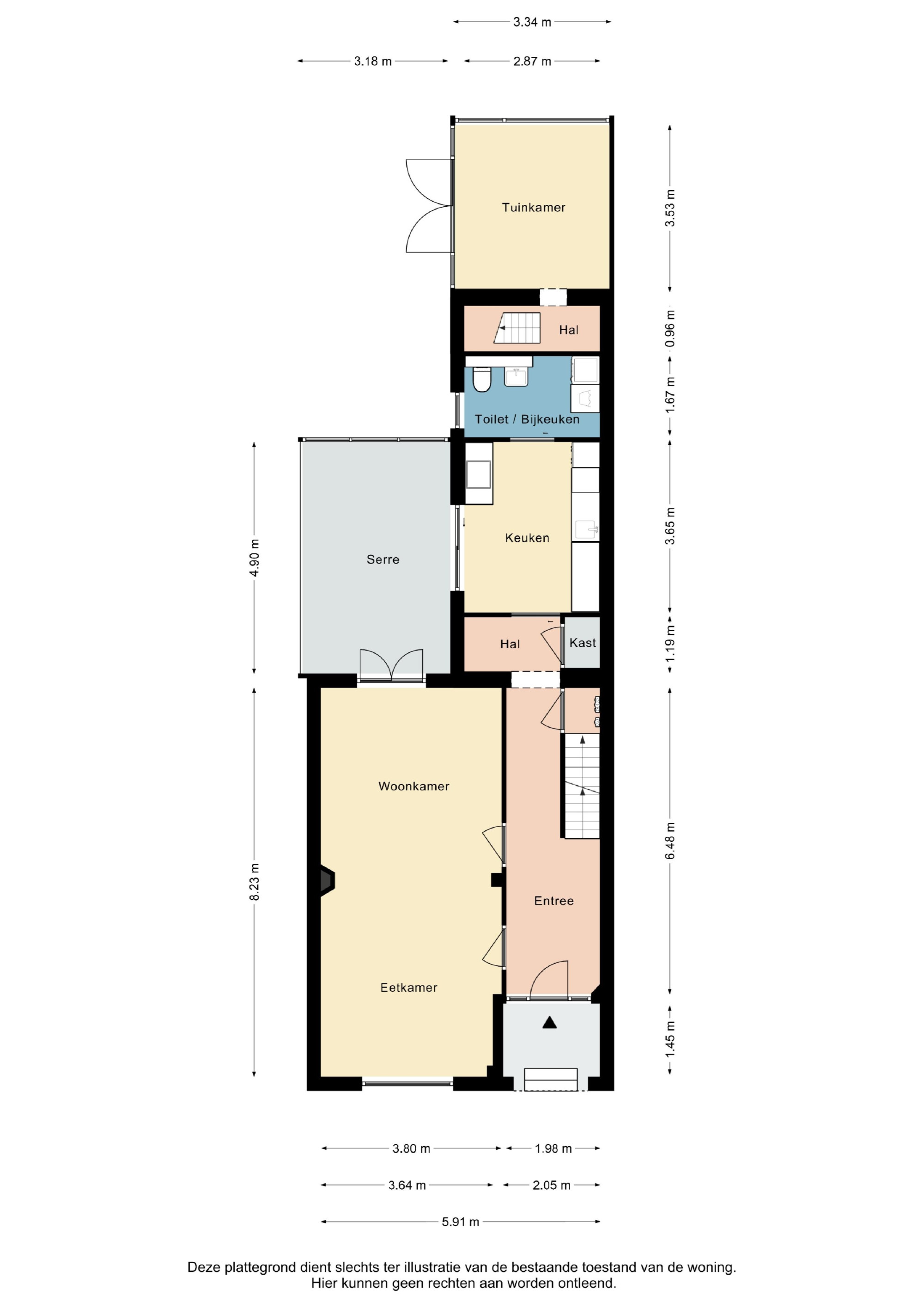 Ruime hal met trap naar 1e verdieping en toegang naar de woon/ eetkamer. Vanuit de hal is de moderne half open keuken bereikbaar. Deze is voorzien van alle noodzakelijke inbouwapparatuur en Amerikaanse koelkast. De ruime glazen serre met veel lichtinval welke optimaal tuincomfort biedt is zowel vanuit de woonkamer als keuken te bereiken. Naast de keuken is de wasruimte met toilet en wastafel gelegen.