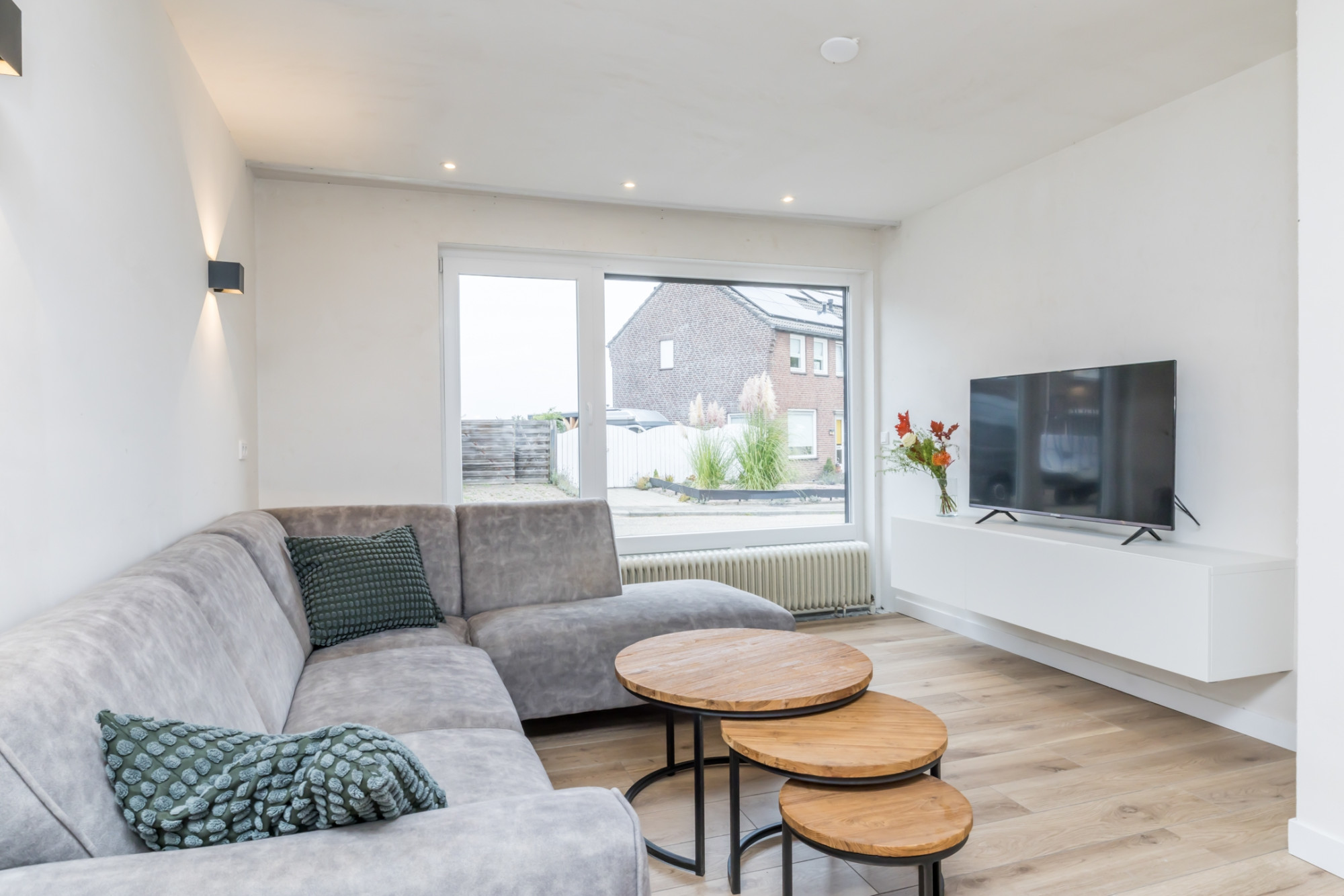 Vanuit deze ruimte kom je in de ruime lichte woonkamer voorzien van een aanbouw met open keuken uit 2024 voorzien van alle noodzakelijk inbouwapparatuur.