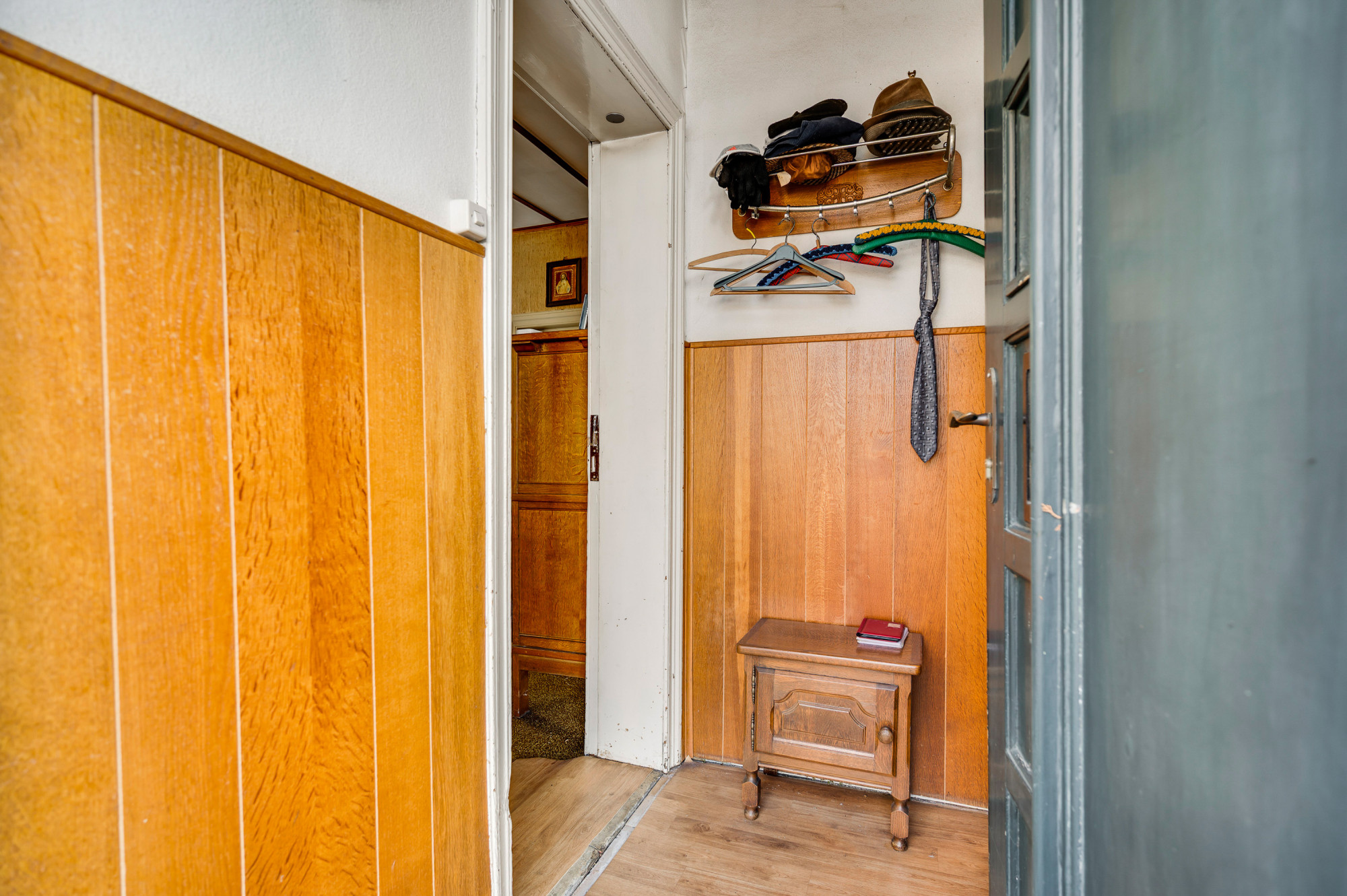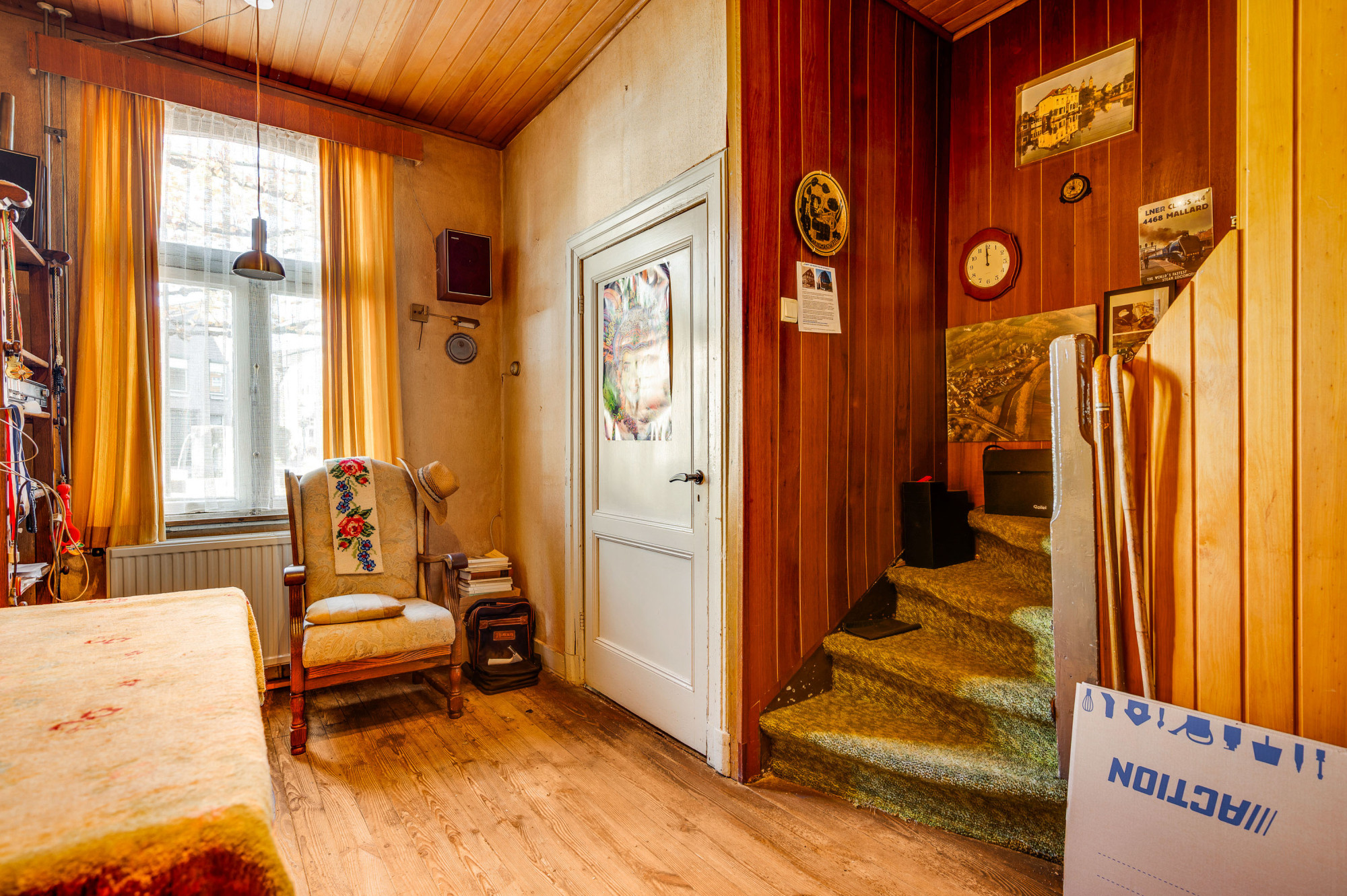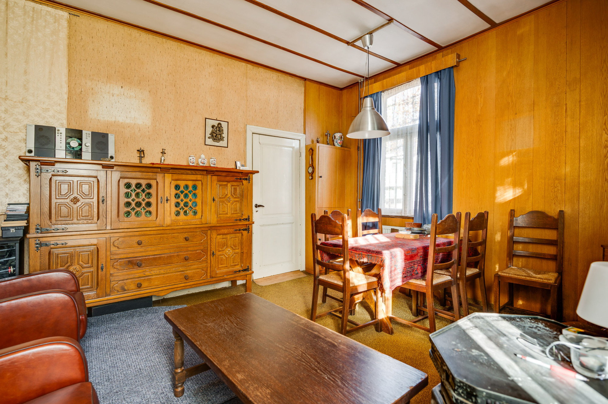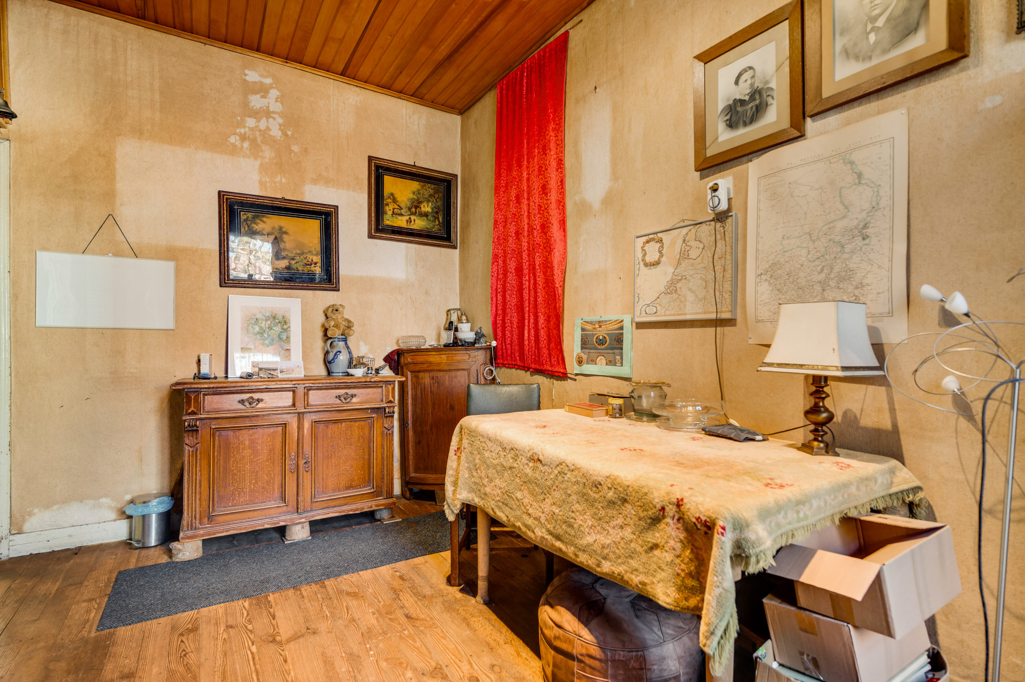 De hal geeft toegang tot de eetkamer en de woonkamer met meterkast. De woonkamer kent veel lichtinval en beschikt over authentieke details zoals een fraaie schouw met houtkachel en paneeldeuren. Verder is er heel praktisch een gelijkvloerse 1e slaap/hobbykamer aanwezig; ook te gebruiken als een speelkamer of thuiswerkplek. De keuken is voorzien van een eenvoudige combinatie met opstelling van boiler (Daalderop) en een loopdeur naar de diepe achtertuin. Vanuit de keuken is tevens via een portaal de toiletruimte met staand toilet toegankelijk, de badkamer met douche en een berging/bijkeuken en de inpandige garage te bereiken. Aangrenzend aan de keuken bevindt zich de eetkamer met trapopgang naar de eerste verdieping en een deur naar de praktische provisiekelder.