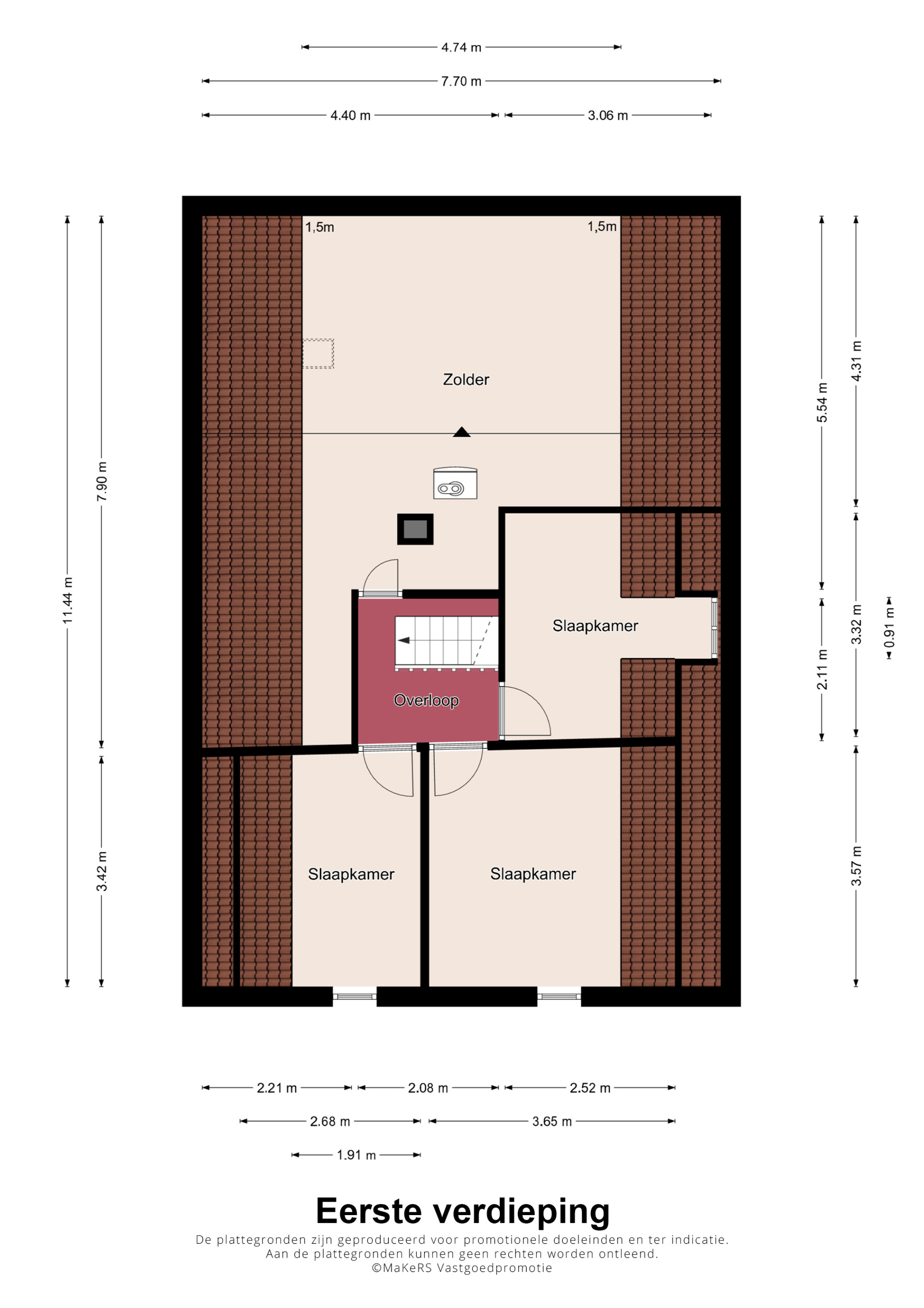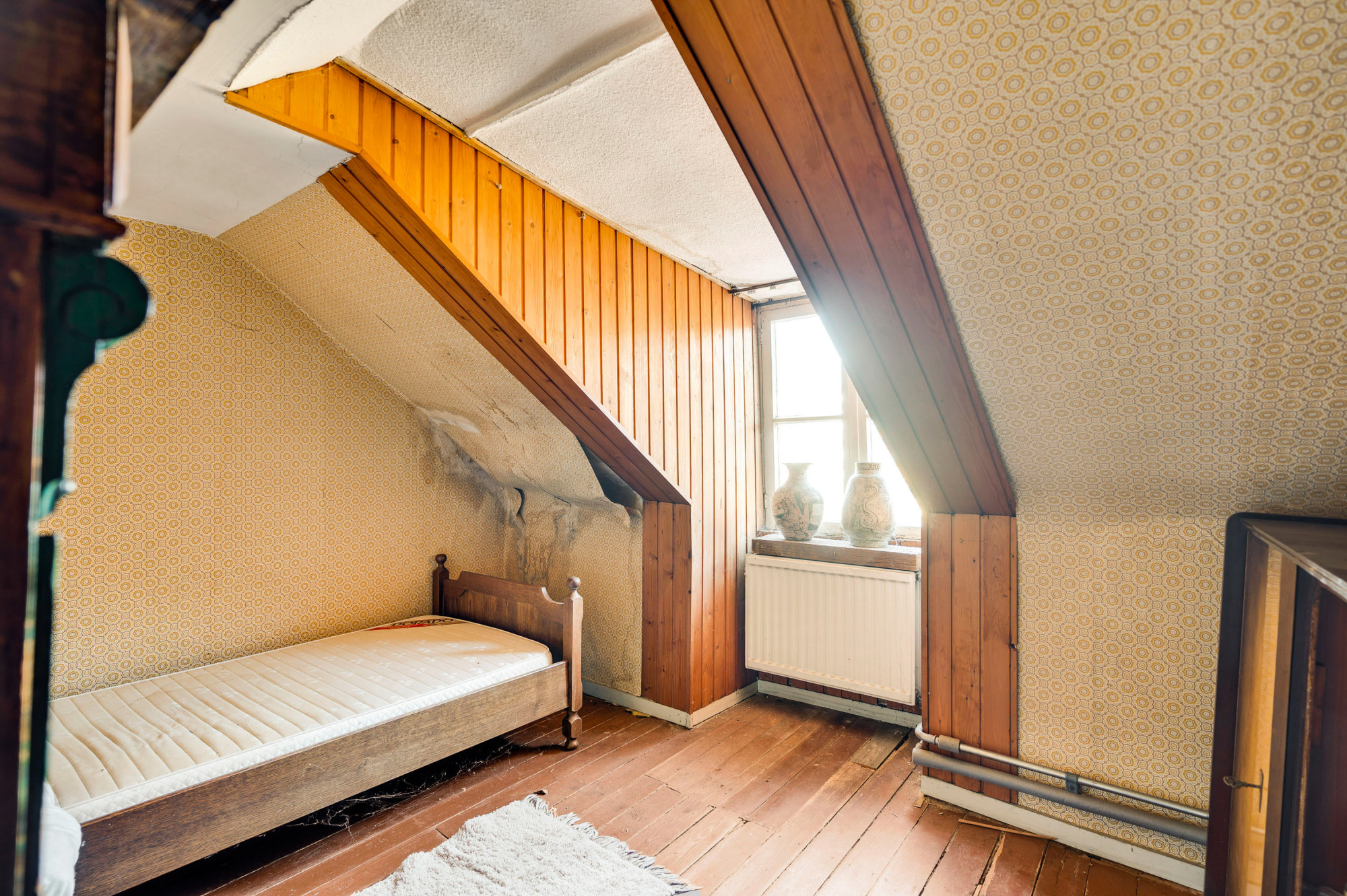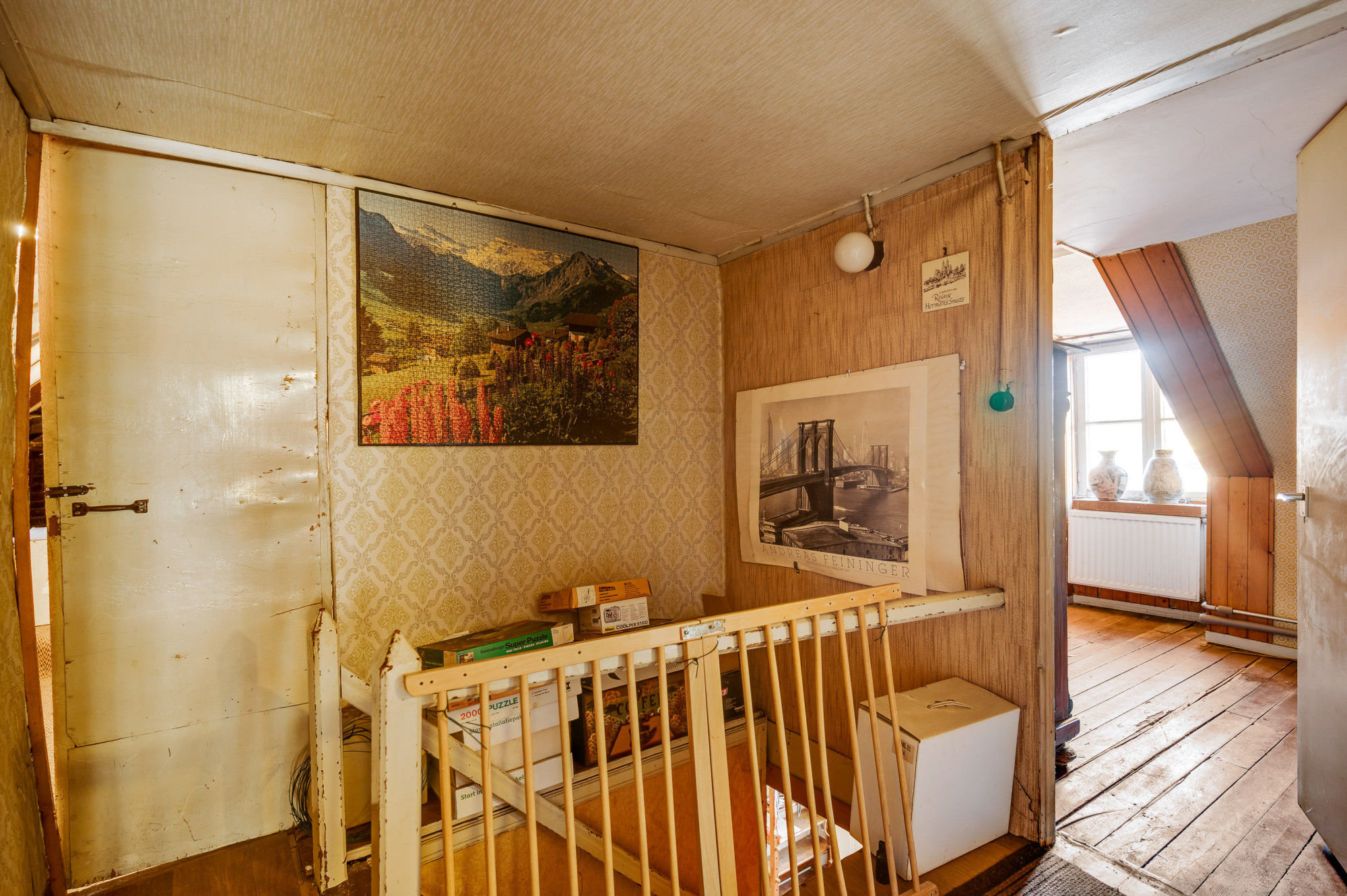 Via de overloop zijn de 3 riante slaapkamers en de zolderruimte toegankelijk. Op de zolderruimte is de opstelling voor de cv-ketel (Intergas CR, 1975, Eigendom). De ruime zolderruimte is ideaal voor het realiseren van extra kamers.
