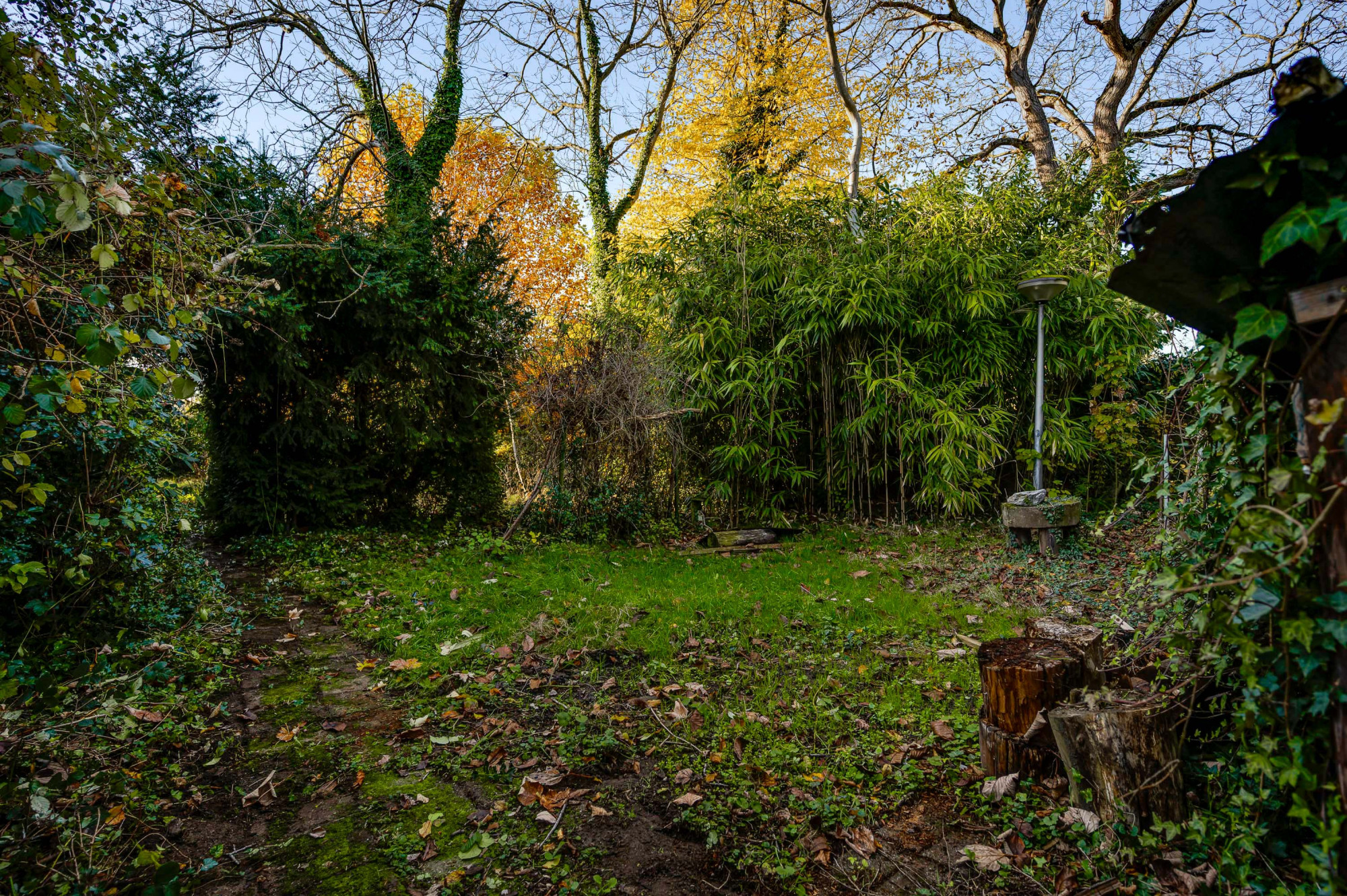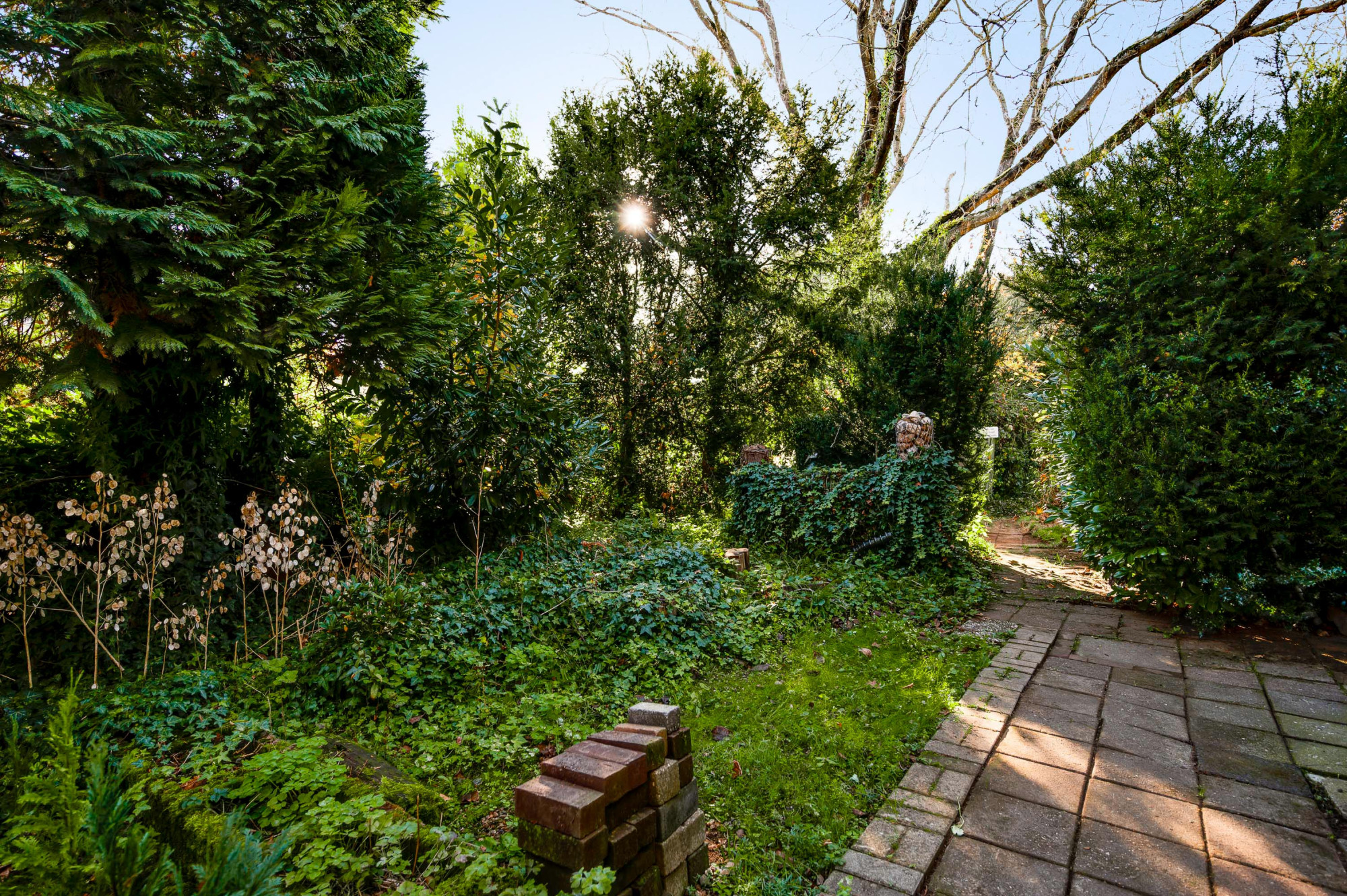 Naast de woning is de oprit en een vrije achterom naar de berging en de achtertuin, die op het zuidwesten is gericht. De tuin heeft een gazon en een ruim terras. Borders geven het geheel een levendig en sfeervol karakter. Achterin de tuin is een bospartij, die zowel voor de bewoners als voor de dieren een natuurlijke oase biedt. Het geheel ademt rust, ruimte, natuur en biedt volop mogelijkheden voor buitenactiviteiten en ontspanning.