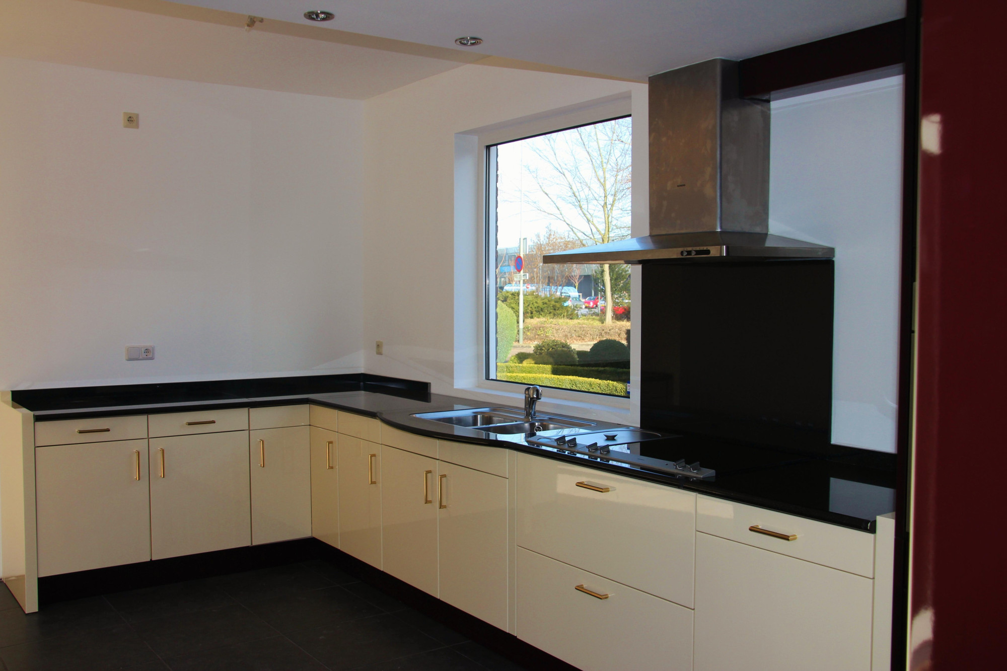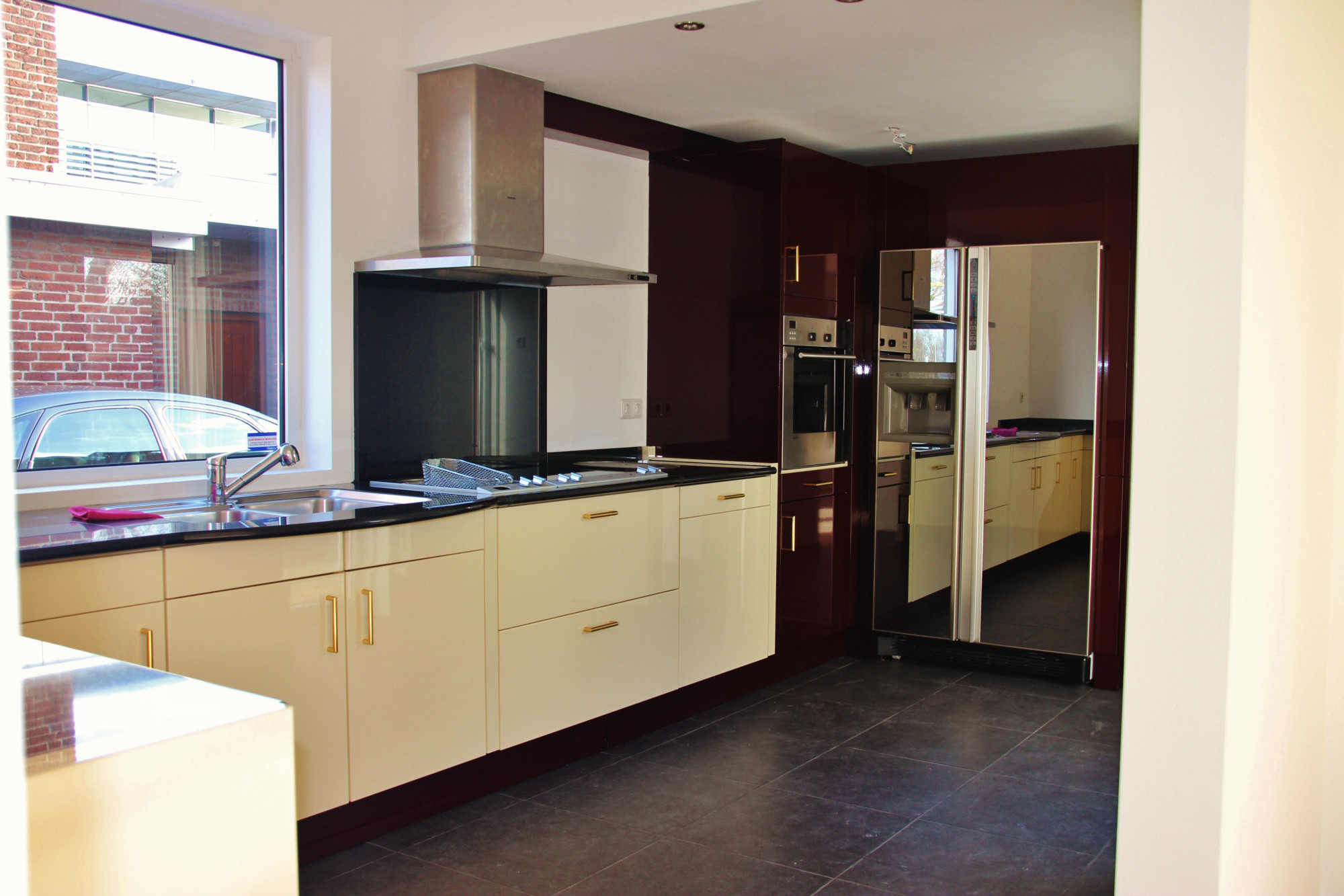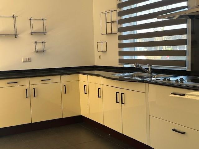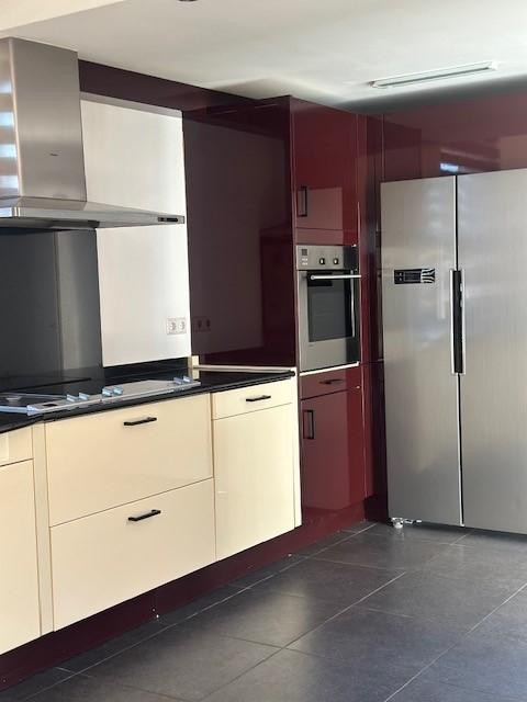 - Moderne halfopen keuken (4,20 mx 2,60 m) met tegelvloer en een hoogglans tweekleurige afwerking. De keuken is voorzien van een granieten werkblad, vaatwasser, Amerikaanse koel-/vriescombinatie, oven, elektrische kookplaat met praktische friteuse, afzuigkap, spoelbak met aparte boiler en een designradiator.