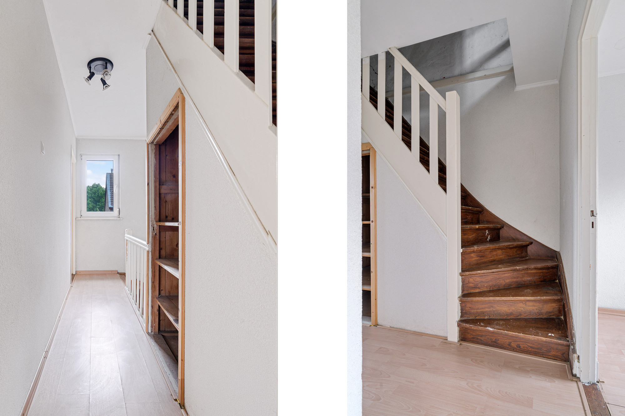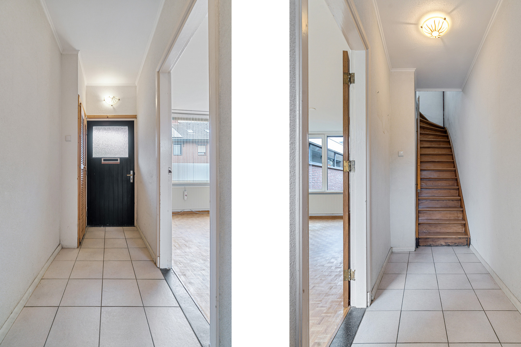 Je komt binnen in een betegelde hal met aan de rechterzijde de meterkast en aan de linkerzijde de toegang tot de woonkamer. De hal biedt ook toegang tot de trap naar de eerste verdieping.
