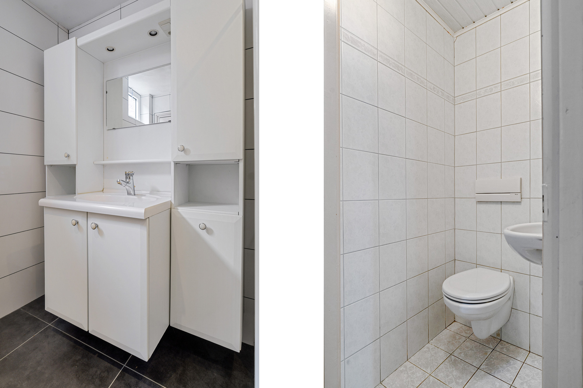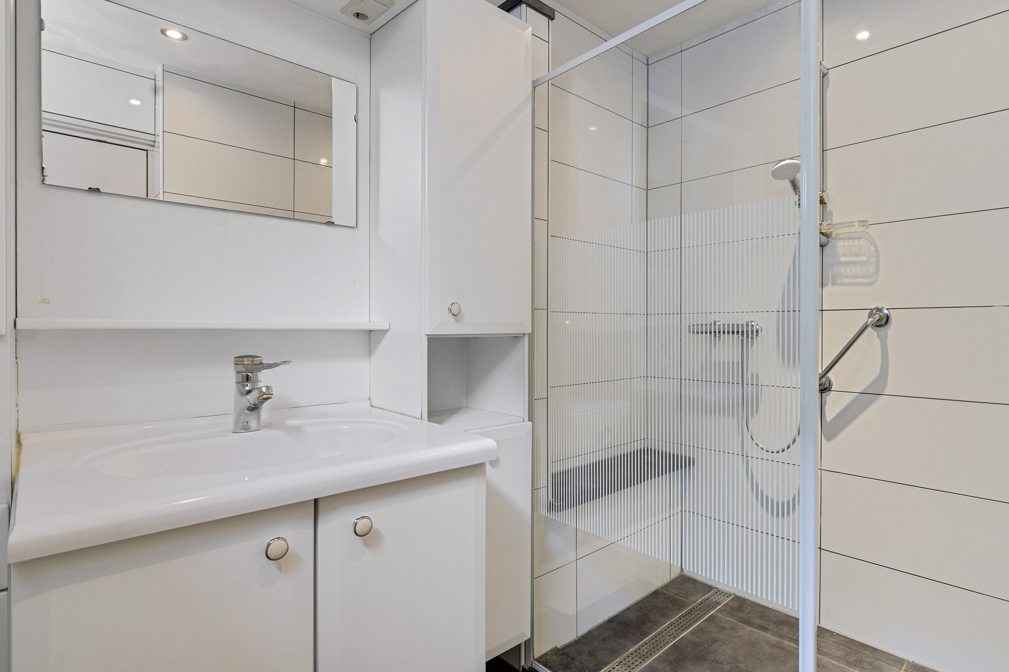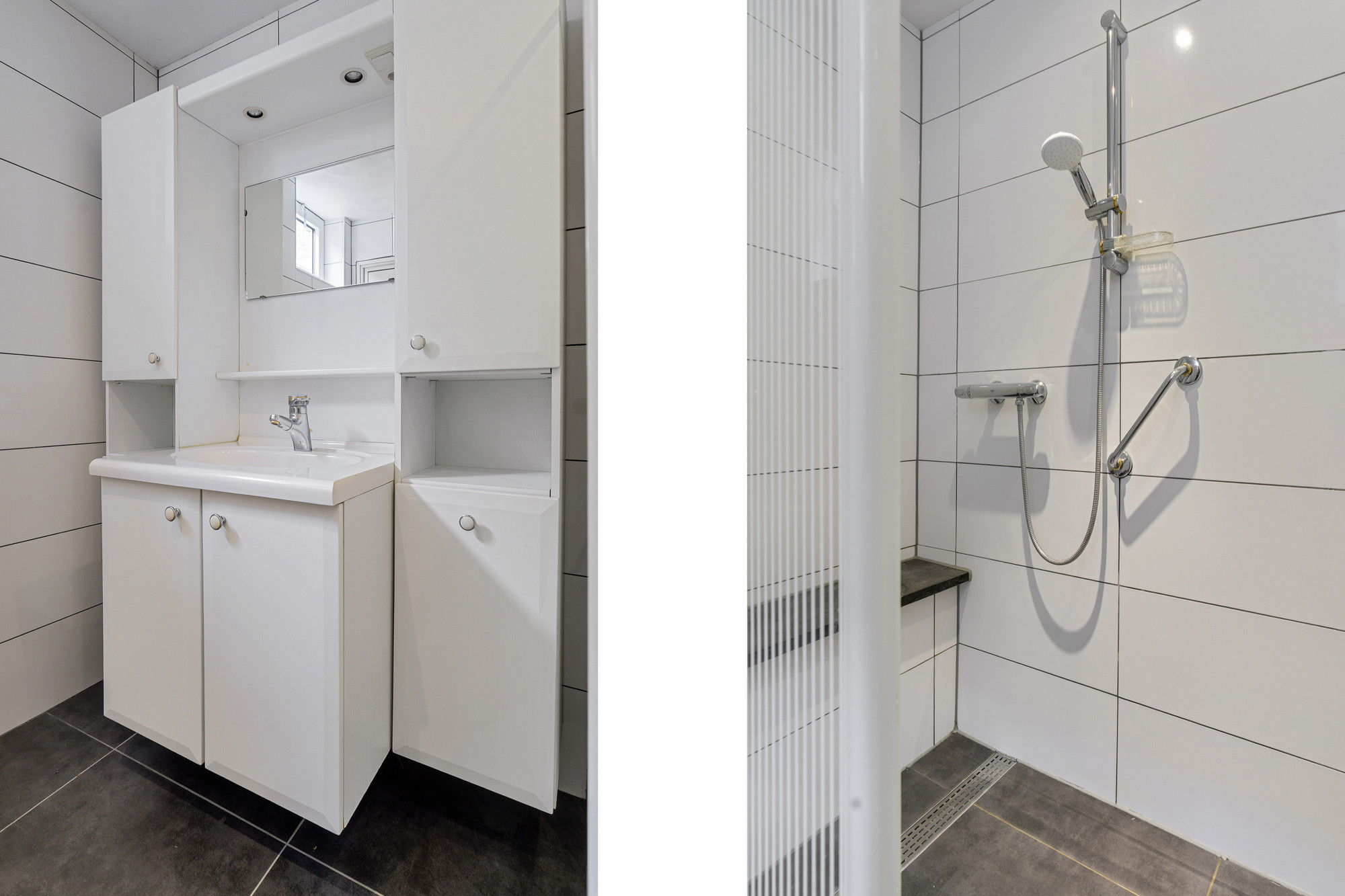 De badkamer is volledig betegeld en uitgerust met een inloopdouche met zitgedeelte, een wastafelmeubel en een handdoekradiator. Praktisch en ruim van opzet – alles wat je nodig hebt op de begane grond.
