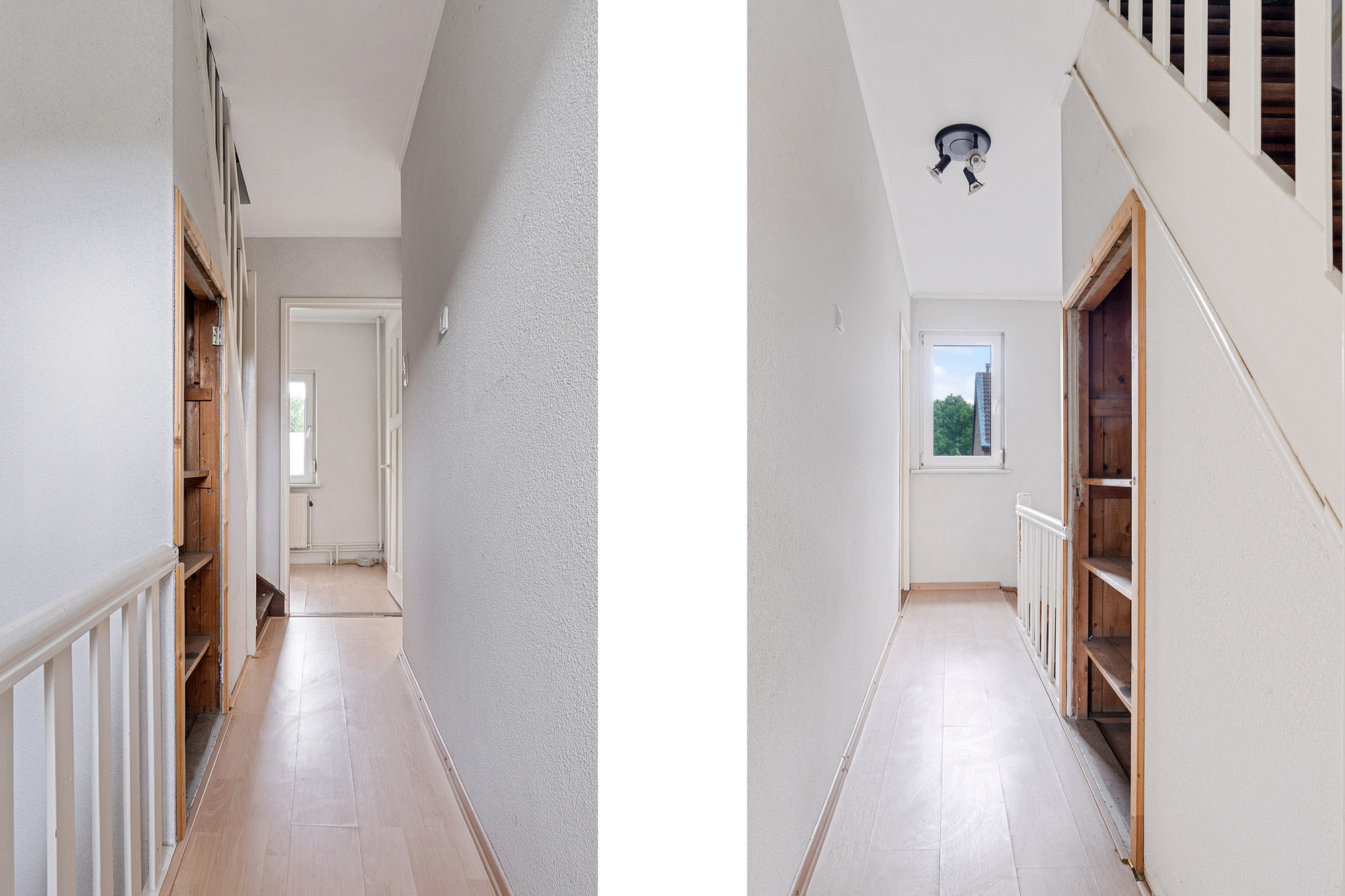 Op de overloop bevindt zich een klein opbergkastje. De verdieping biedt toegang tot drie slaapkamers, allemaal voorzien van goede afmetingen. Ideaal voor een gezin, kantoor aan huis of hobbyruimte. Een vaste trap op de overloop leidt naar de zolder.