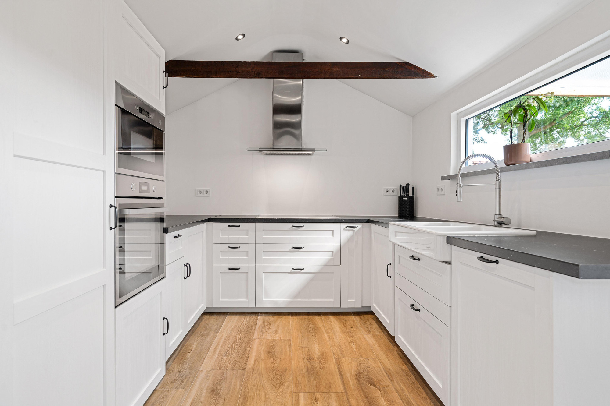 De HOEKKEUKEN in de aanbouw (4.39m x 2.78m) is compleet uitgerust: kookplaat, afzuigkap, koelkast, vaatwasser, oven én magnetron. Bovendien is er veel kast- en werkruimte.