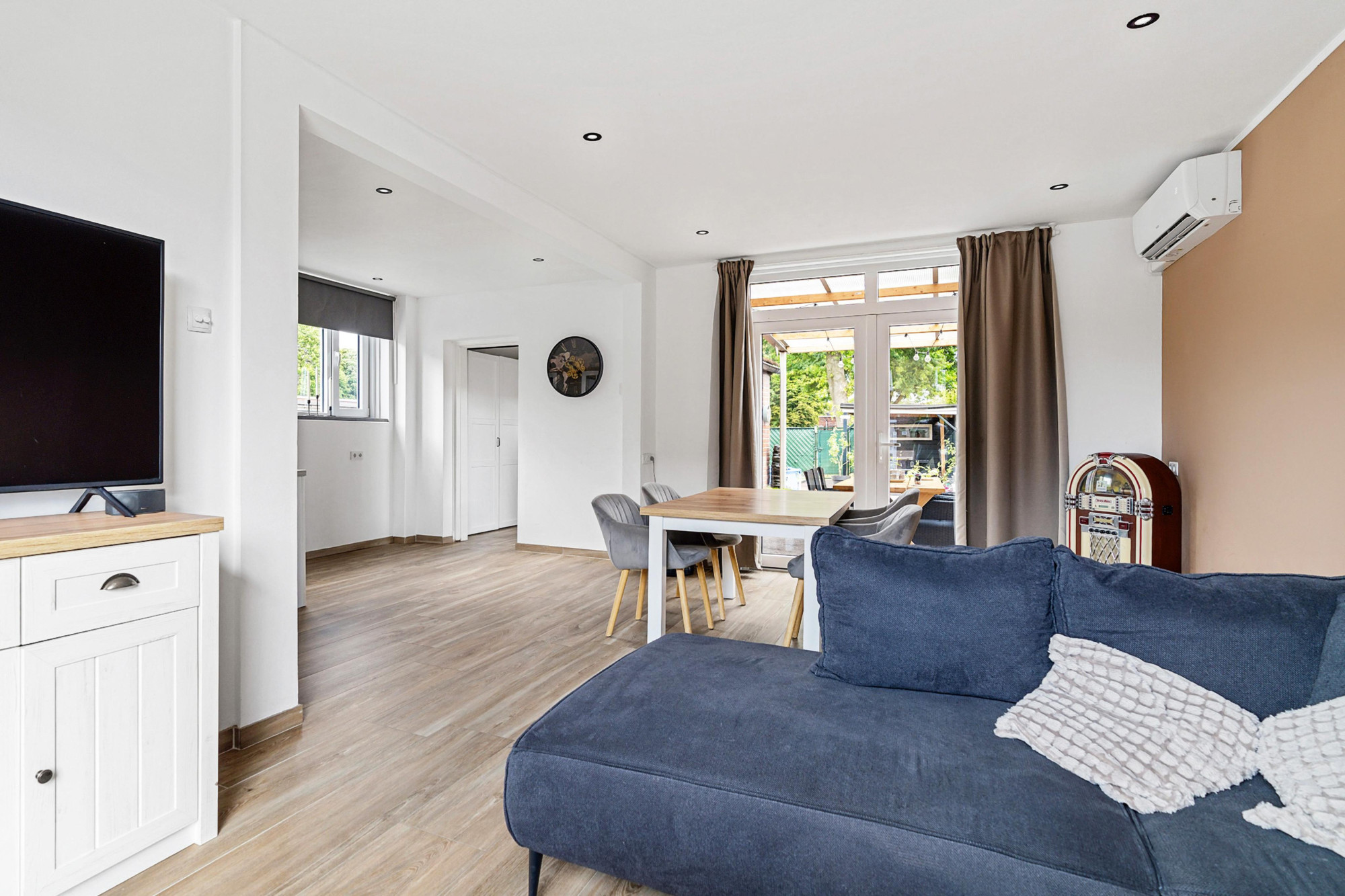 De ruime L-VORMIGE WOONKAMER (6.24m x 6.20m x 3.48m) is voorzien van een AIRCO en een nette tegelvloer. Grote raampartijen zorgen voor veel lichtinval en een prachtig uitzicht op de tuin.