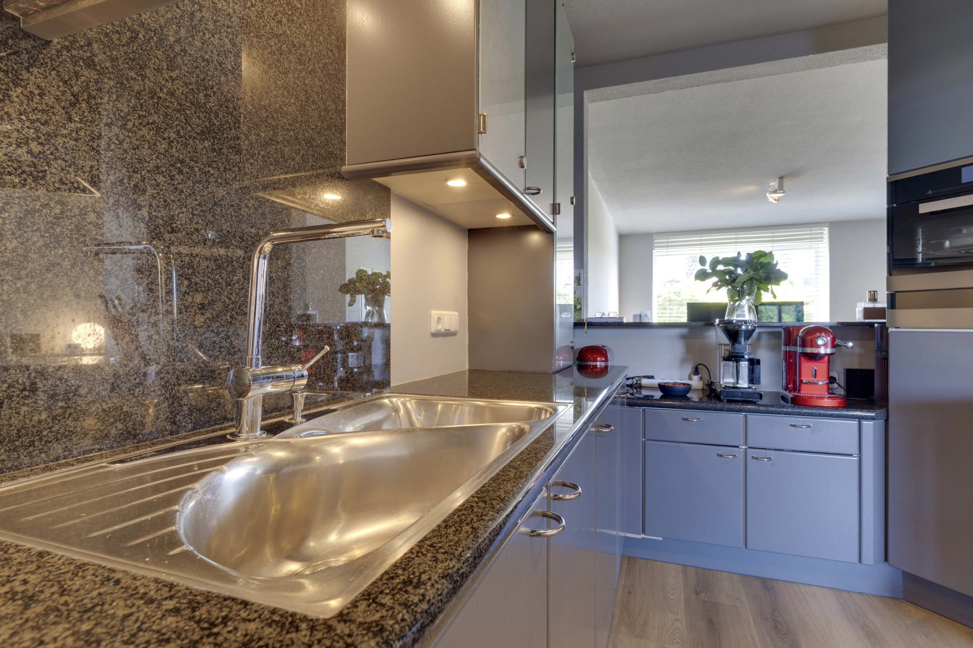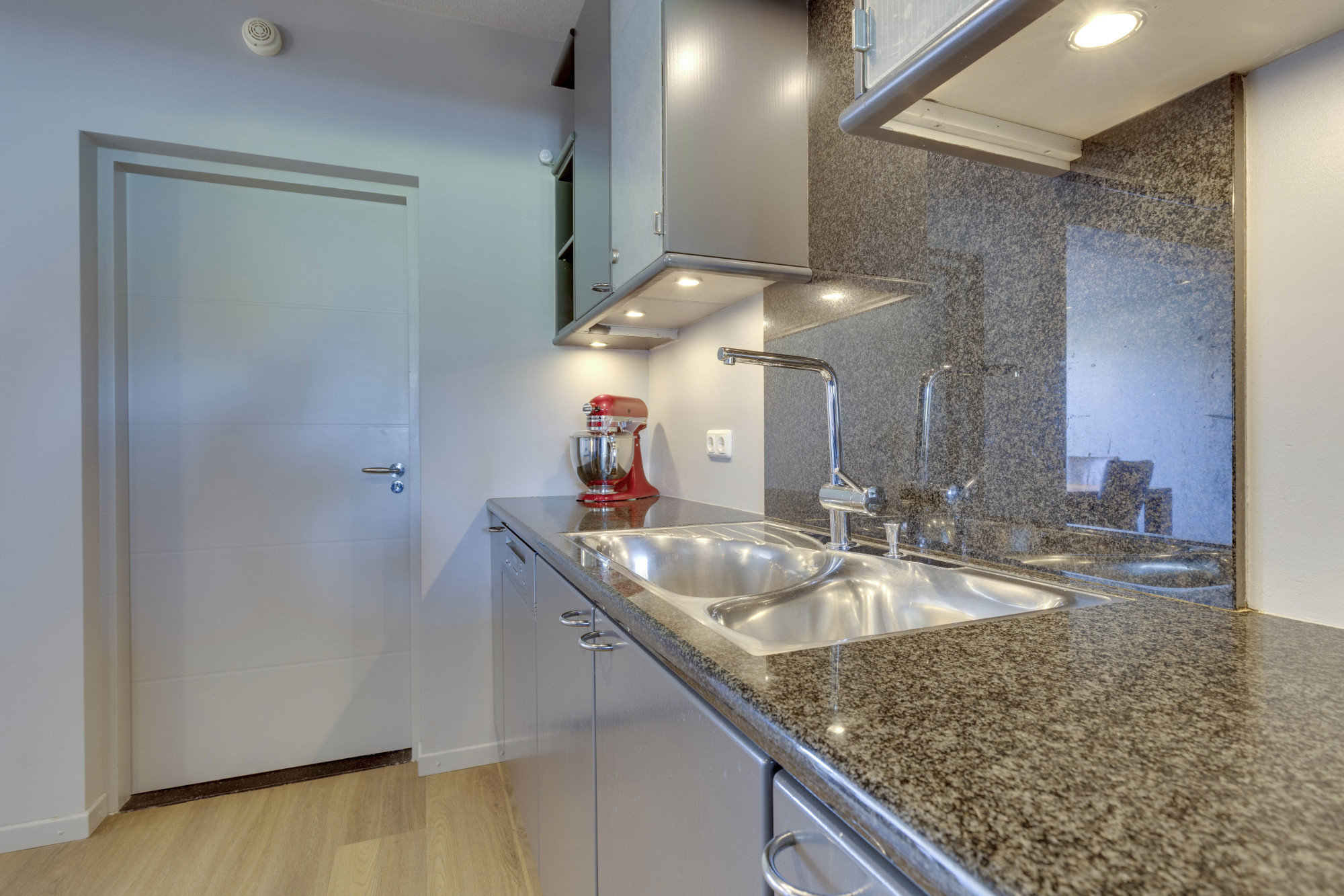 wasemkap, koelkast, stoomoven, combi-oven, vaatwasser en twee warmhoudlades.
