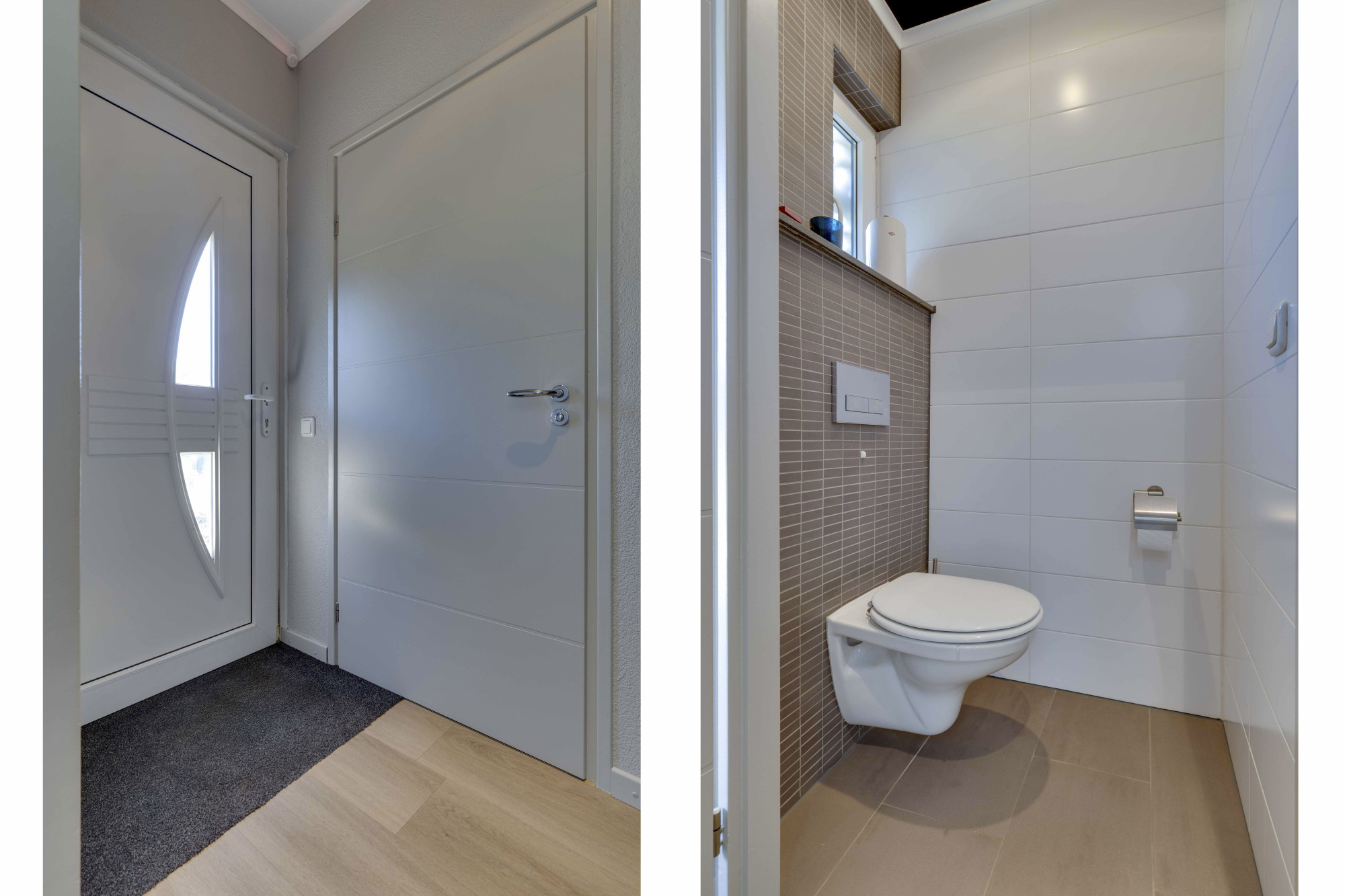 Hal/entree met meterkast en moderne toiletruimte met zwevend closet.