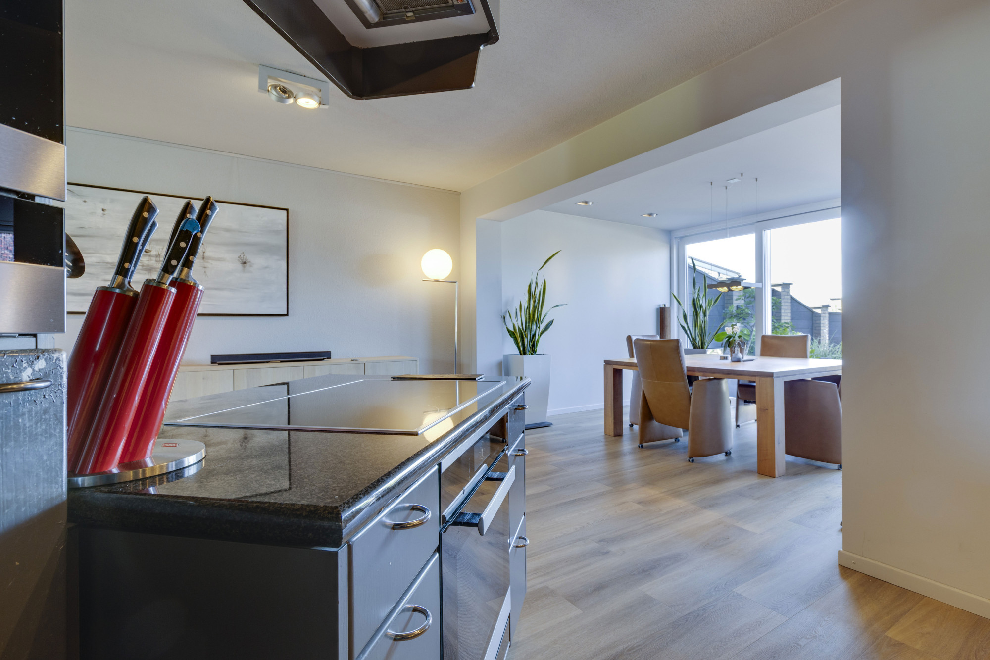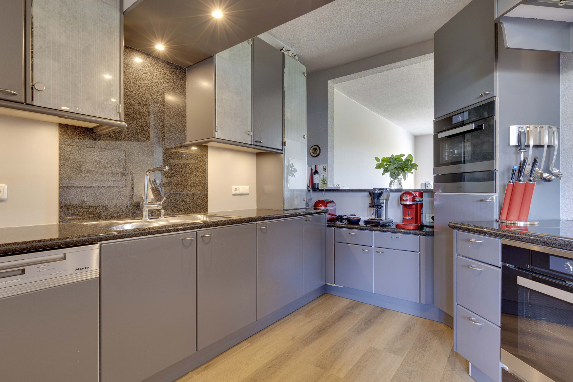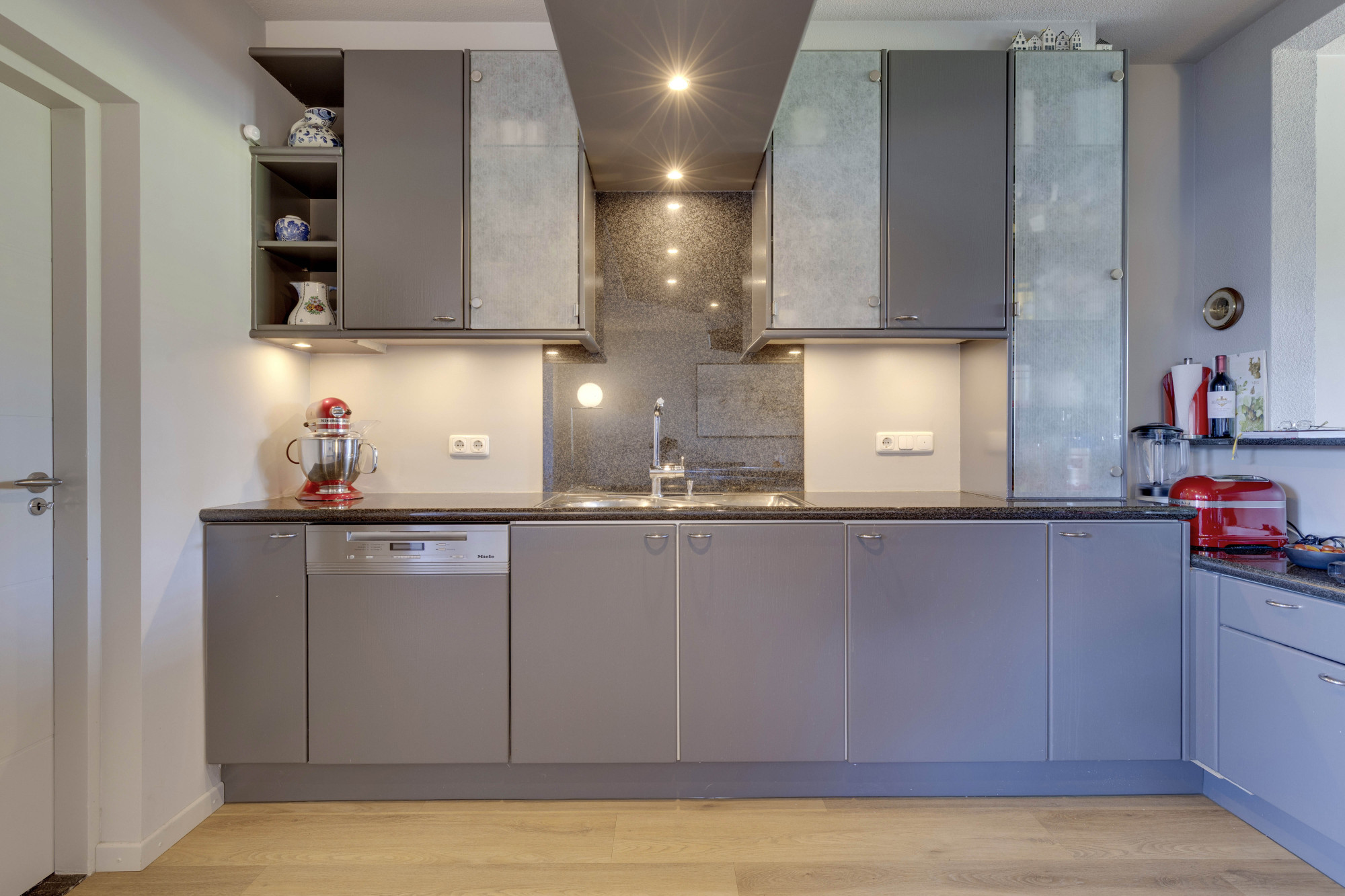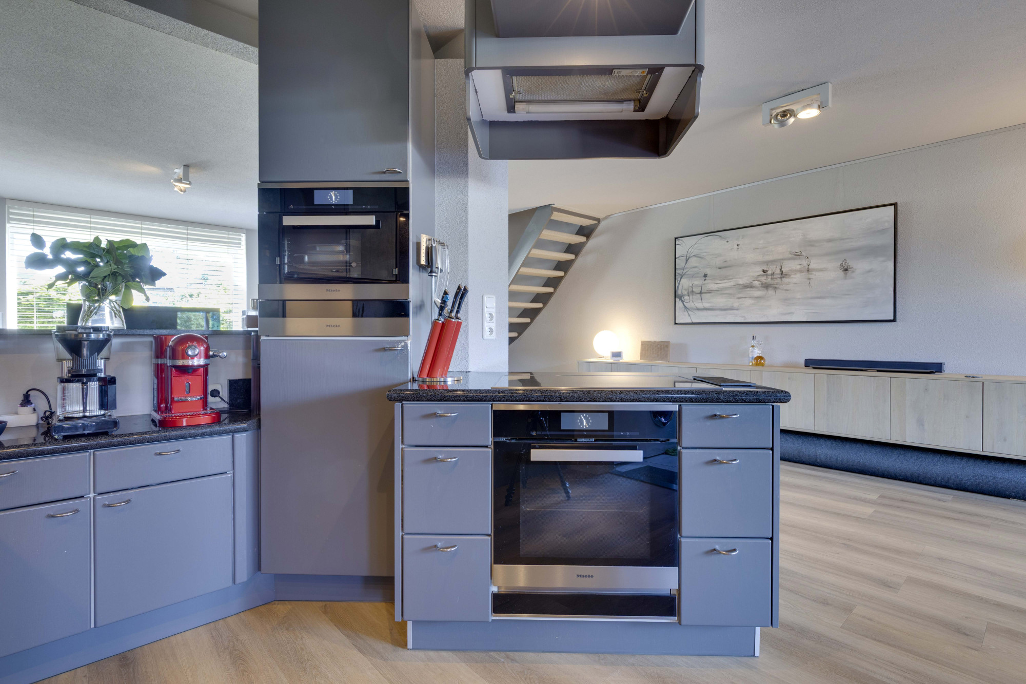 Open keuken in U-opstelling, compleet met Miele apparatuur: 4-pits inductiekooktoestel,