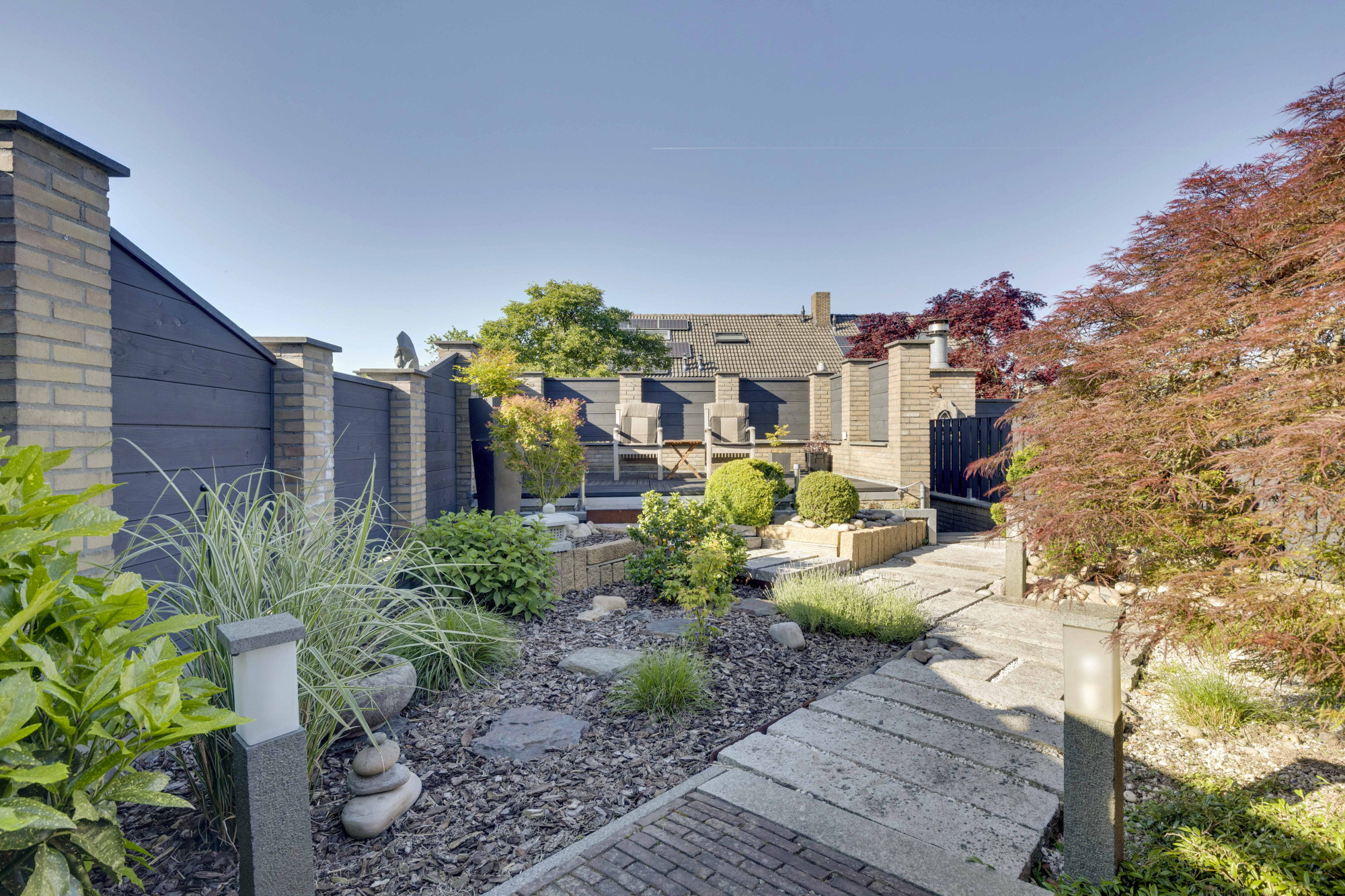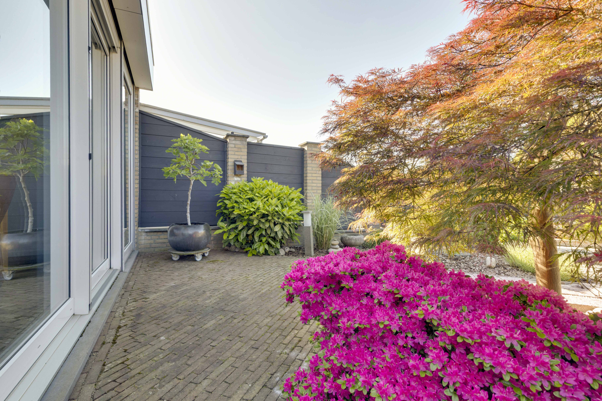 De woonkamer geeft middels een schuifpui toegang tot de omsloten, net aangelegde