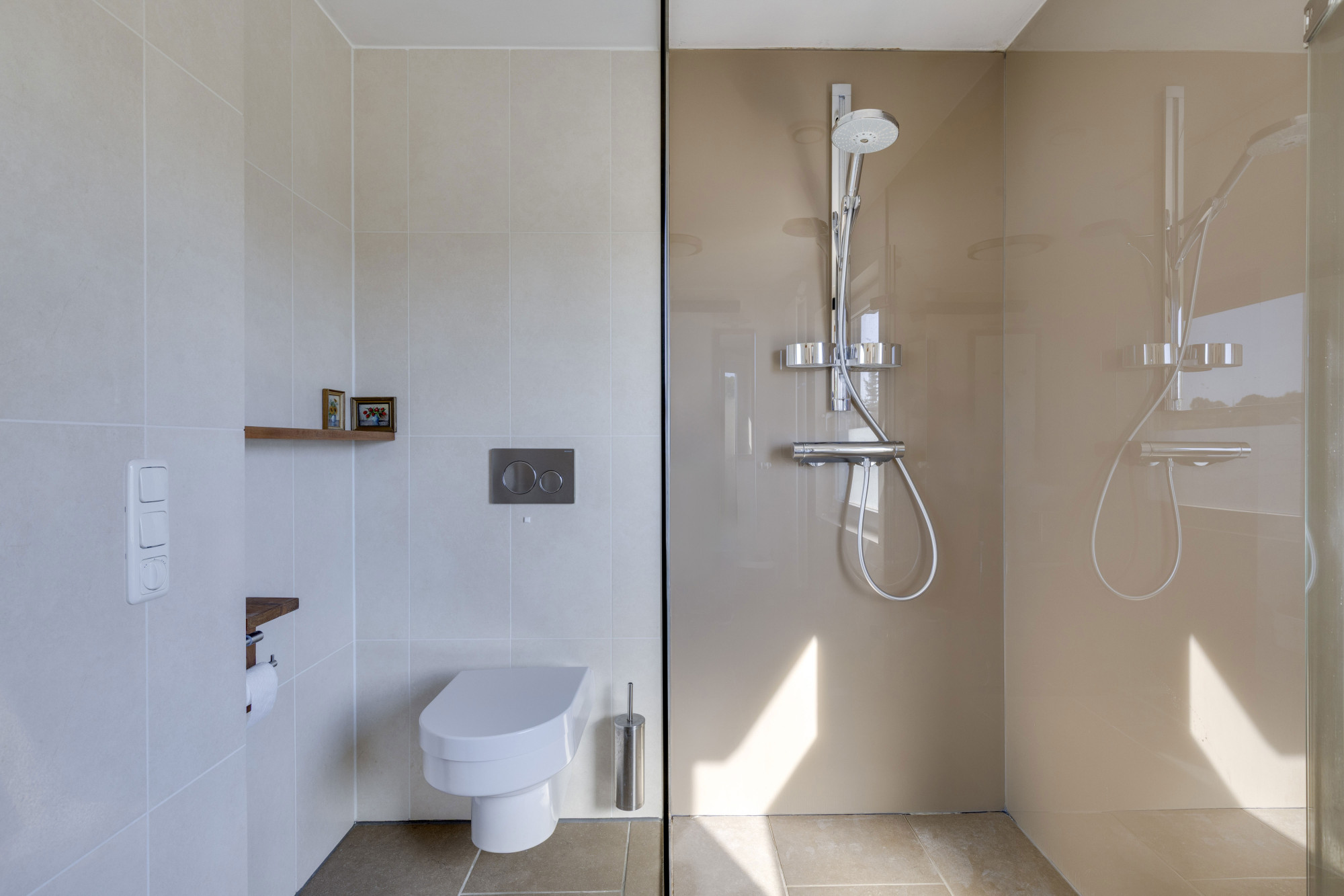 Middels glazen deur te bereiken badkamer met vloerverwarming voorzien van inloopdouche,