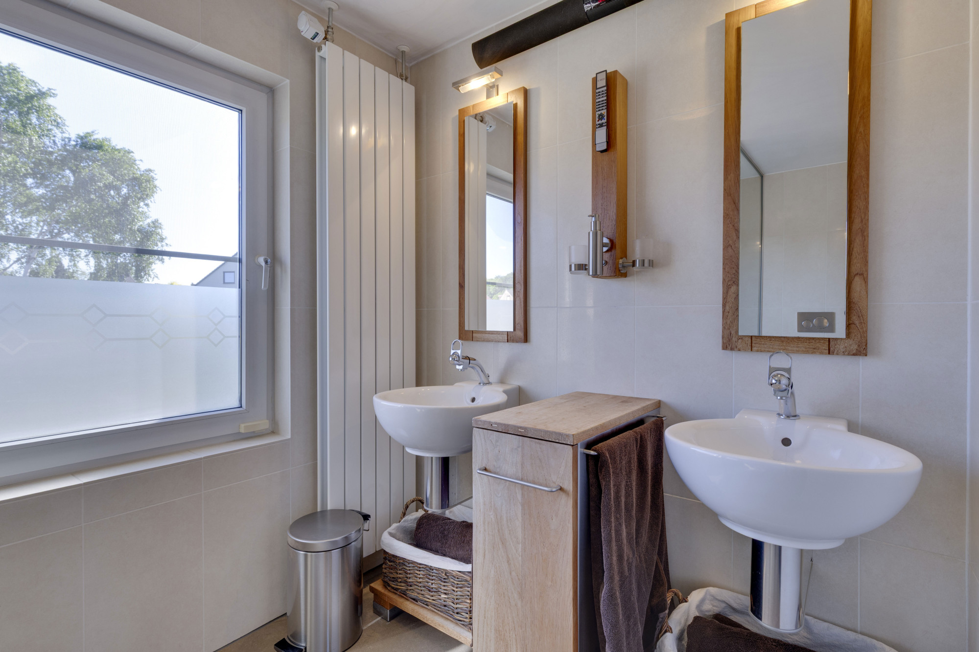 dubbele vaste wastafel met meubel, designradiator en tweede toilet.