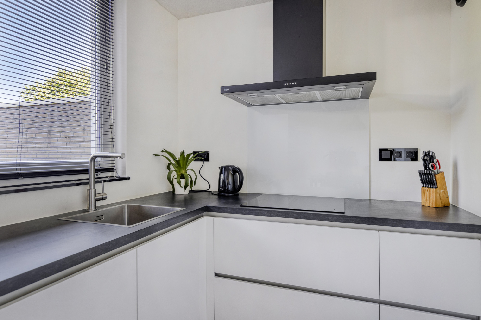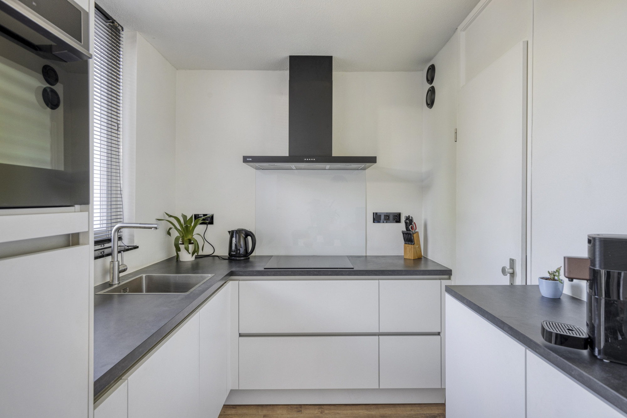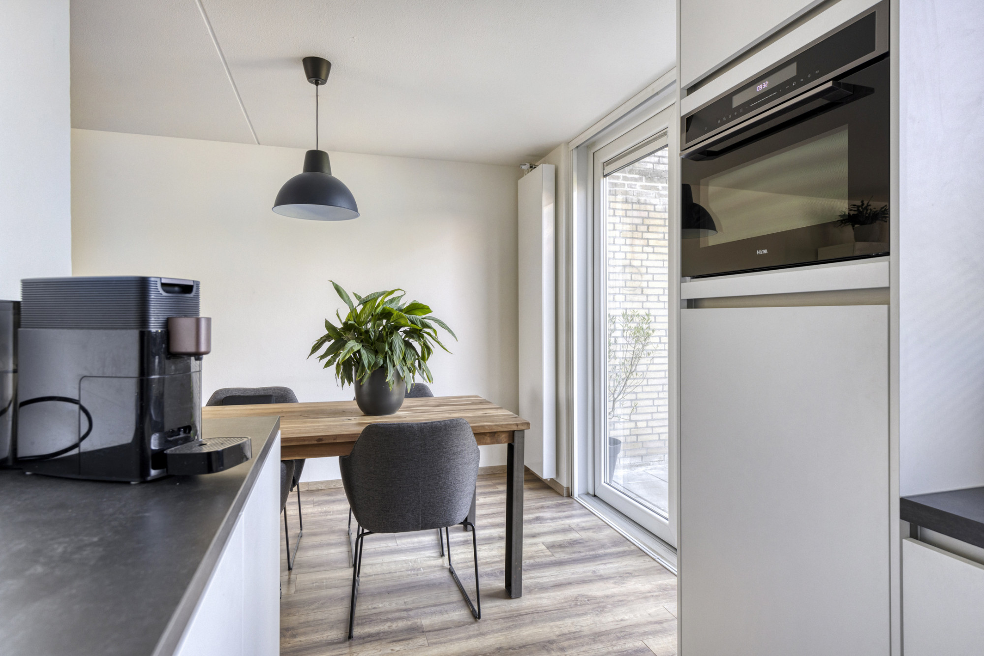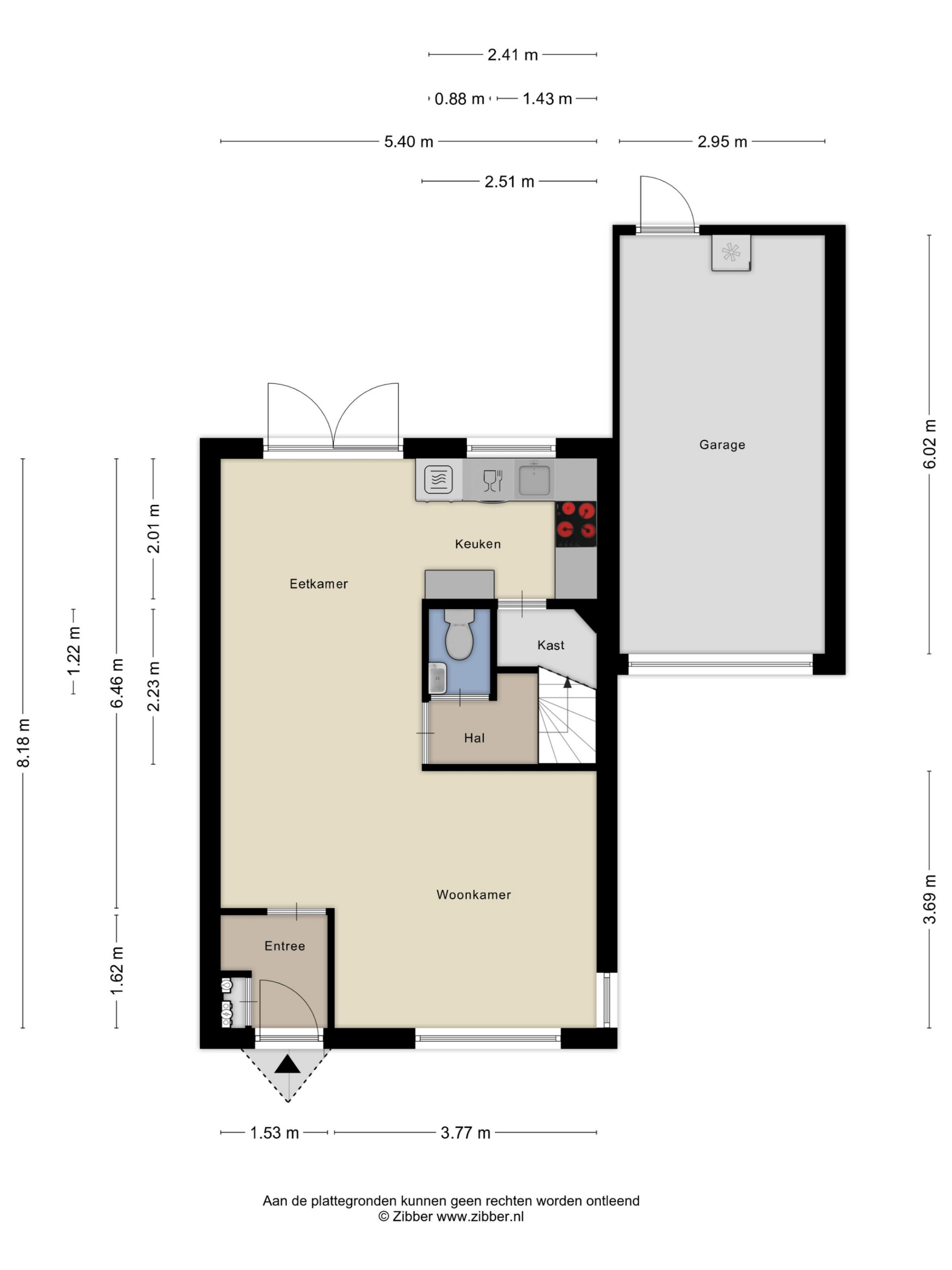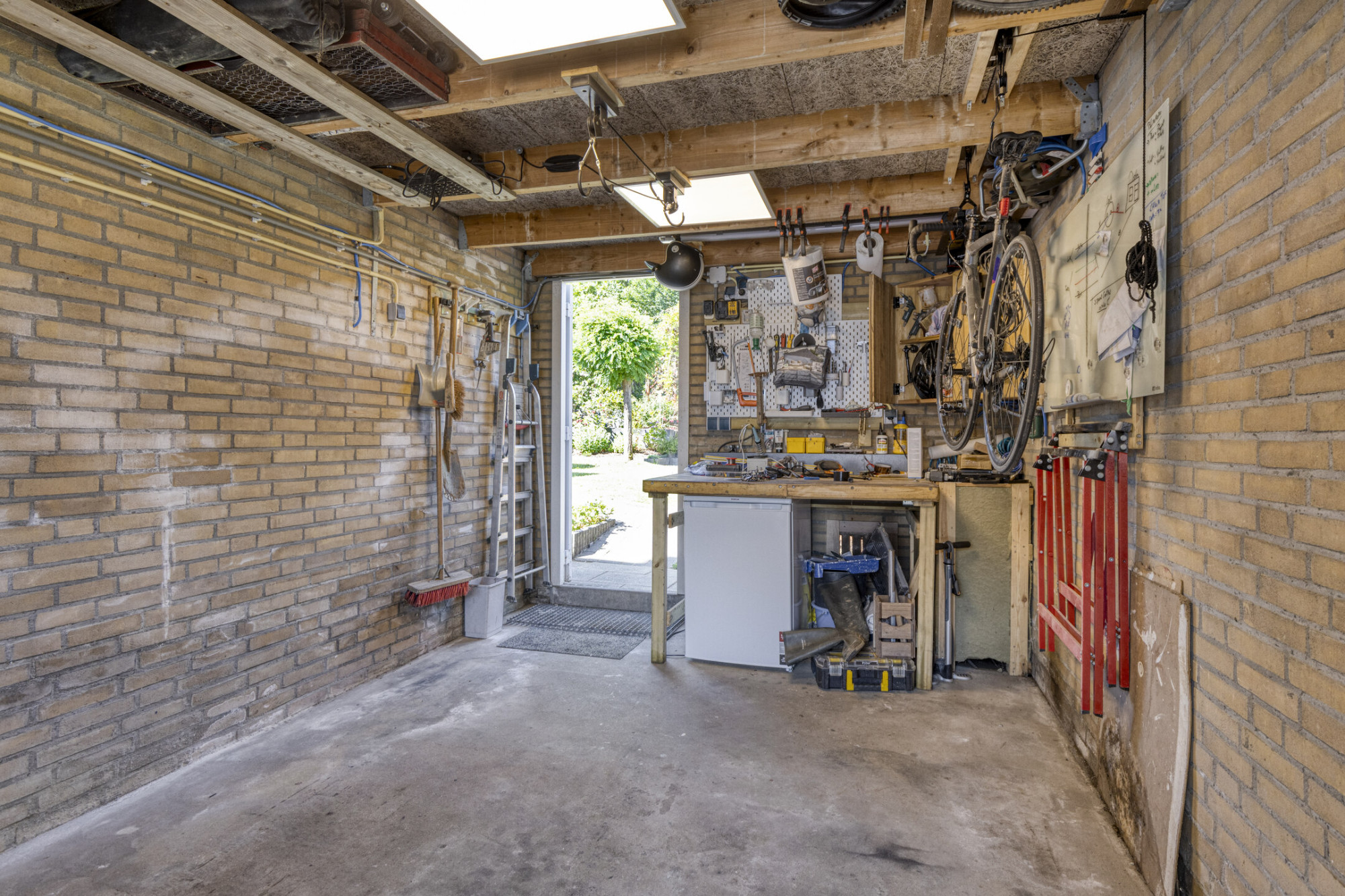 Je betreedt de woning via de hal met meterkast. De lichte woonkamer met open keuken is voorzien van openslaande tuindeuren naar het terras. De keuken is uitgerust met moderne inbouwapparatuur, waaronder een combi-magnetron, koelkast met vriesvak, vaatwasser, afzuigkap en een inductiekookplaat. Praktische bergruimte bevindt zich onder de trap. Aangebouwde garage, voorzien van een kantelpoort. In de tuin staat een houten tuinhuis.