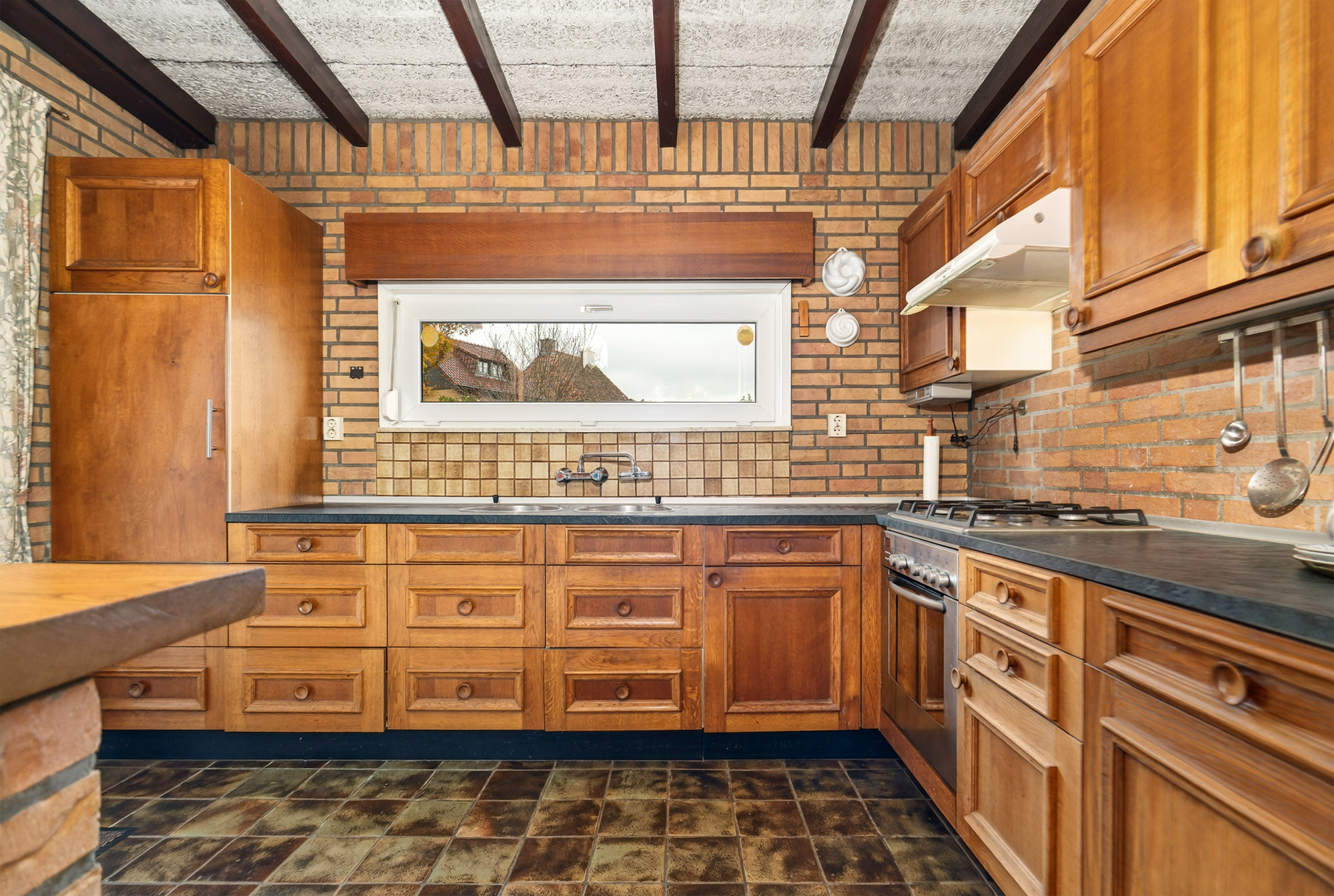 De open keuken is praktisch ingericht met boven- en onderkastjes, een dubbele wasbak, oven, 4-pits gasfornuis, afzuigkap en koelkast. Vanuit zowel de woonkamer als de keuken heb je toegang tot de achtertuin met overkapping — een ideale plek om het hele jaar door van het buitenleven te genieten.