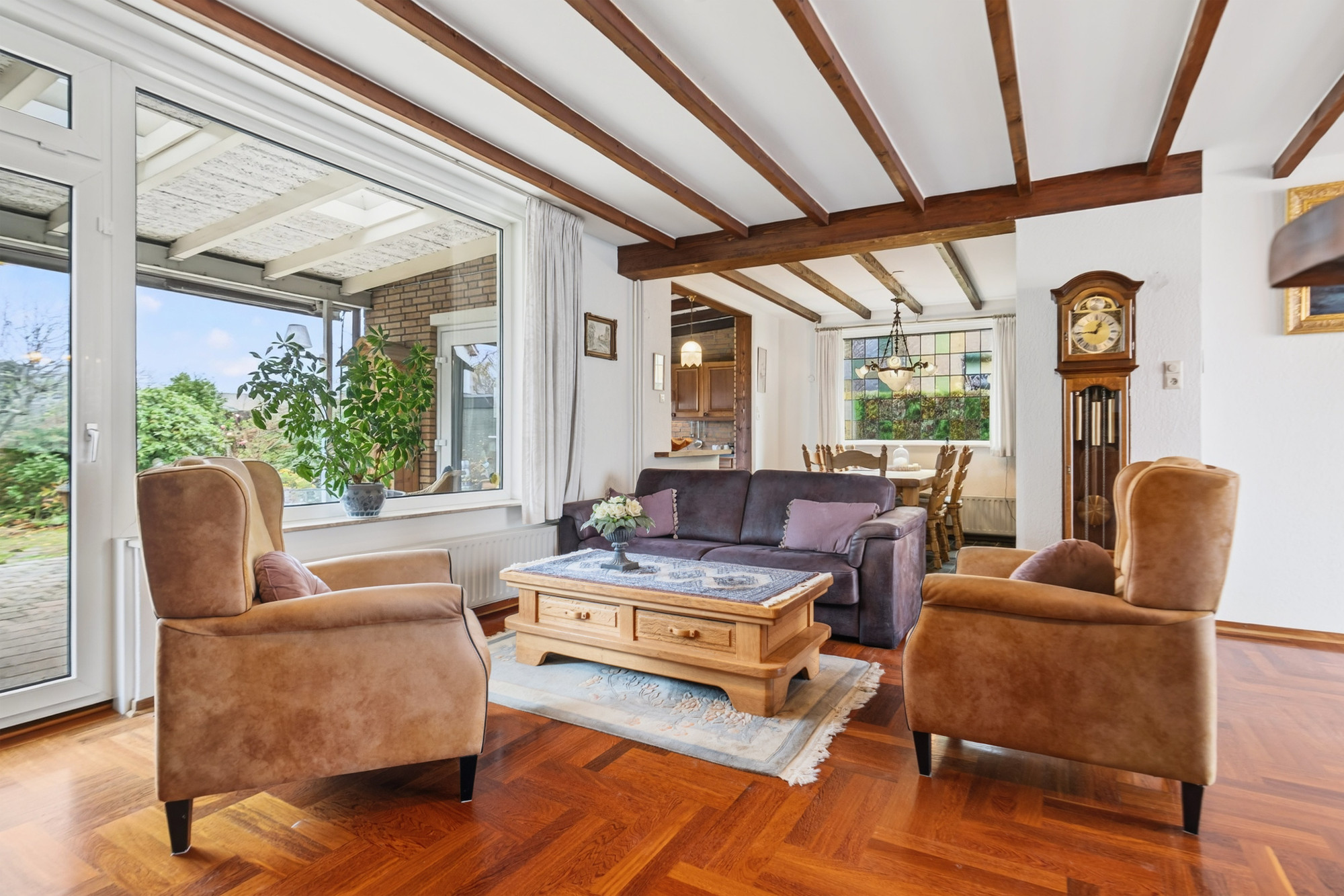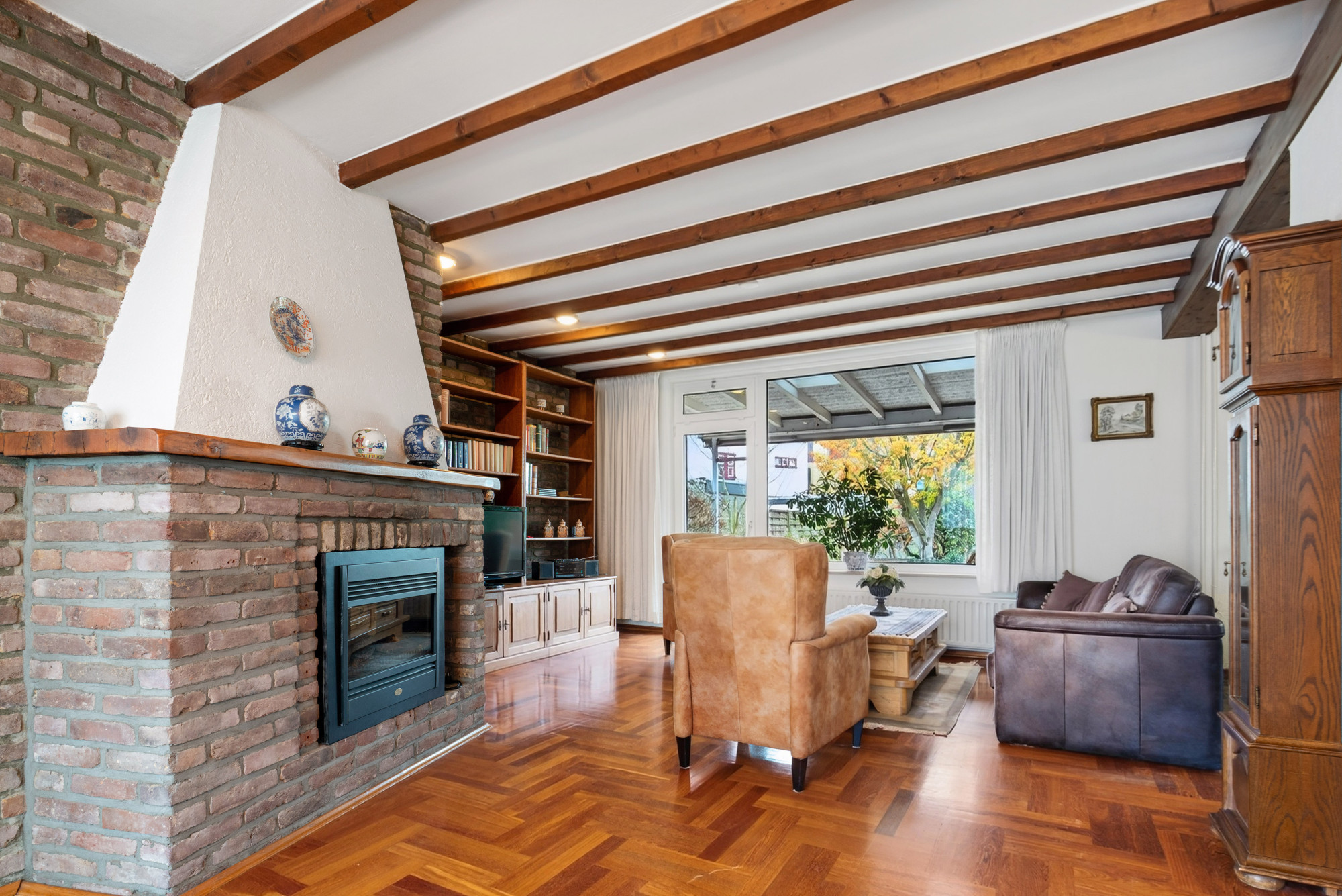 De woonkamer heeft een warme uitstraling dankzij de fraaie houten vloer en de gezellige open haard. Aansluitend bevindt zich de open eetkamer, die doorloopt in de keuken. Zowel de eetkamer als keuken zijn voorzien van een nette tegelvloer.