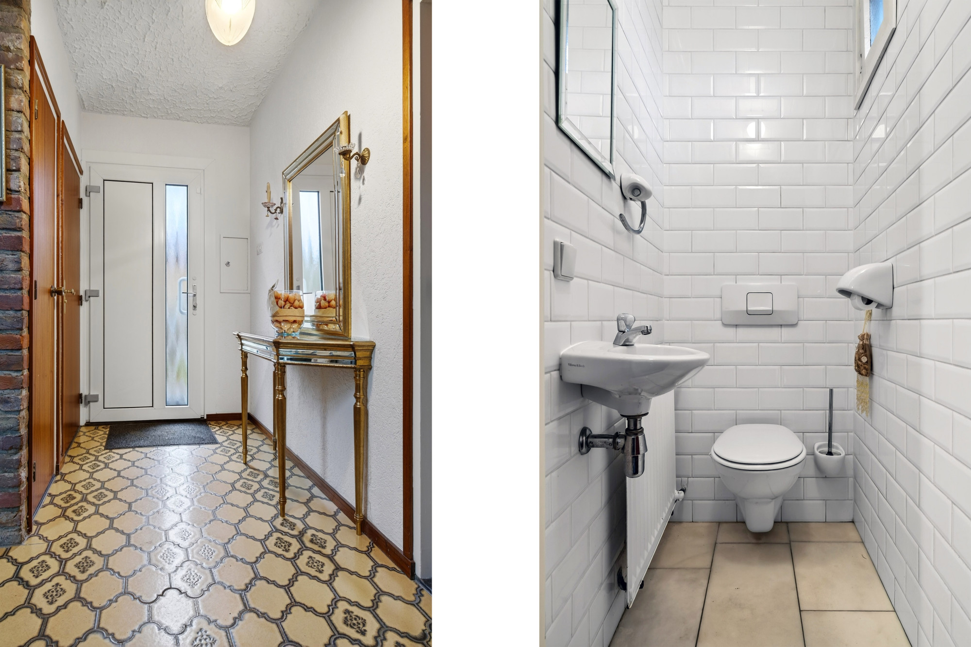 Je komt binnen via de keurig betegelde hal, waar zich de meterkast bevindt. De hal geeft toegang tot het volledig betegelde, separate toilet met fonteintje, de trap naar de eerste verdieping, de trap naar het souterrain én de woonkamer.