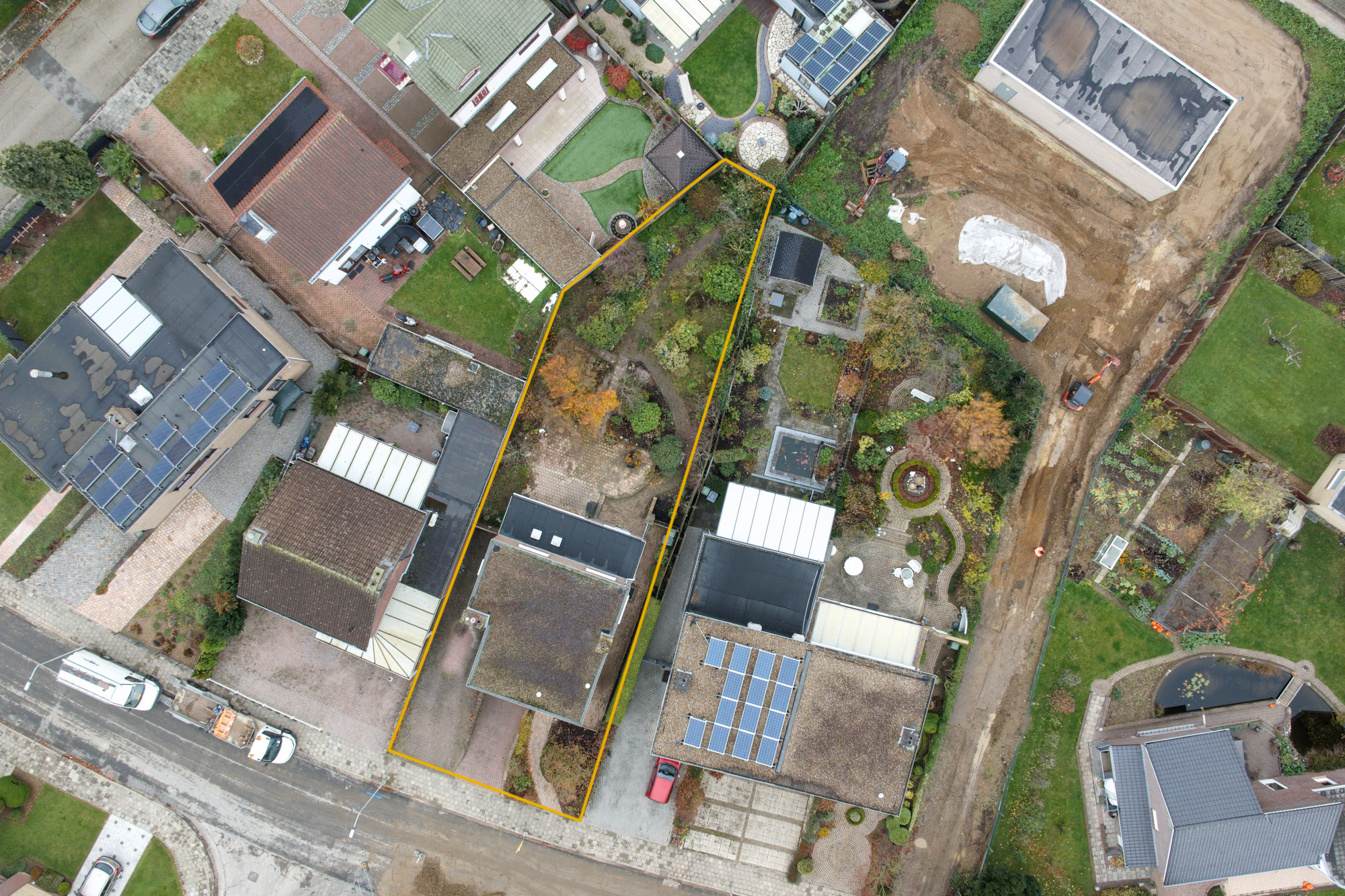• Recht vóór de woning ligt een tweede oprit die afloopt naar beneden, rechtstreeks naar de inpandige garage in het souterrain.