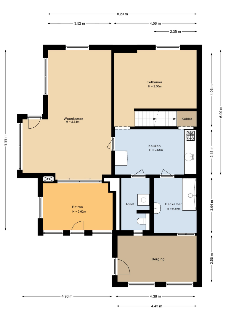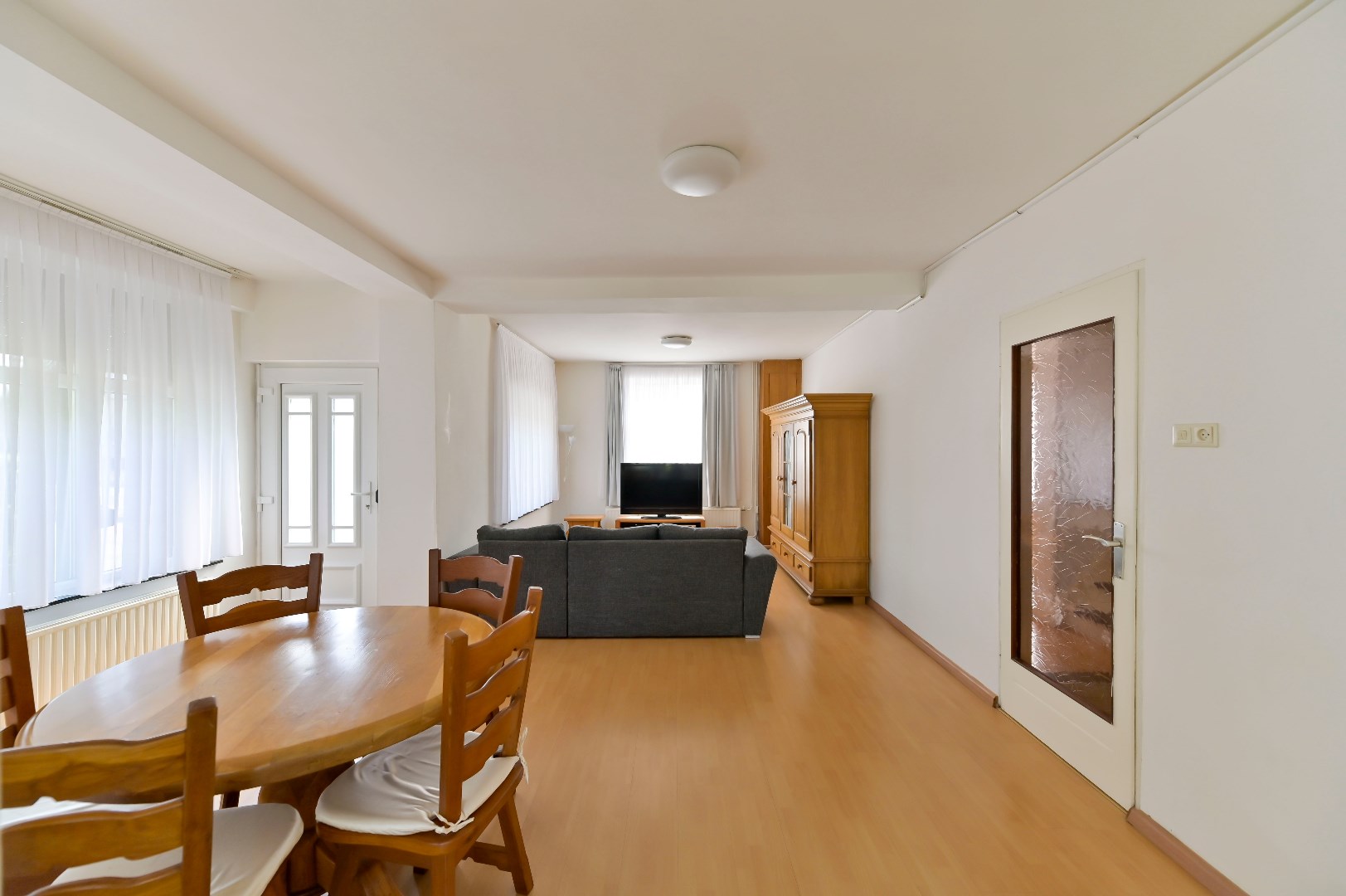 Entree tot de ruime woonkamer met laminaatvloer, stucwerk wanden, ensuite deuren en enkele deur naar tuin. Toiletruimte (2014) met witgoedaansluiting. Aparte eetkamer/ kantoor/ hobbykamer met laminaatvloer. Ruime leefkeuken keukenblok met spoelbak en inbouwapparatuur zoals: 4-pits gaskookplaat, afzuigkap en vaatwasser. Vanuit de keuken heeft men toegang tot de provisiekelder. Badkamer met ligbad en wastafel. De ruime vrijstaande garage met kantelpoort is bereikbaar middels een grote oprit. Ruime tuin op het noordoosten met veel privacy.