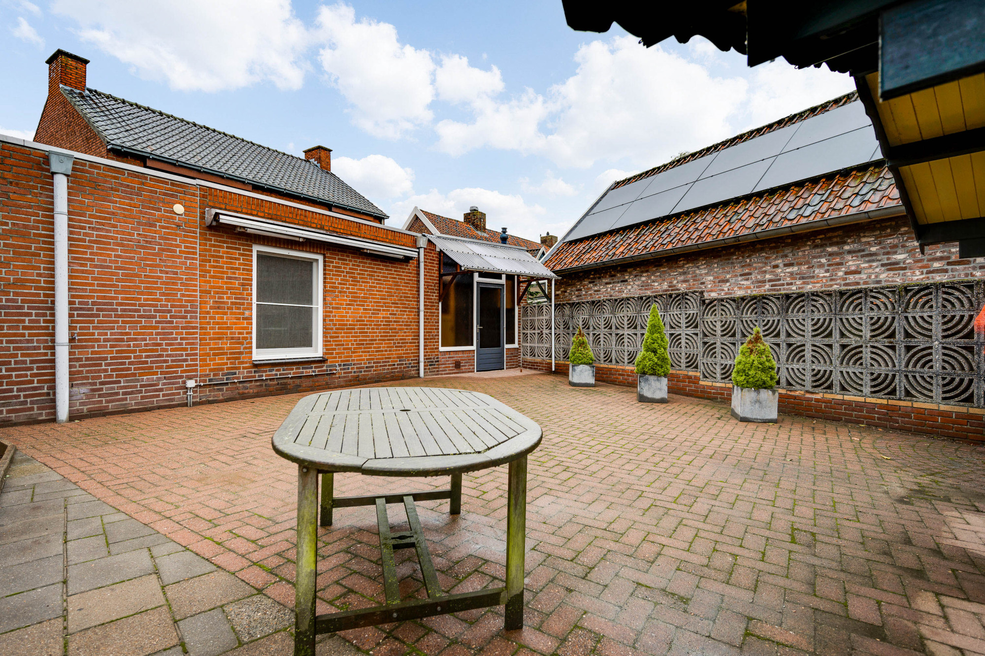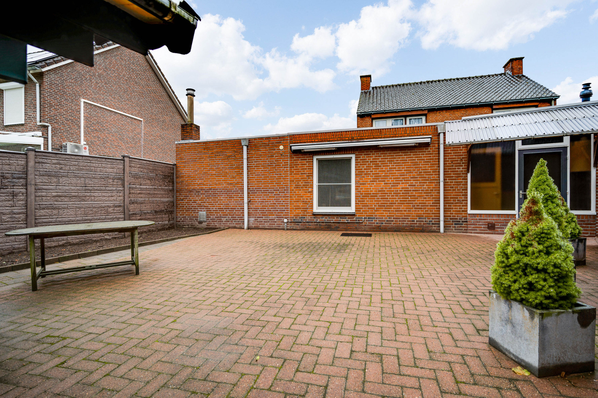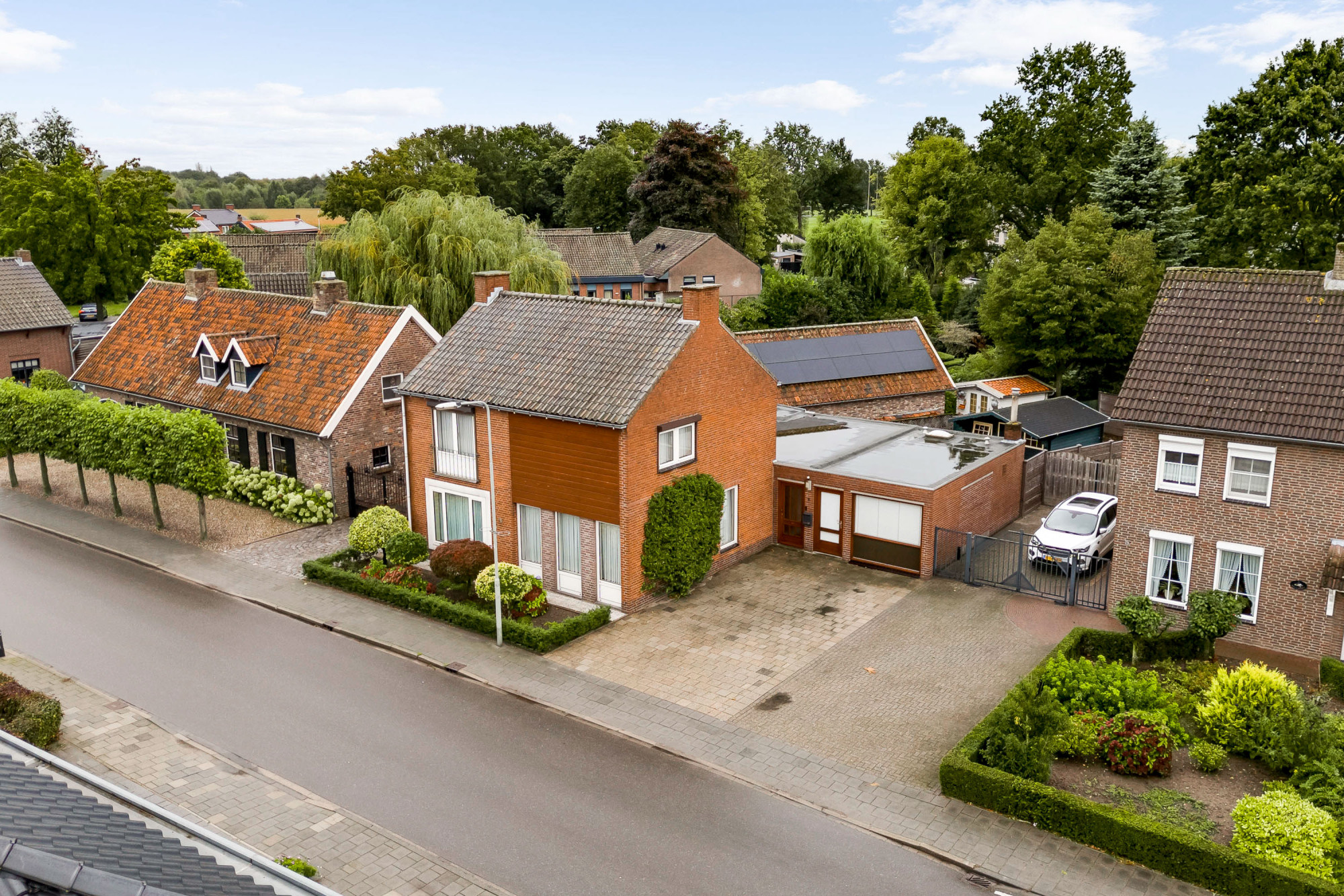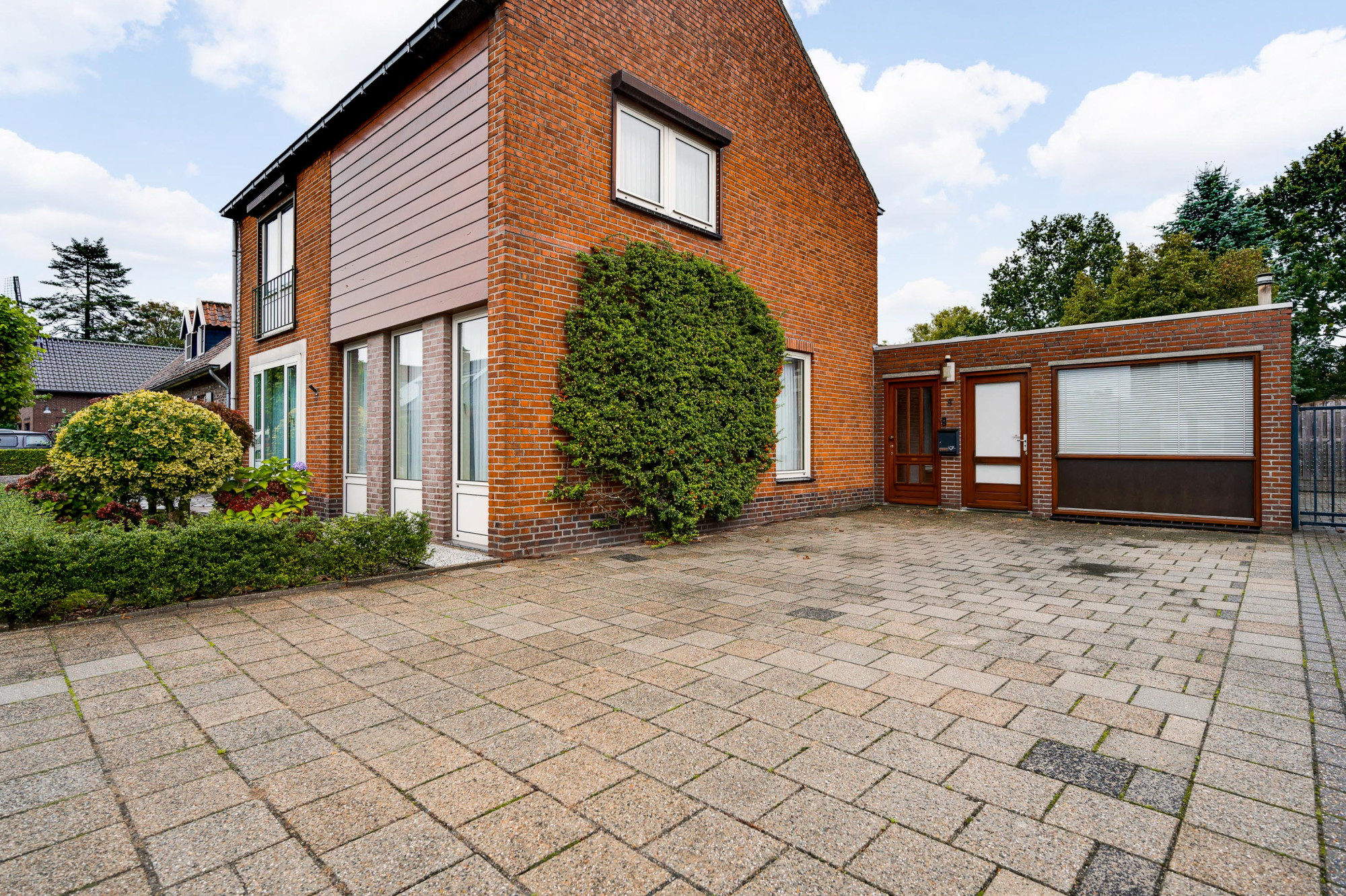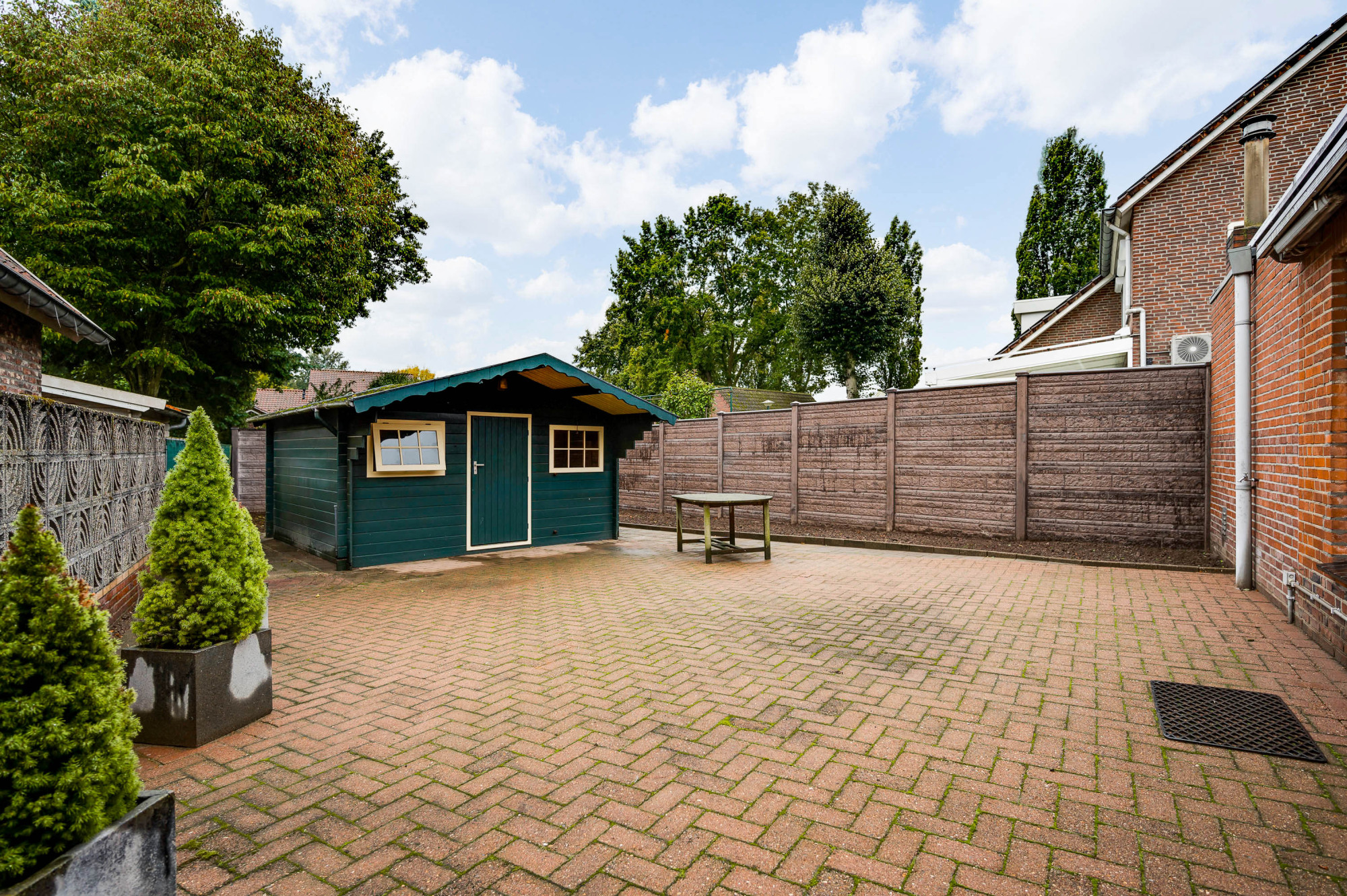 Buiten vindt u een fraai aangelegde voortuin met een brede oprit die plaats biedt aan meerdere auto's. De achtertuin is grotendeels bestraat en voorzien van een houten tuinhuis en borders. De tuin biedt voldoende privacy en ruimte om te genieten van zonnige dagen en heeft een zonnescherm voor extra comfort.