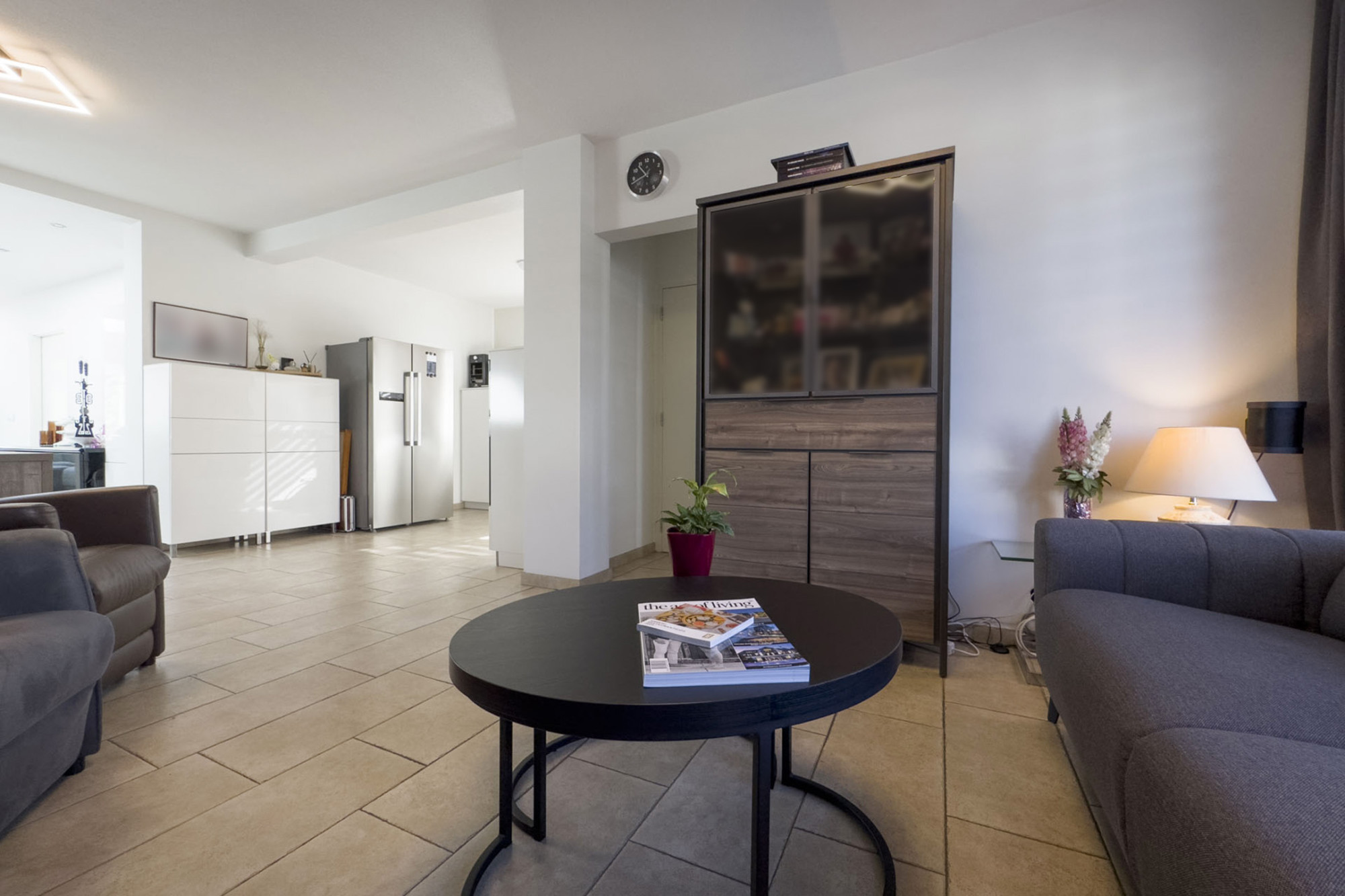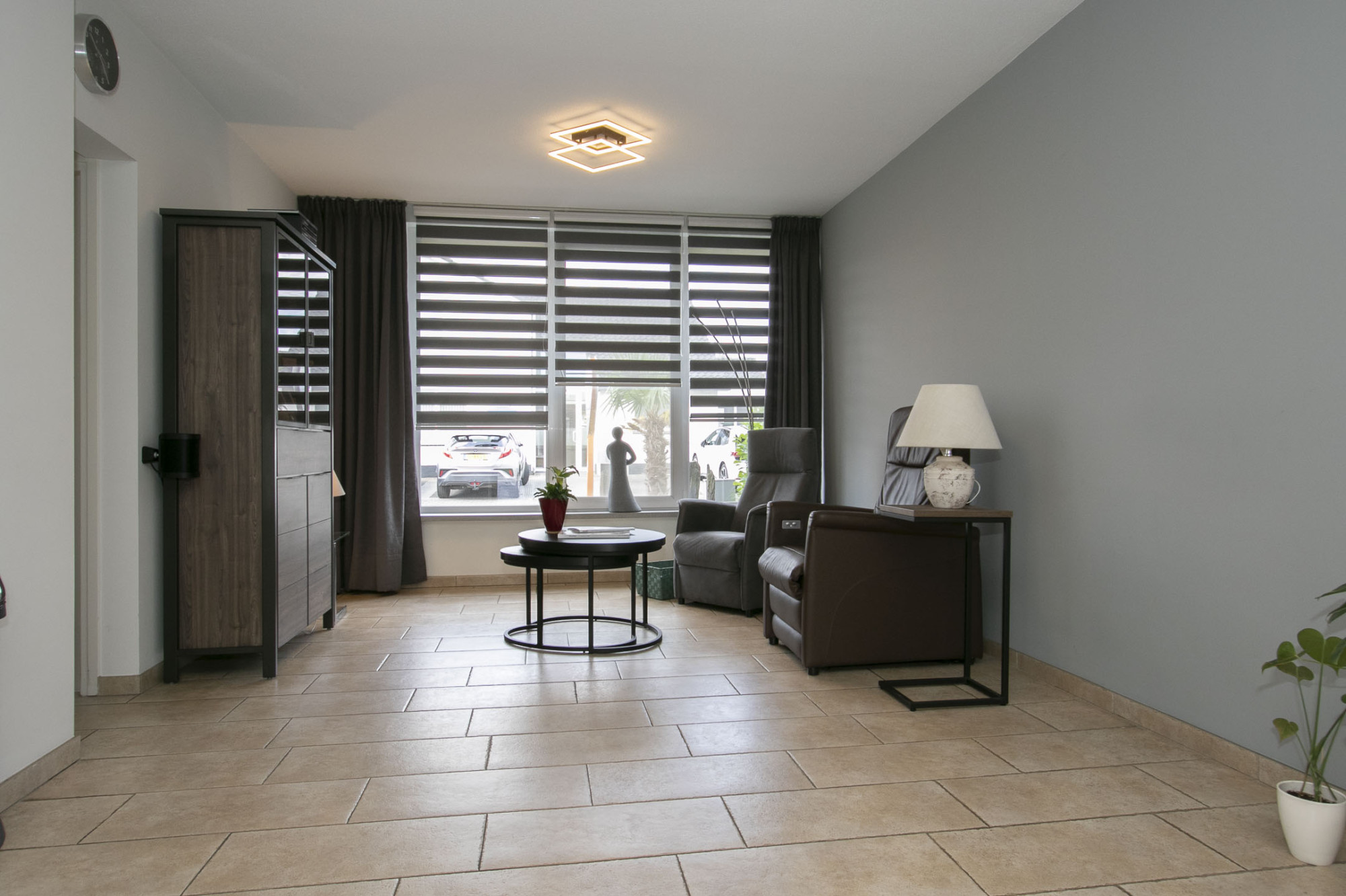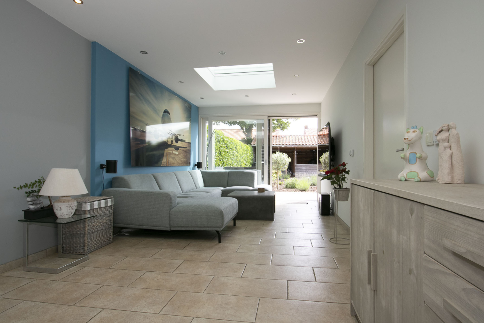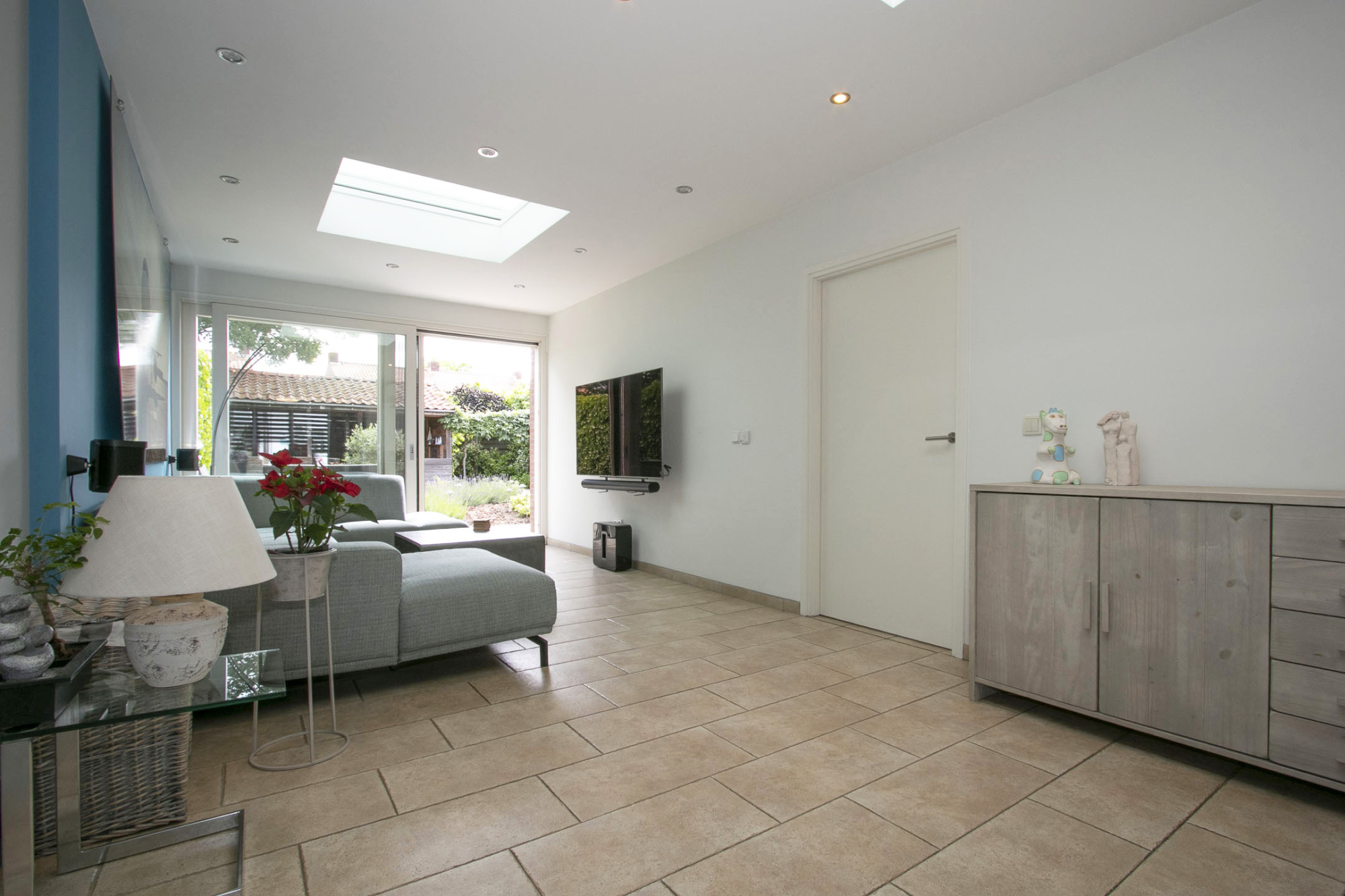 De woonkamer is heerlijk diep en heeft zowel aan voor- en achterzijde een riant zitgedeelte. Aan de achterzijde heerlijk uitzicht over de tuin middels elektrisch bedienbare schuifpui. Over de gehele benedenverdieping ligt een moderne lichte tegelvloer die drempelloos is doorgelegd. Deze is uitgevoerd met vloerverwarming in de woonkamer, keuken, slaapkamer beneden en ook de badkamer boven.