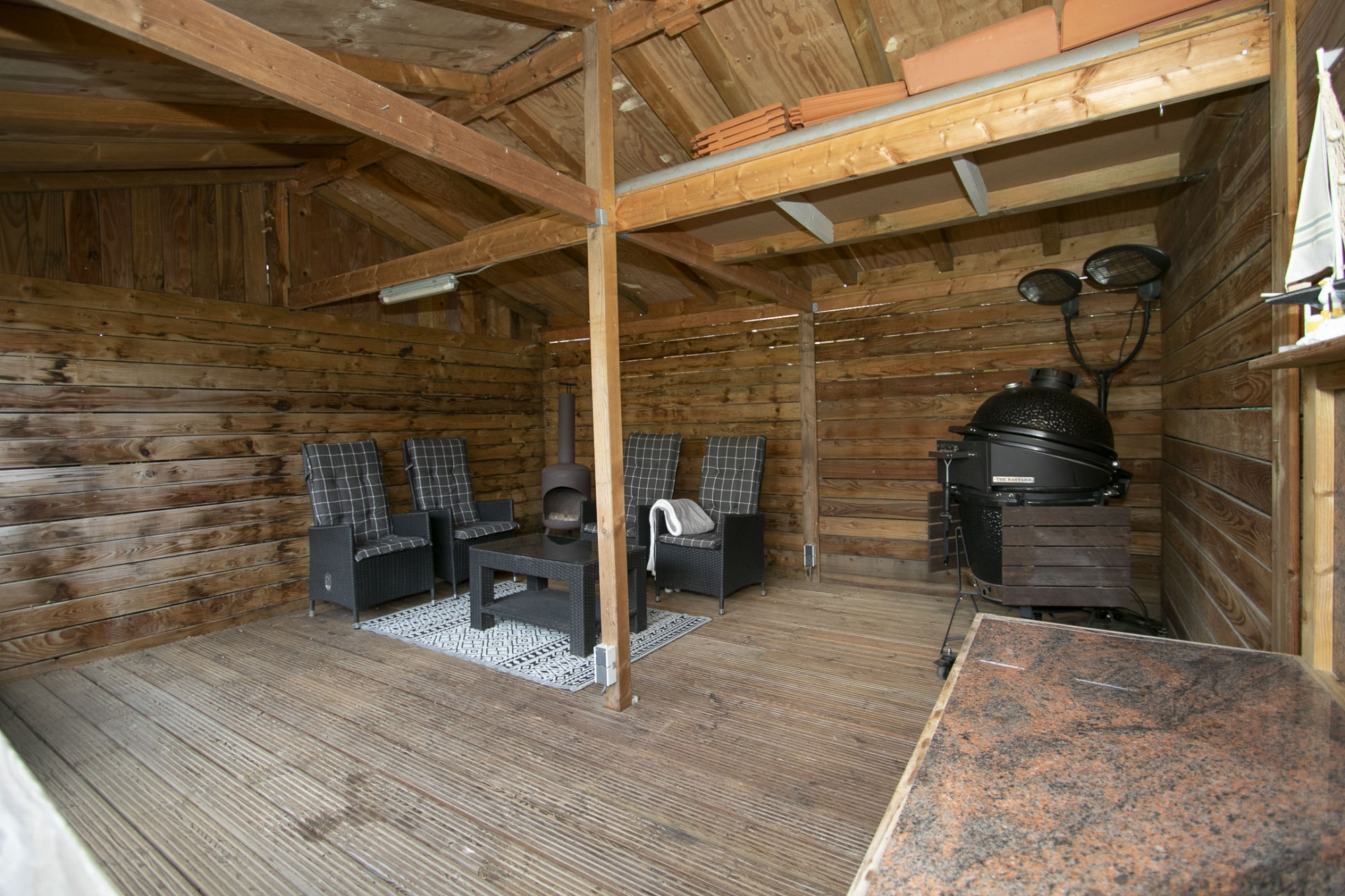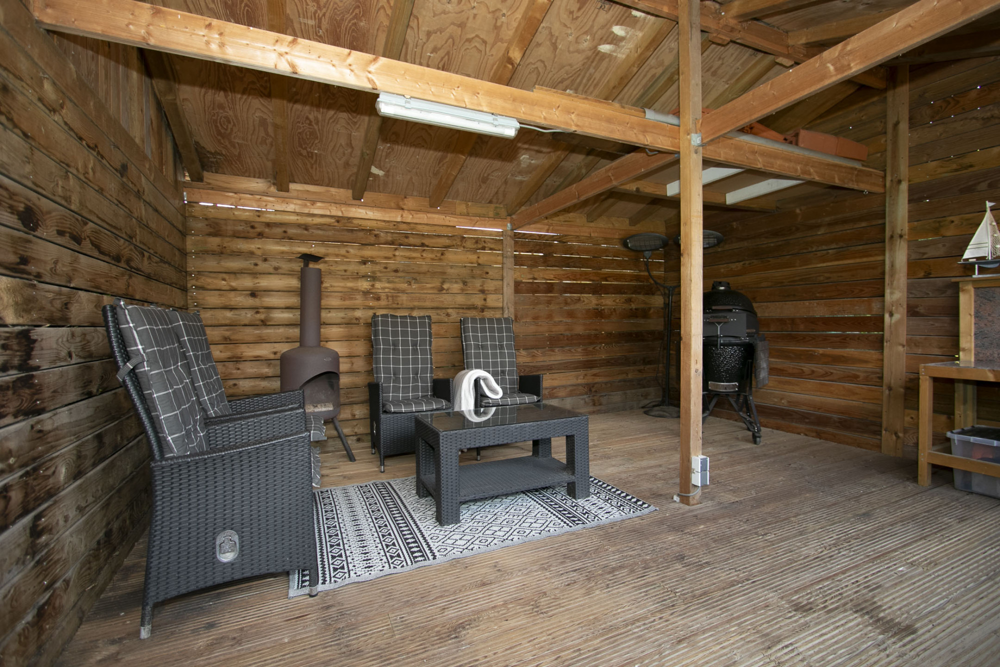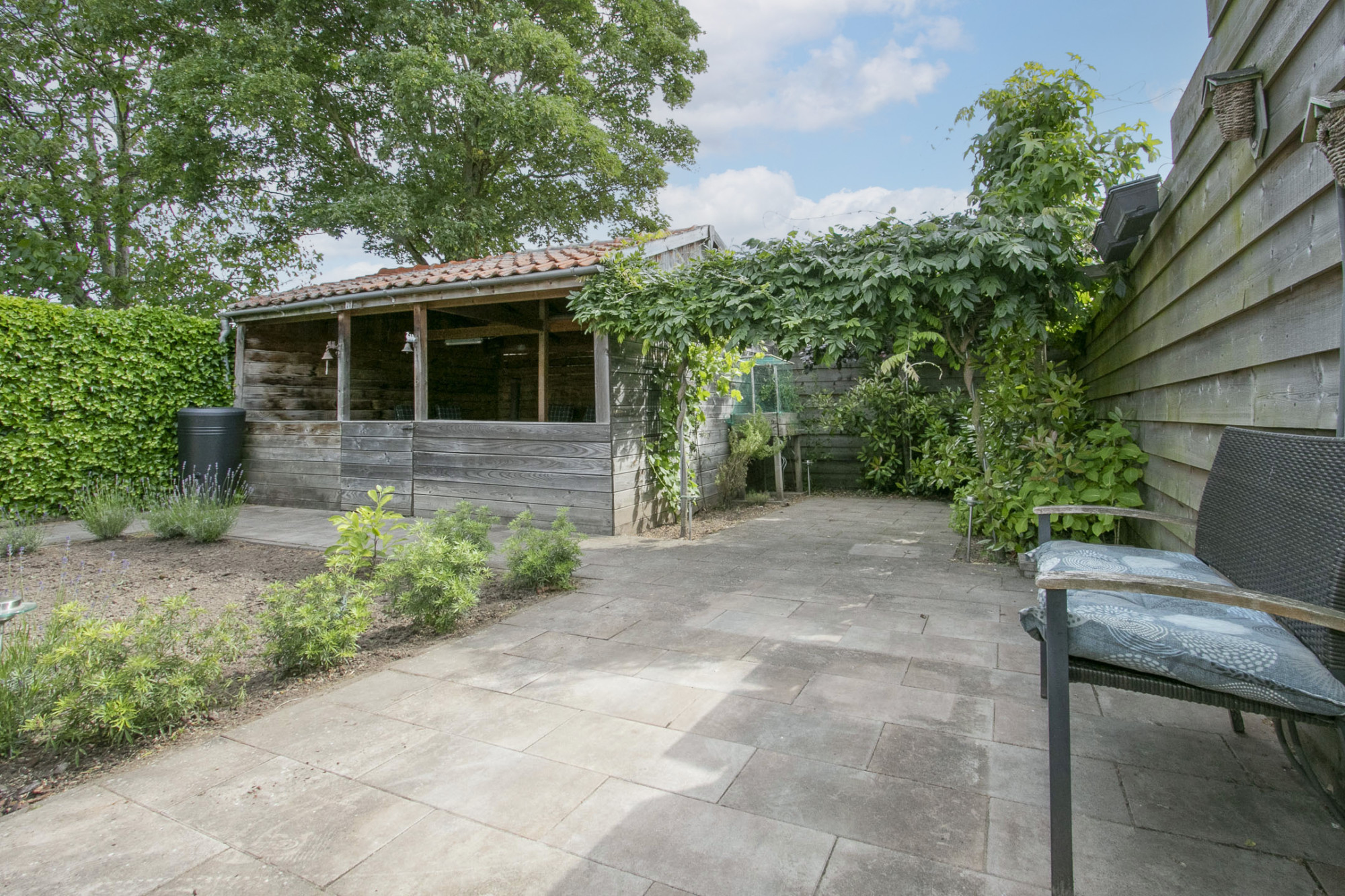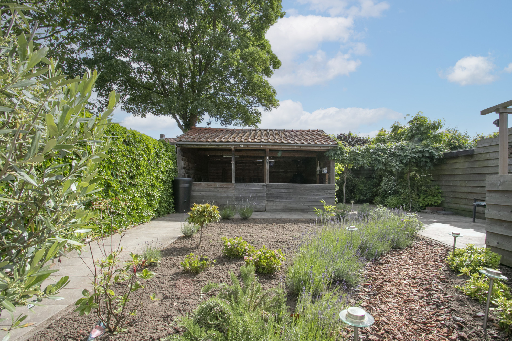 De tuin is aangelegd met groenstroken en middels het beklinkerd pad is de luxe houten overkapping aan de achterzijde van de tuin bereikbaar. Deze meet ongeveer 20 m². Vanuit deze overkapping is het tijdens zomeravond heerlijk ontspannen toeven.