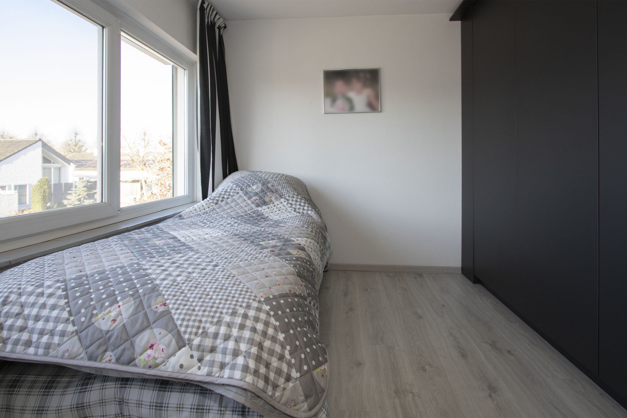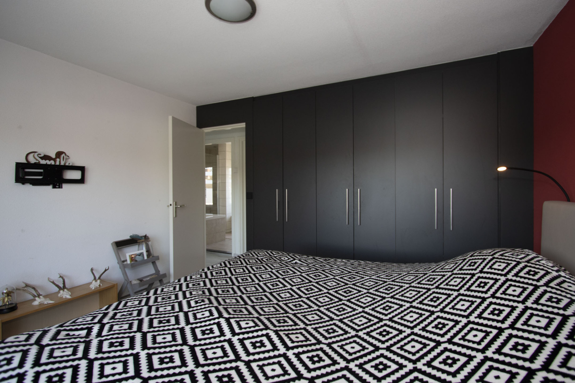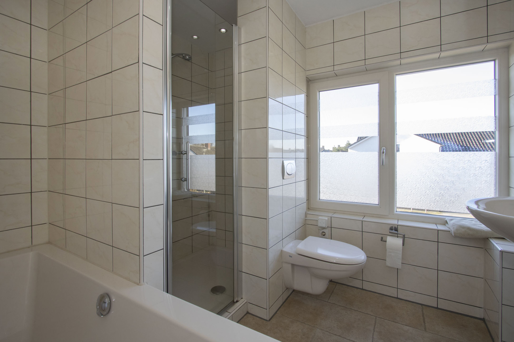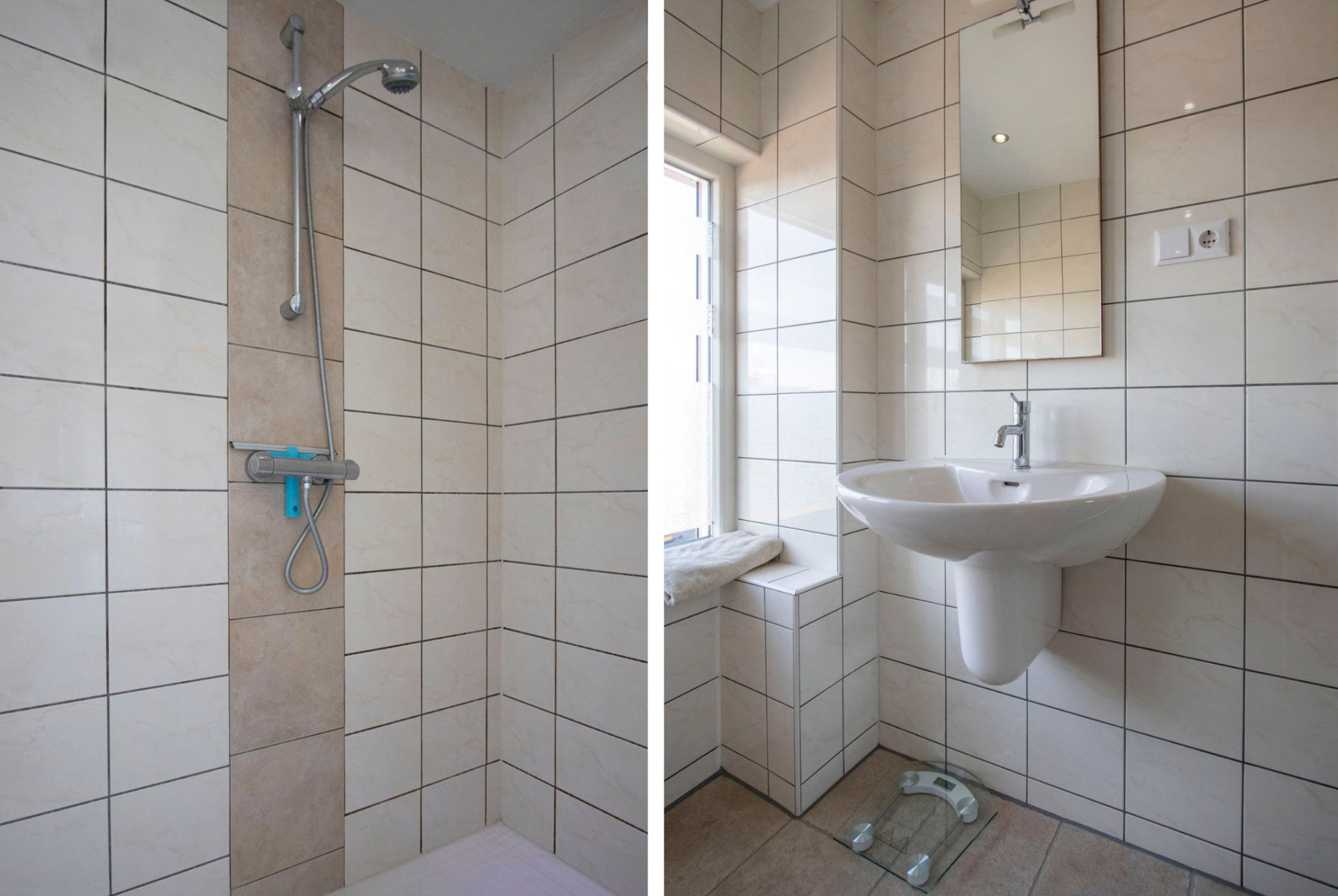 Op 1e verdieping bevinden zich 3 keurige slaapkamers, waarvan twee met maatwerk kastenwand. De badkamer op deze verdieping biedt een compleet programma met ligbad, inloopdouchecabine, toilet en een wastafel. Het geheel is in moderne lichte tinten betegeld.