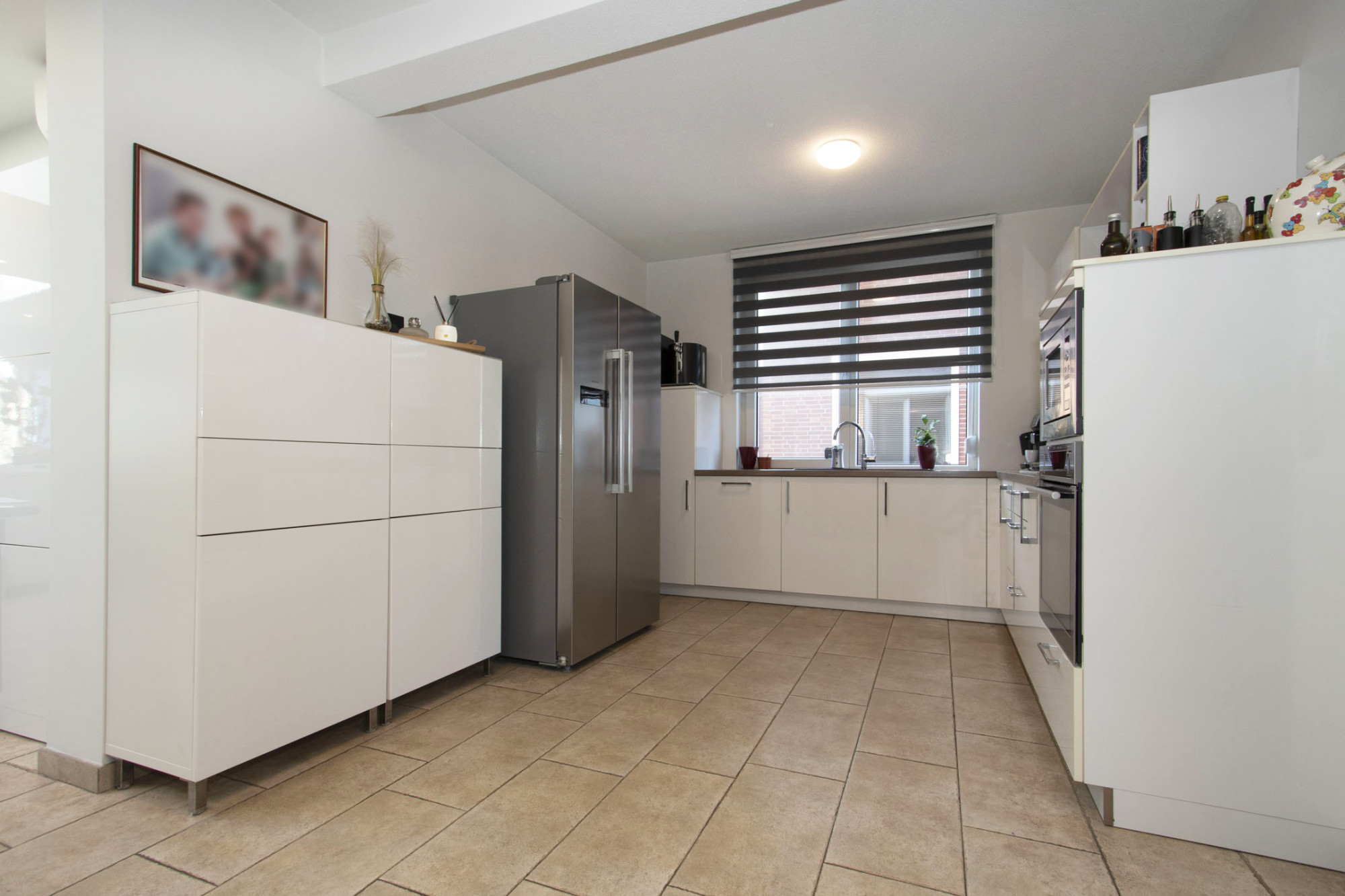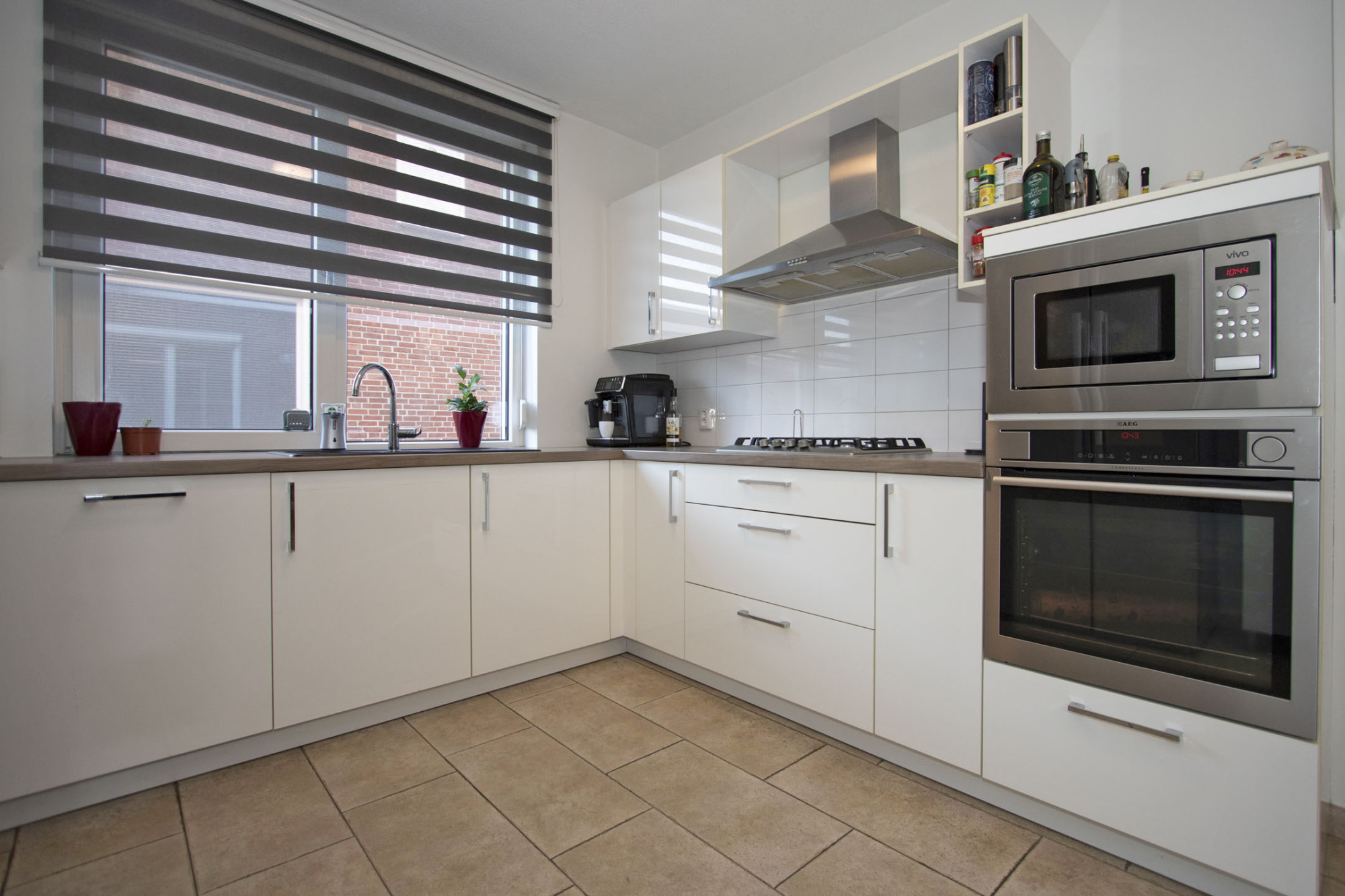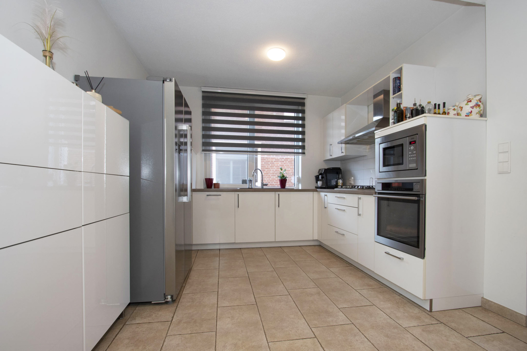 De hoogglans inbouwkeuken is comfortabel uitgevoerd met 4-pits gasfornuis, rvs-afzuigkap, stoom-oven, magnetron, spoelbak en koelkast.