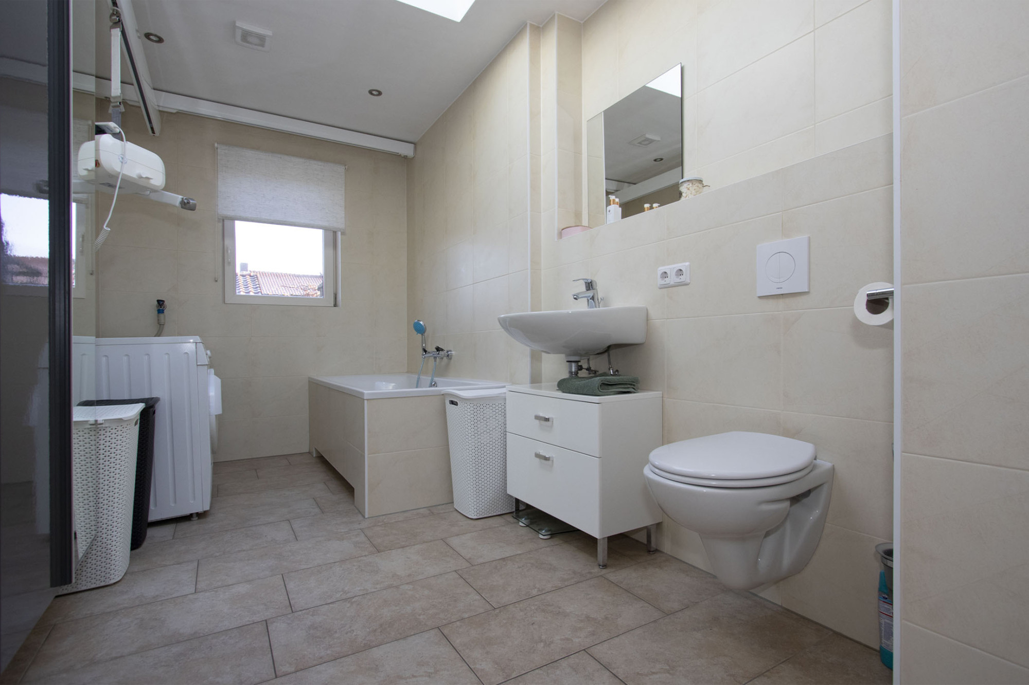 Deze badkamer is uitgerust met ligbad, wastafel, designradiator en witgoedaansluitingen.