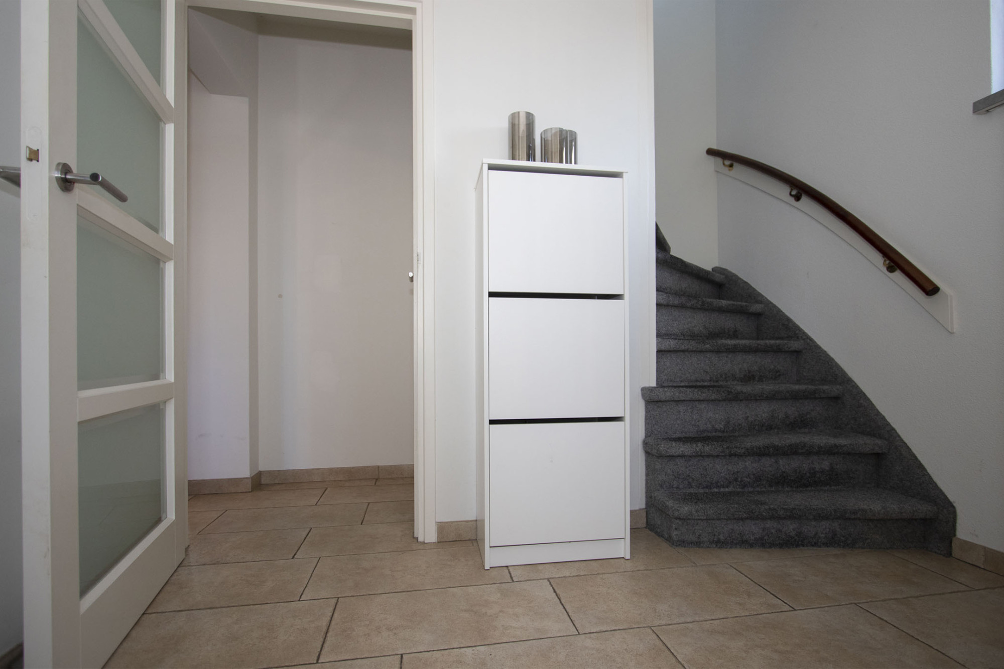Entree in de ontvangsthal met meterkast, toilet, trap, provisiekelder en doorgang naar de woonkamer.