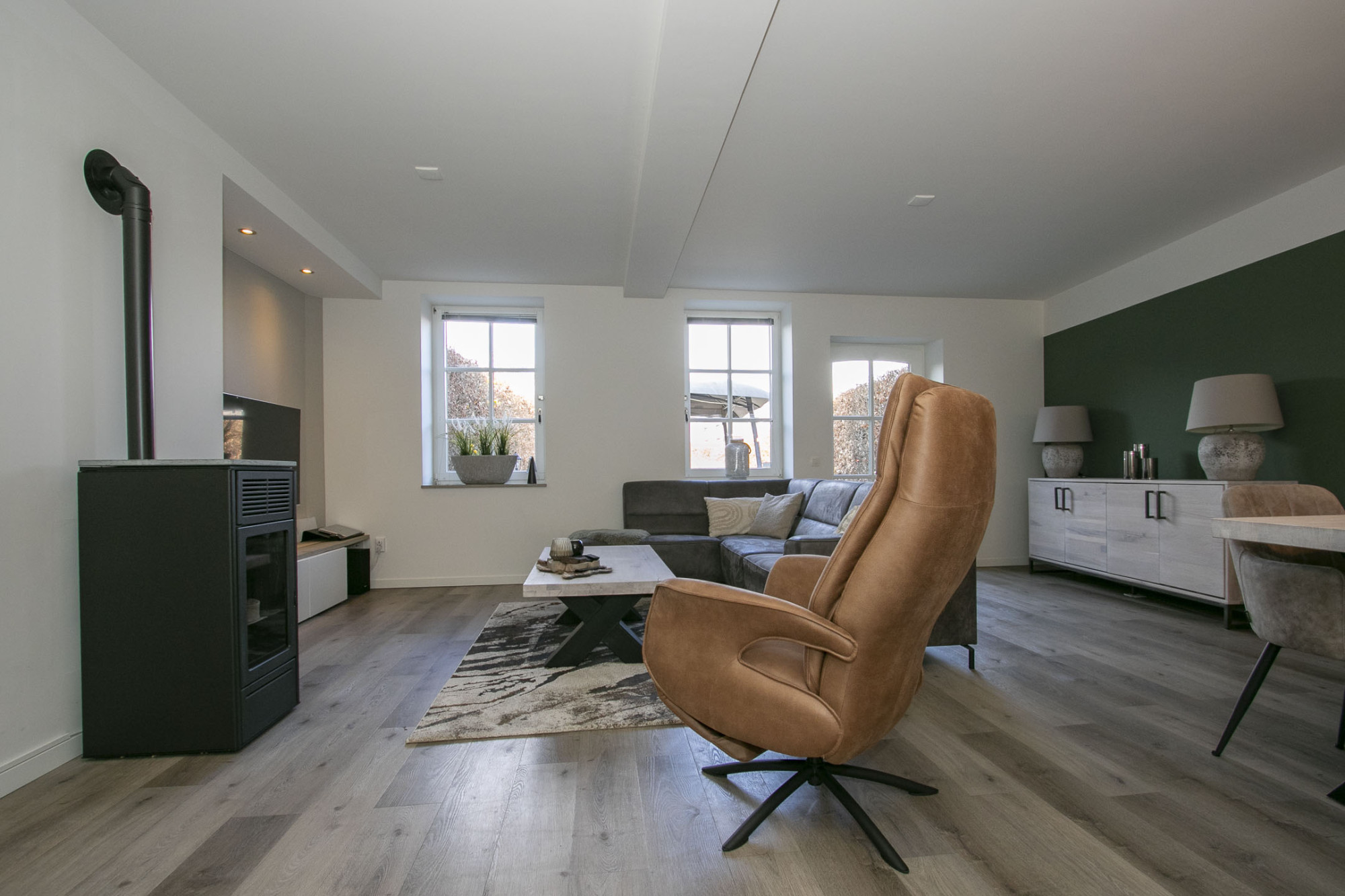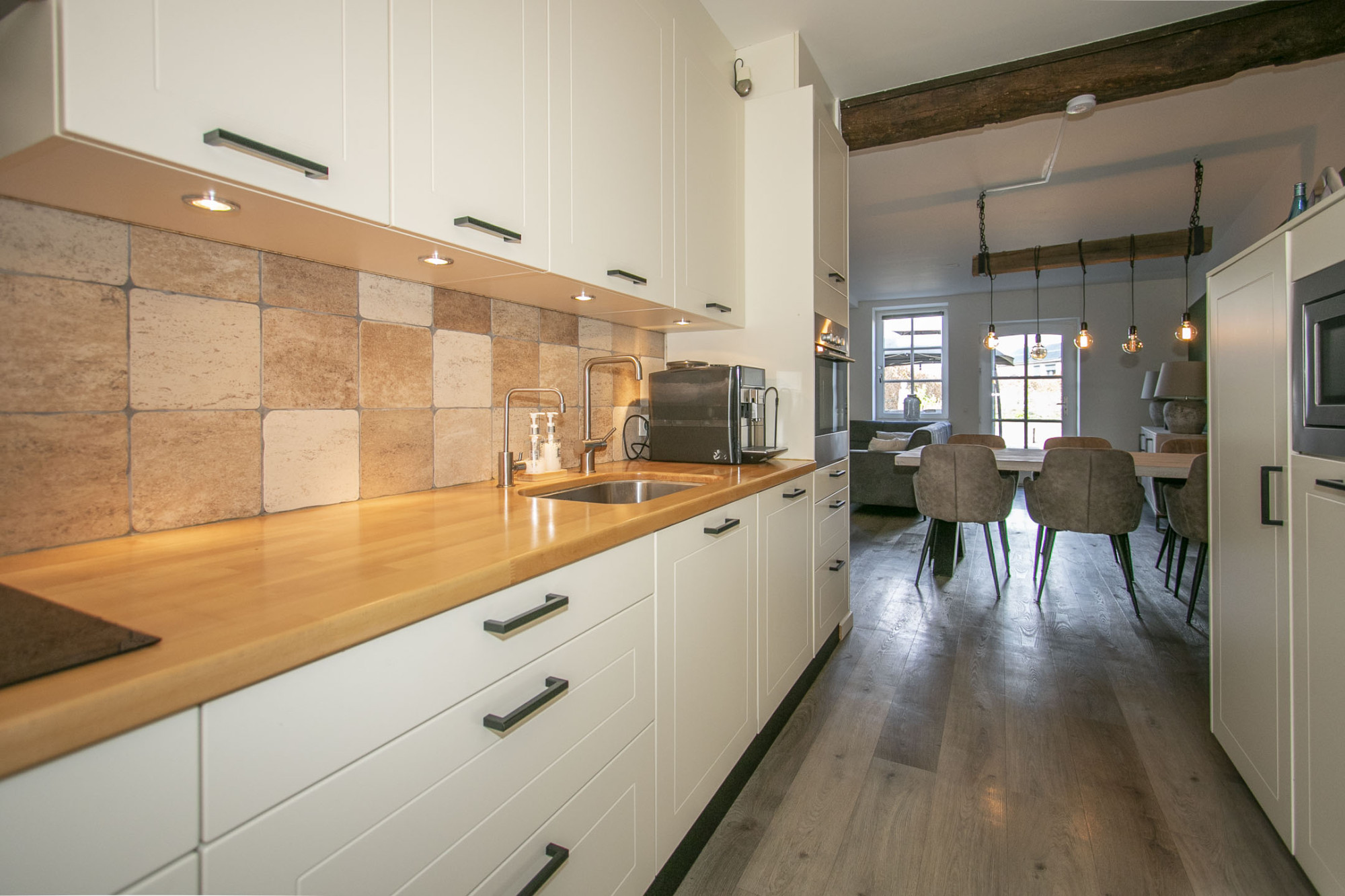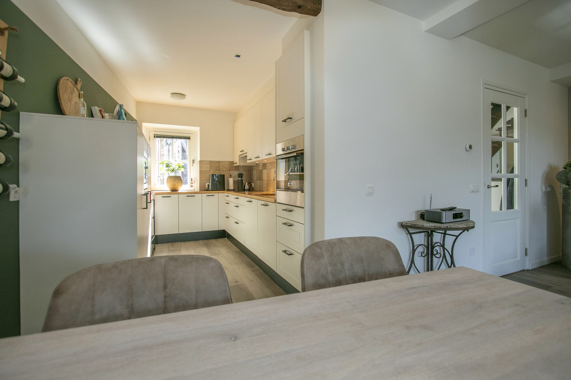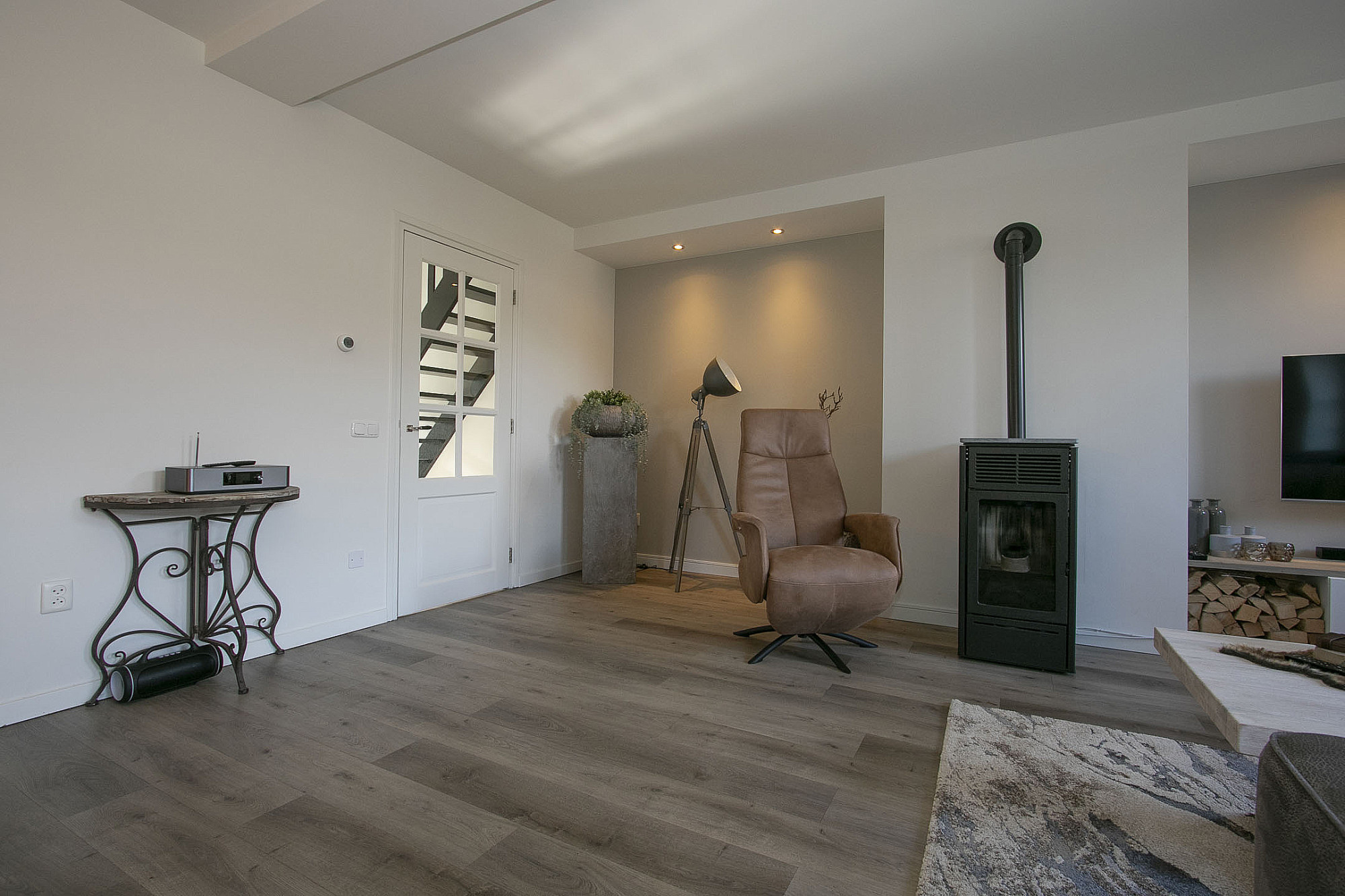 De woonkamer is ruim, licht en sfeervol, mede dankzij de pellet kachel die zorgt voor een knusse warmte. Vanuit de woonkamer heb je direct toegang tot de open keuken. De keuken is stijlvol uitgevoerd in lichte kleuren, met een houten werkblad en zwarte greepjes. Moderne inbouwapparatuur, zoals een cooker kraan, vaatwasser, afzuigkap, oven, magnetron, inductiekookplaat en koelkast, maken de keuken compleet.