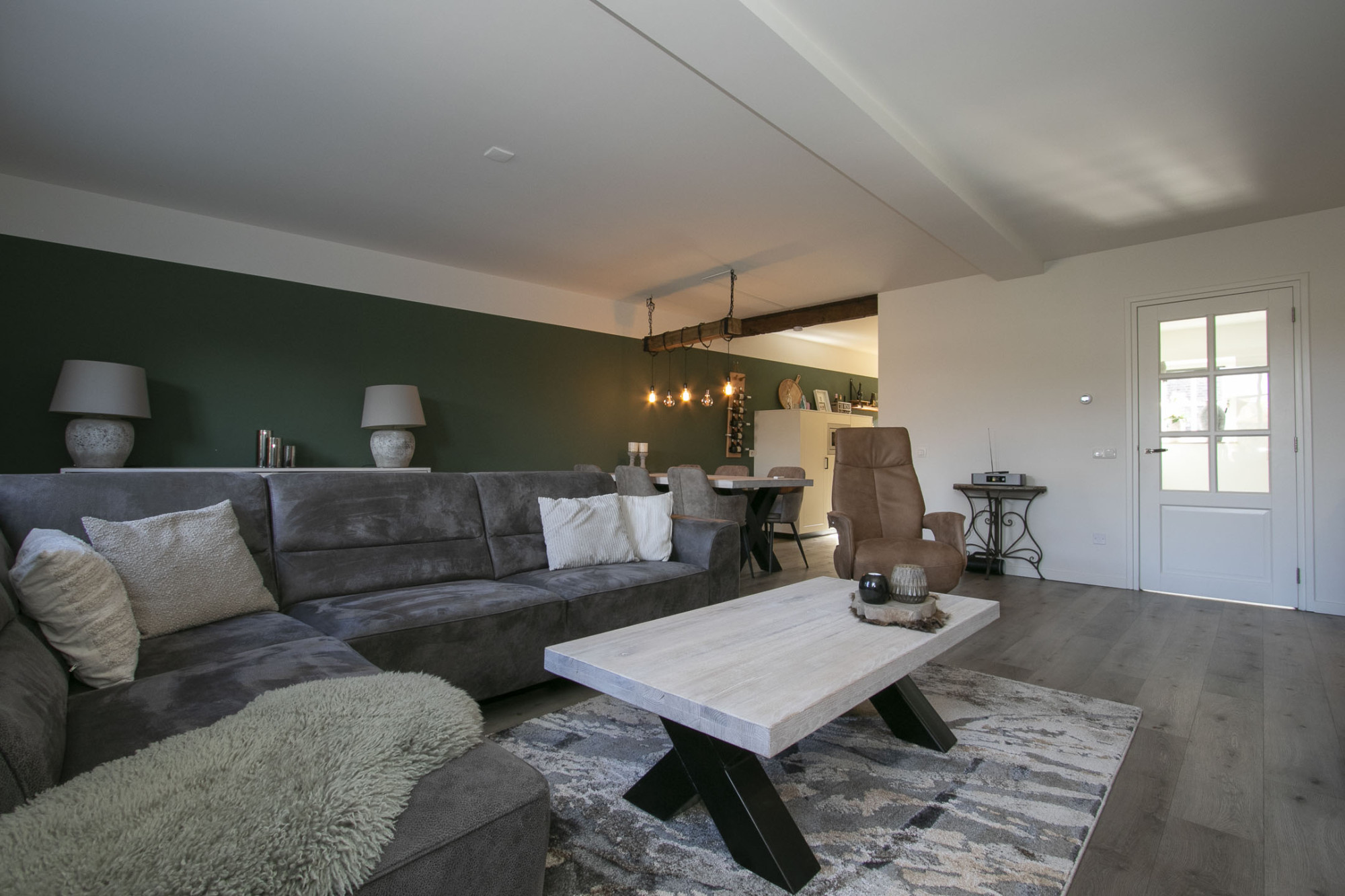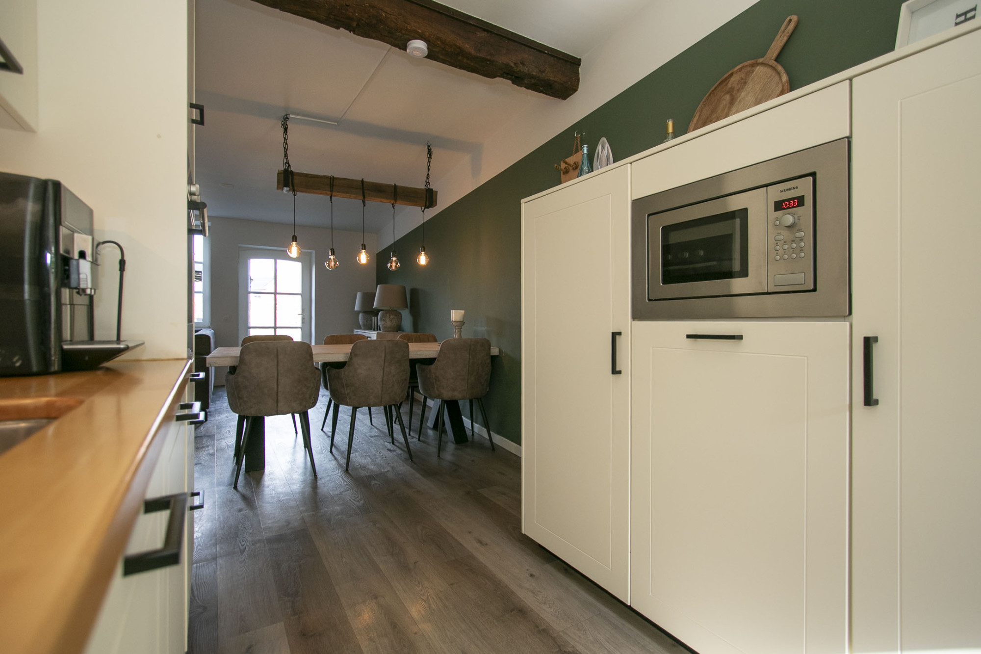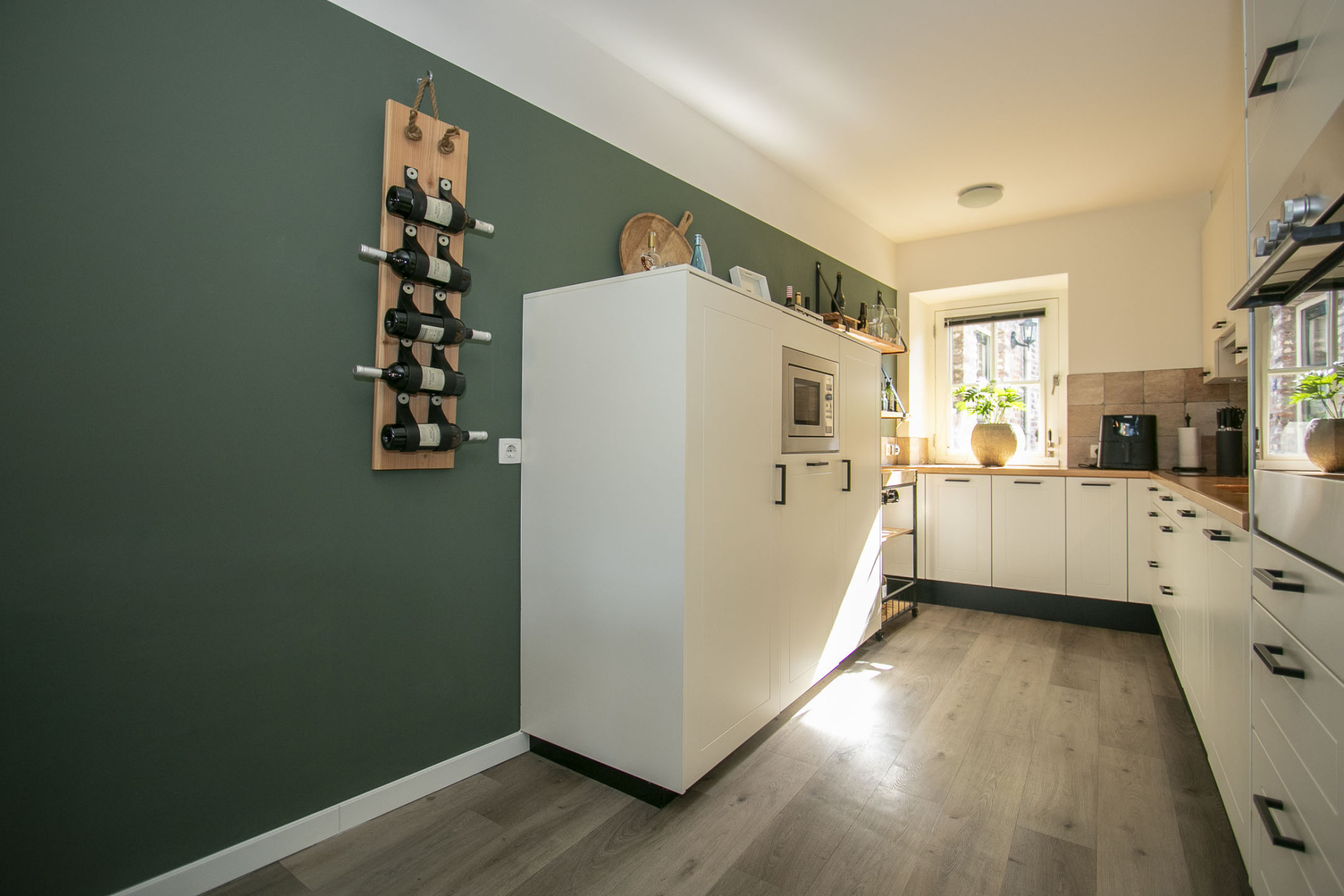 De woonkamer is ruim, licht en sfeervol, mede dankzij de pellet kachel die zorgt voor een knusse warmte. Vanuit de woonkamer heb je direct toegang tot de open keuken. De keuken is stijlvol uitgevoerd in lichte kleuren, met een houten werkblad en zwarte greepjes. Moderne inbouwapparatuur, zoals een cooker kraan, vaatwasser, afzuigkap, oven, magnetron, inductiekookplaat en koelkast, maken de keuken compleet.