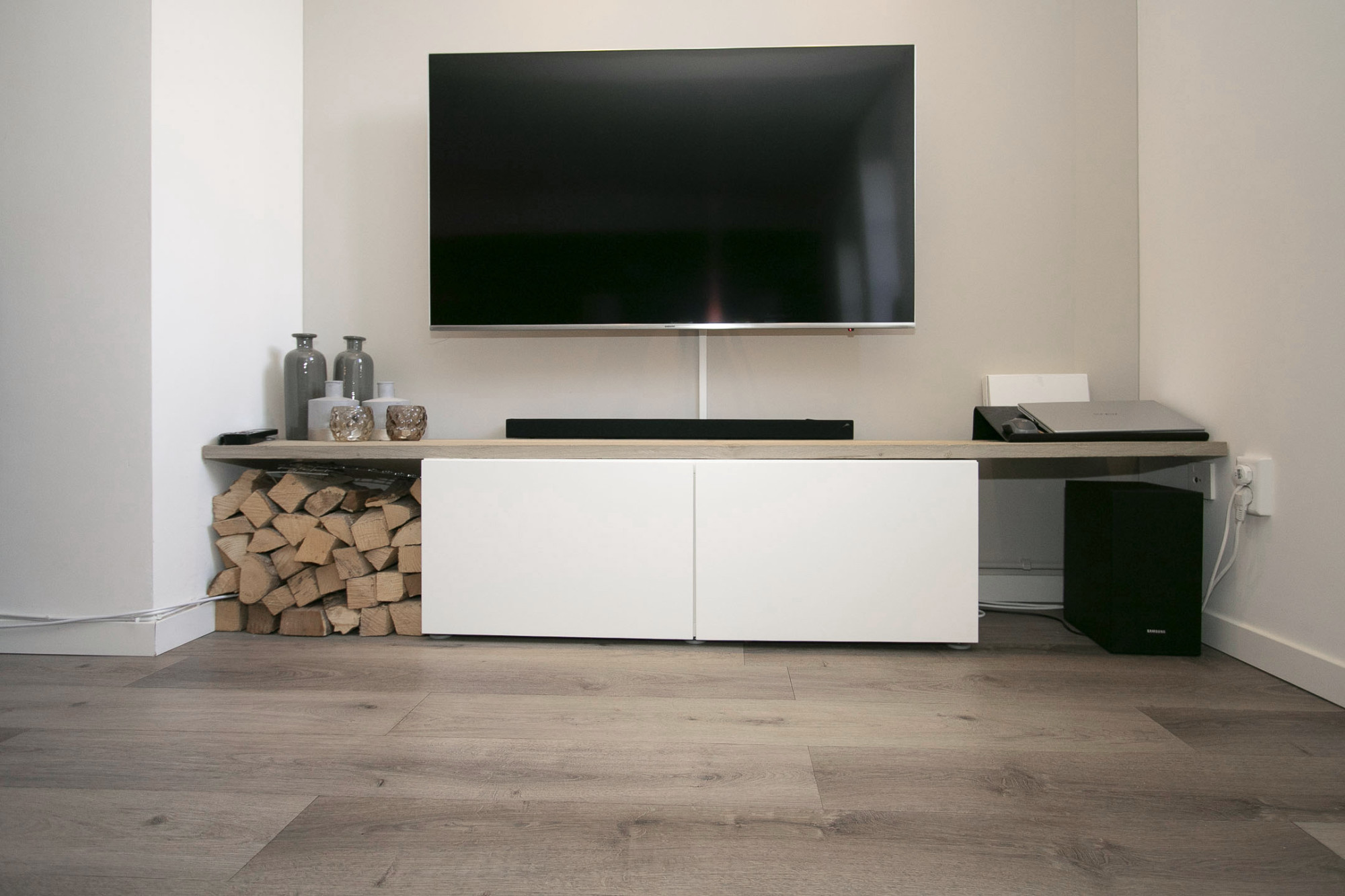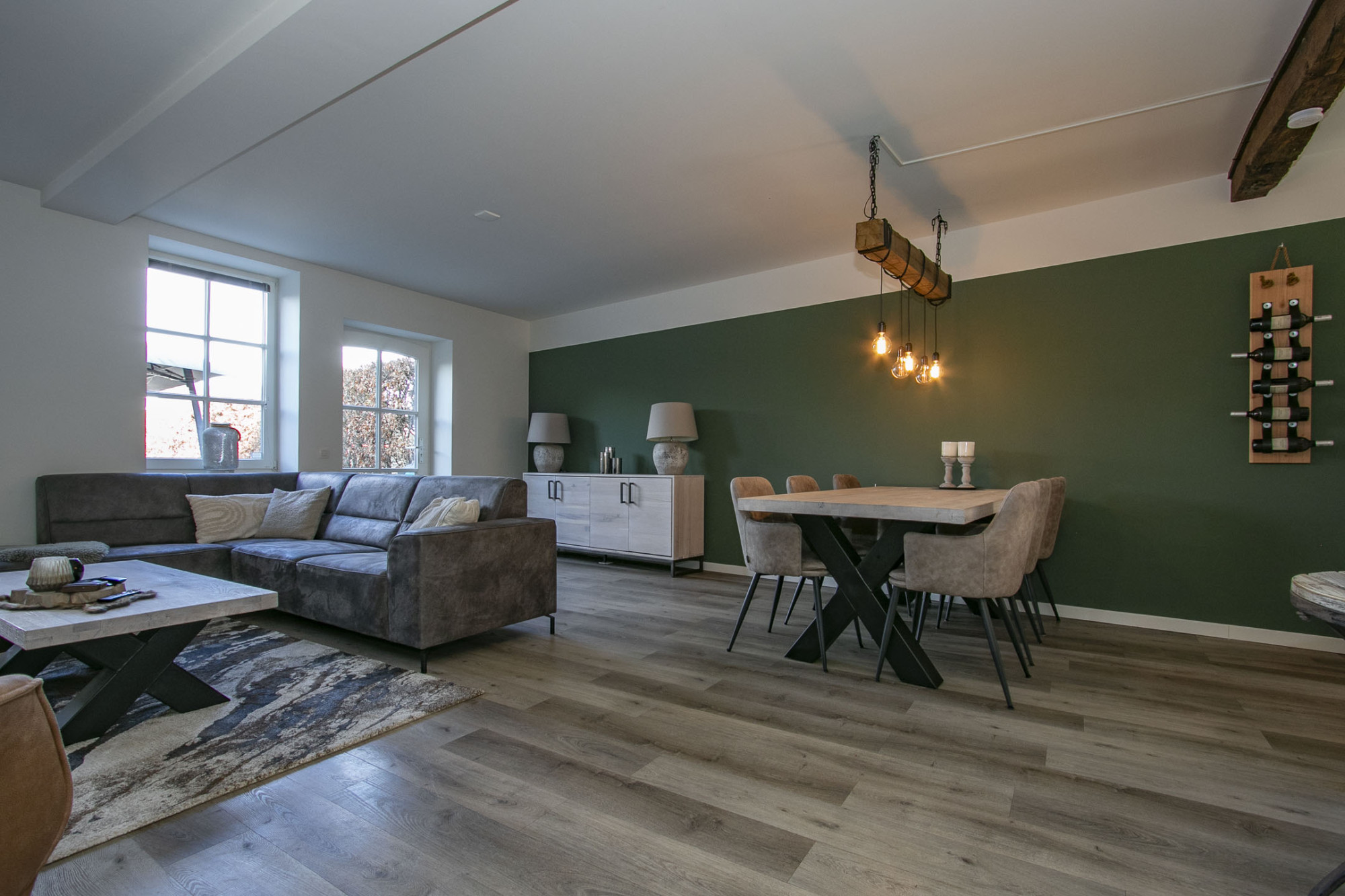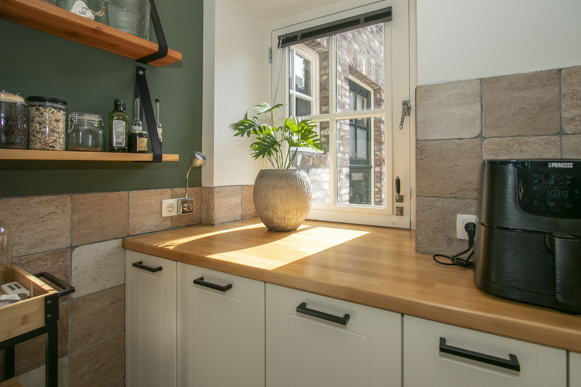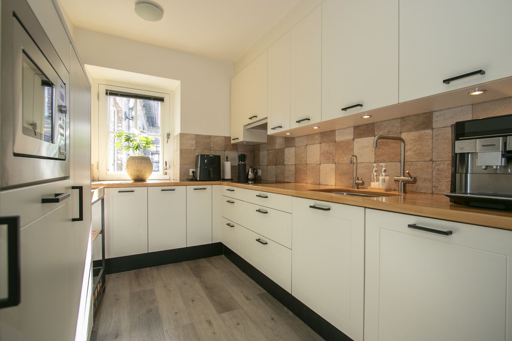 De woonkamer is ruim, licht en sfeervol, mede dankzij de pellet kachel die zorgt voor een knusse warmte. Vanuit de woonkamer heb je direct toegang tot de open keuken. De keuken is stijlvol uitgevoerd in lichte kleuren, met een houten werkblad en zwarte greepjes. Moderne inbouwapparatuur, zoals een cooker kraan, vaatwasser, afzuigkap, oven, magnetron, inductiekookplaat en koelkast, maken de keuken compleet.