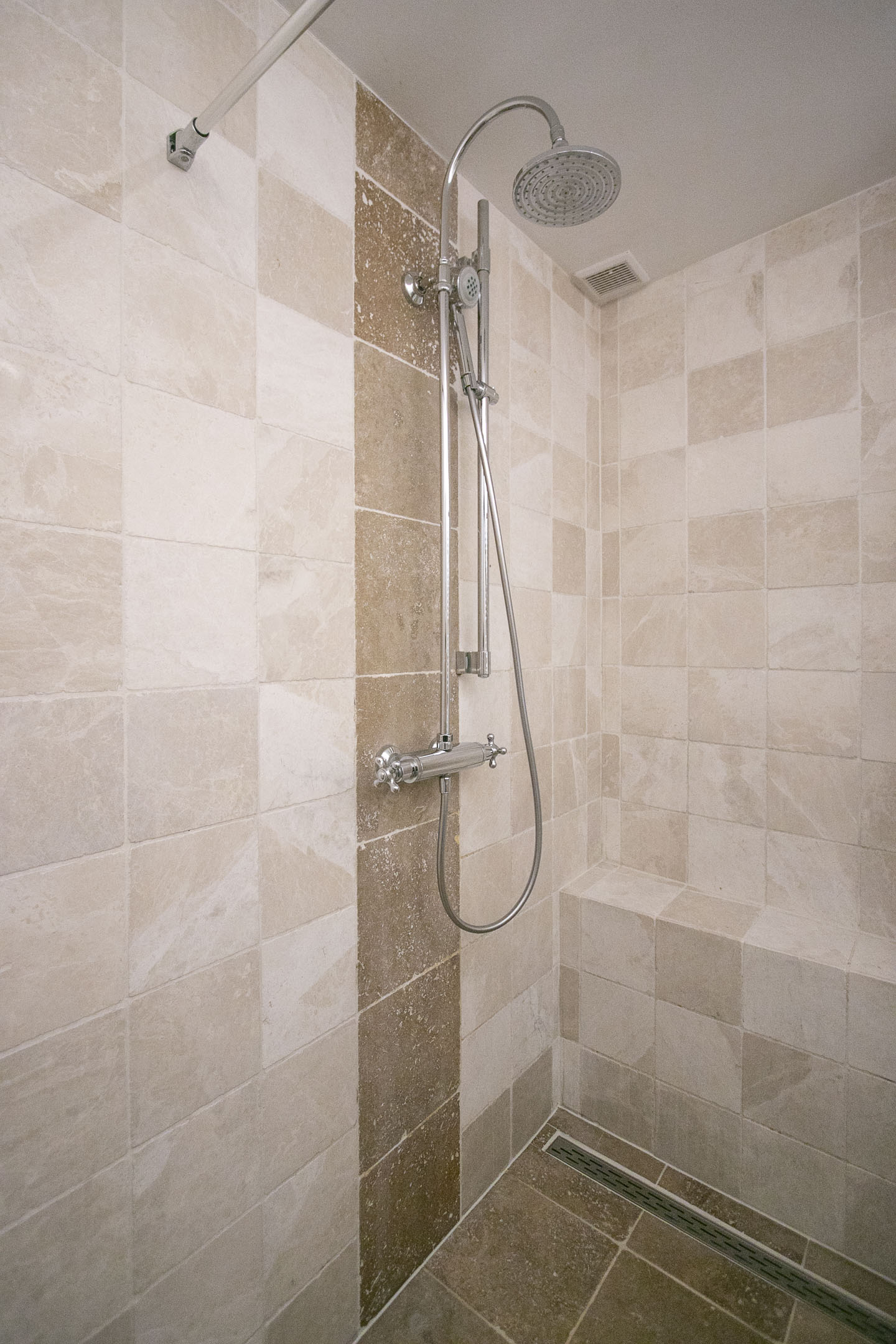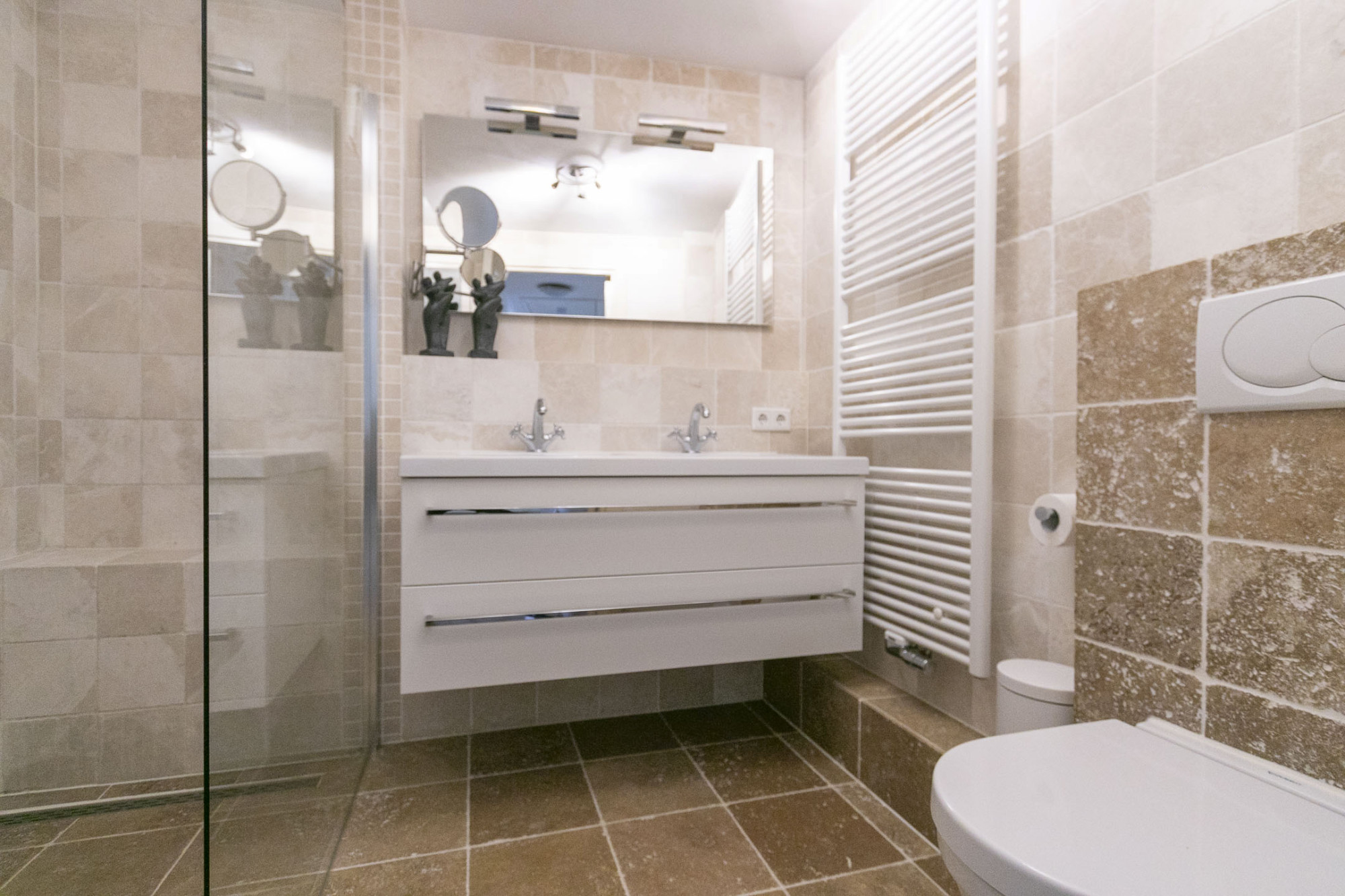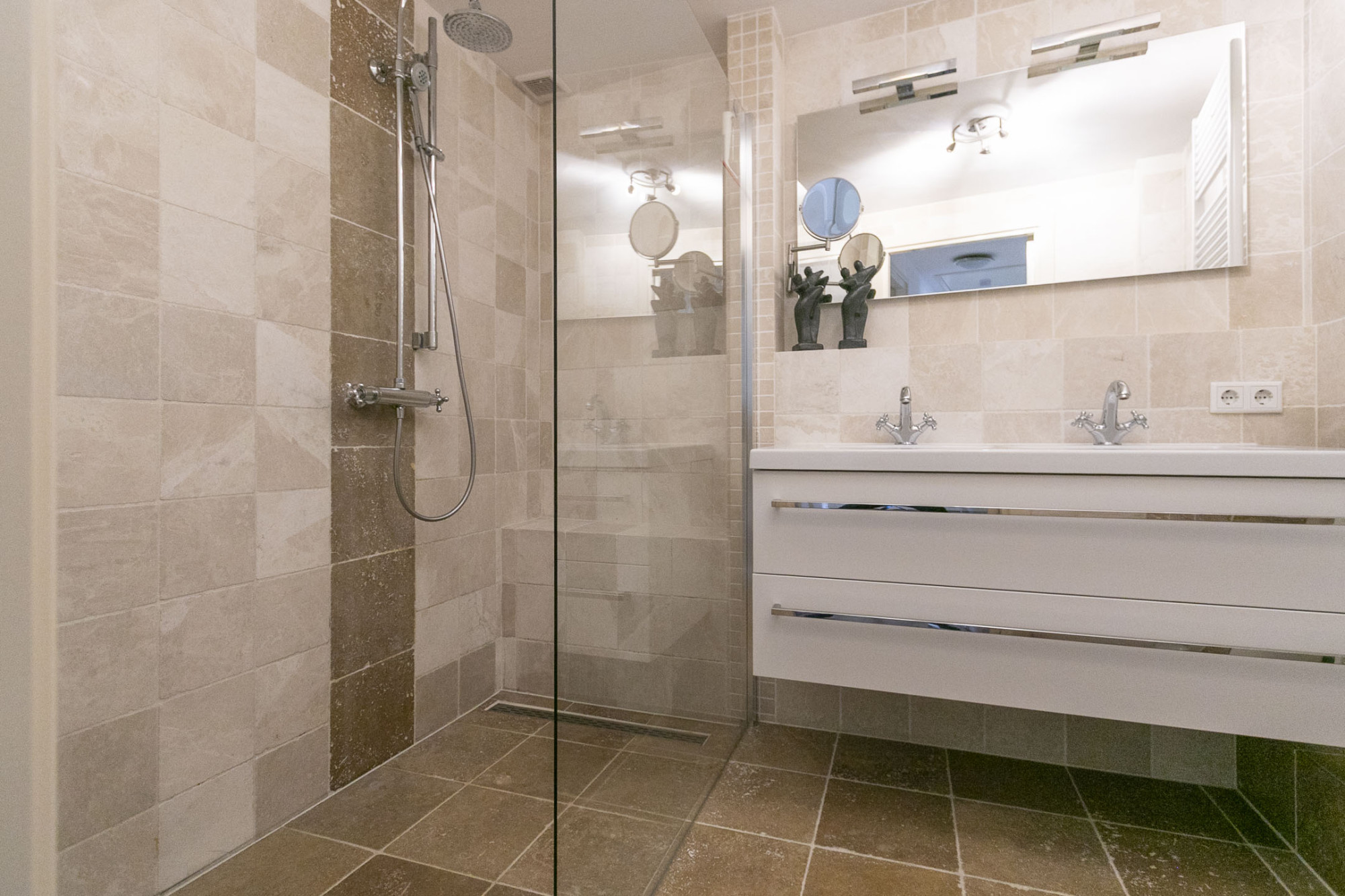 De badkamer biedt comfort met een inloopdouche, dubbele wastafel, wastafelmeubel, wandcloset en een designradiator. De ruimte is efficiënt ingedeeld.