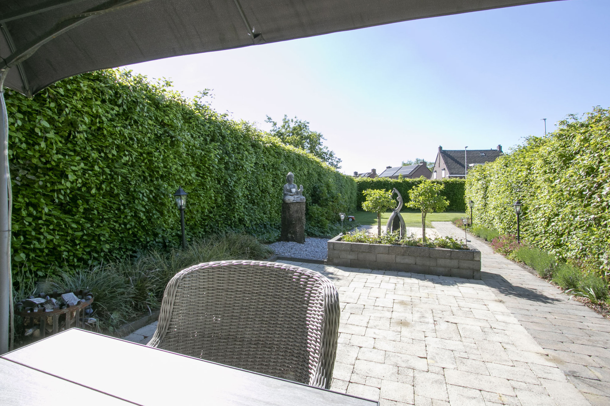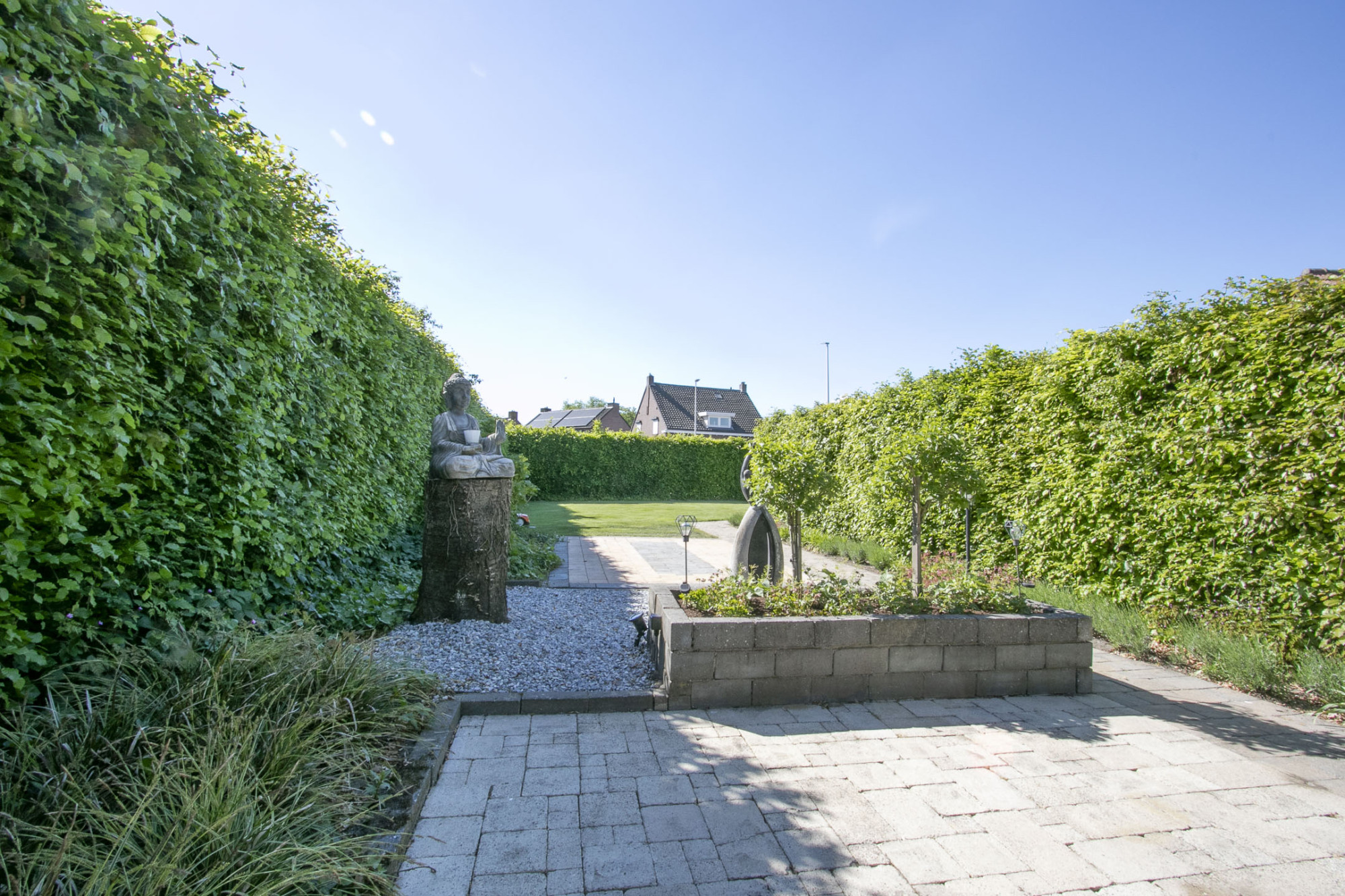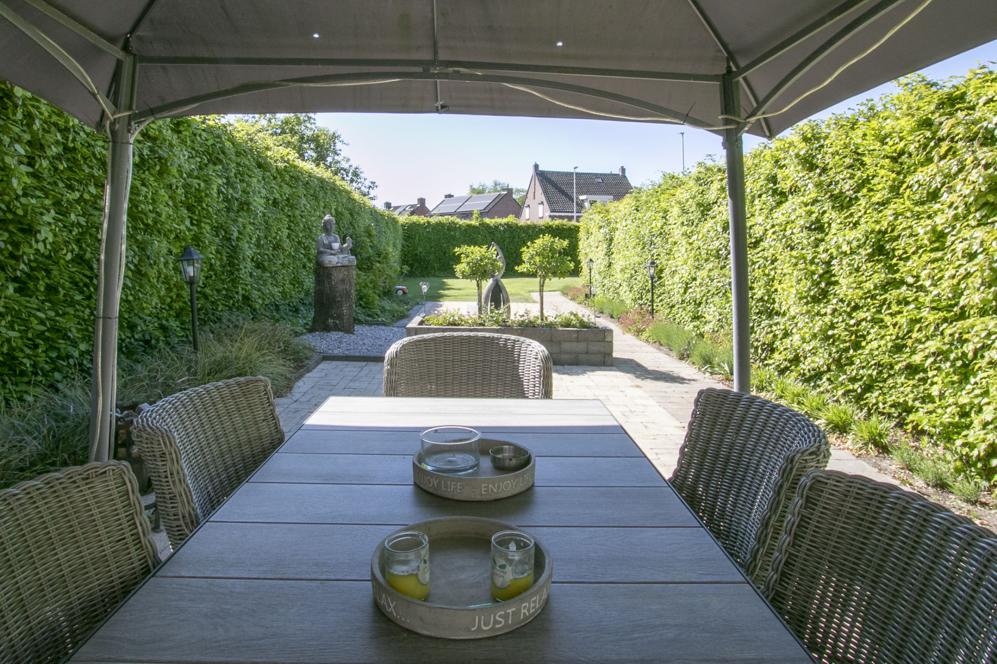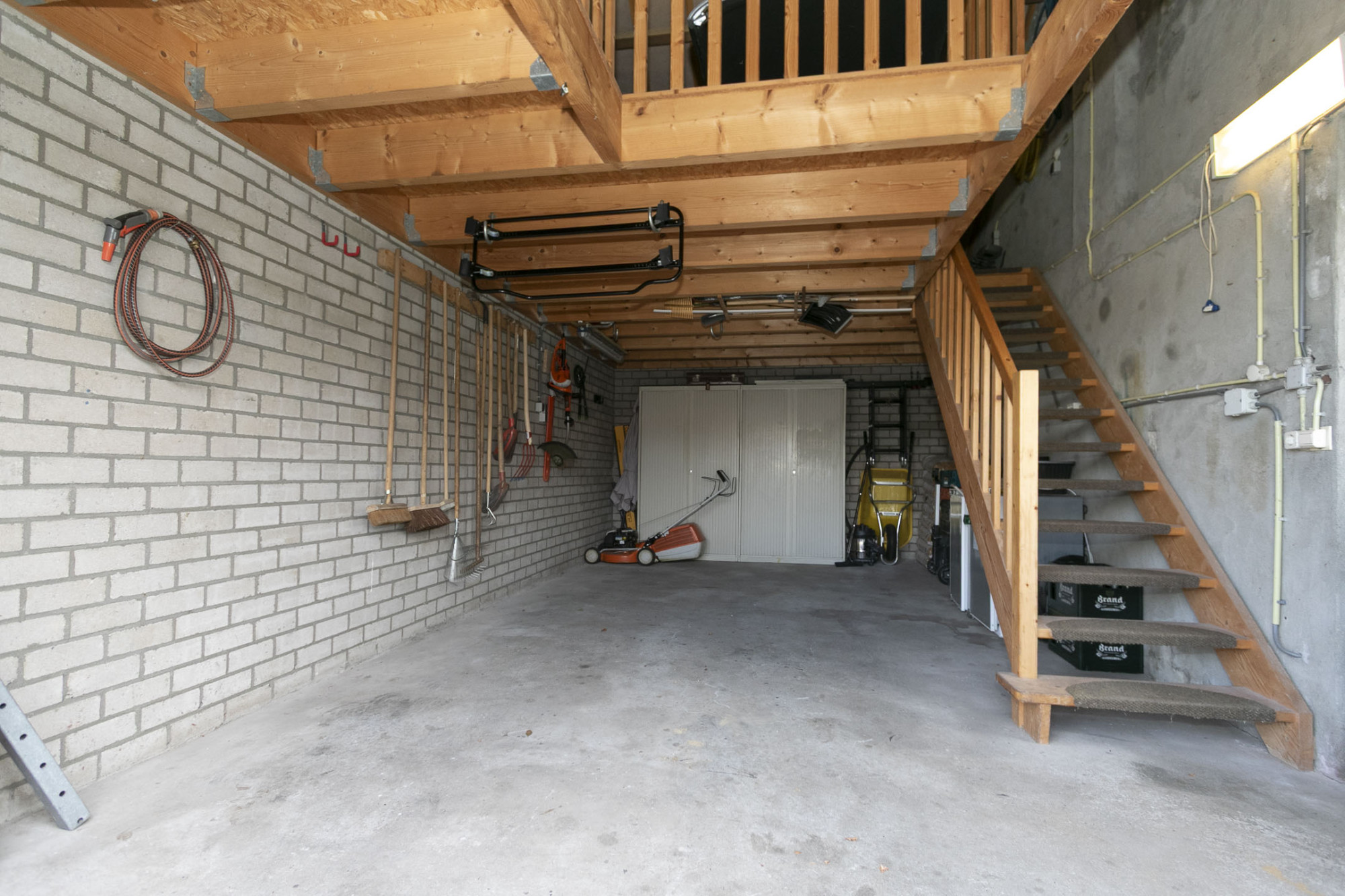 De woning beschikt over een tuin van circa 300 m². Aan de voorzijde is een gezellig terras, terwijl een beklinkerd pad naar de garage leidt. De garage is een waardevolle toevoeging, met openslaande deuren, een vliering voor extra bergruimte en voorzien van elektra.