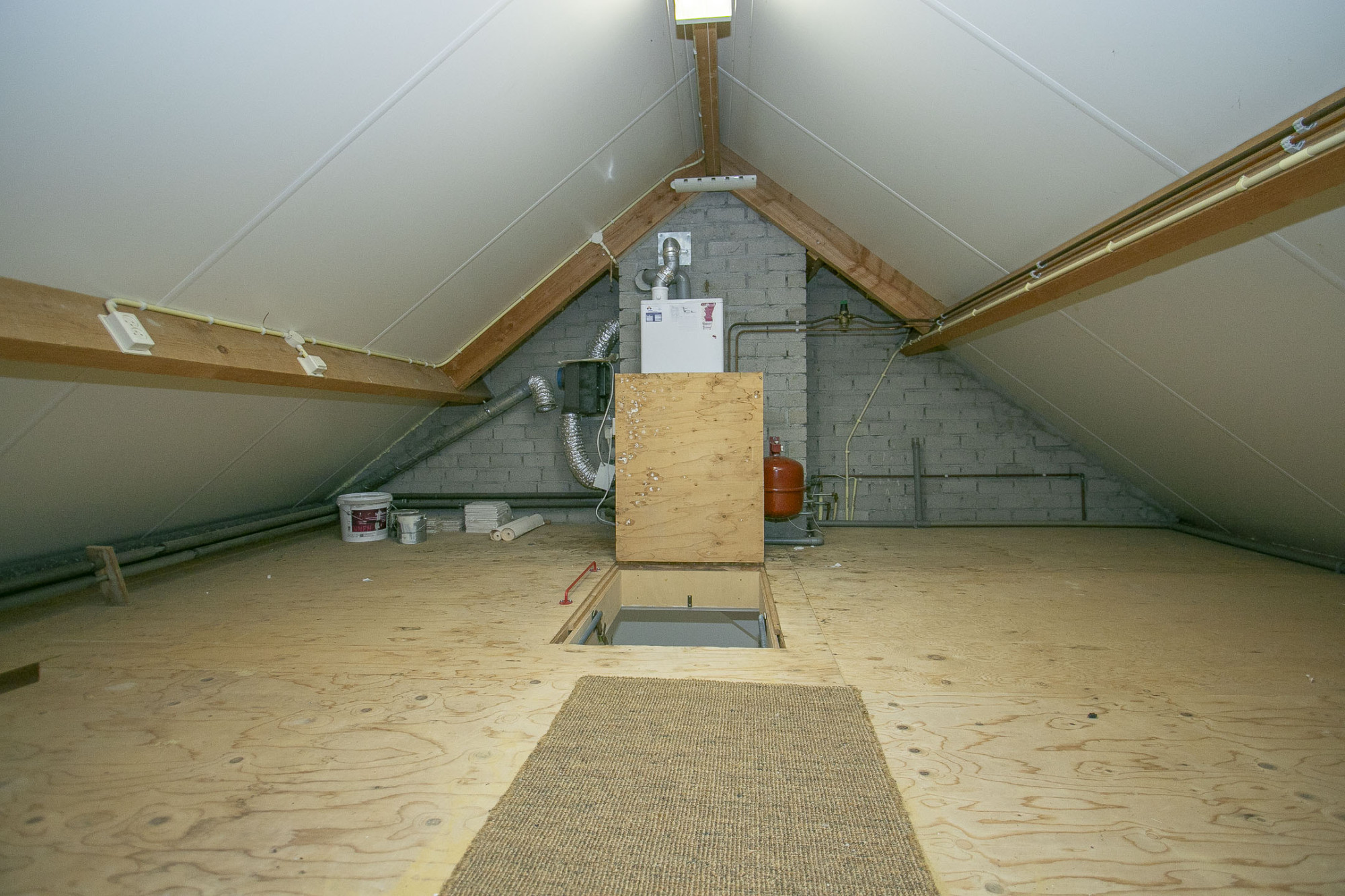 Vanuit de overloop bereik je via een vlizotrap de bergzolder. Deze zolder heeft een hoge nok, waardoor je gemakkelijk kunt staan en biedt voldoende ruimte voor het opbergen van spullen. Hier is ook de cv-ketel (Intergas 2011) te vinden, waarvan het binnenwerk volledig is vernieuwd in 2018.