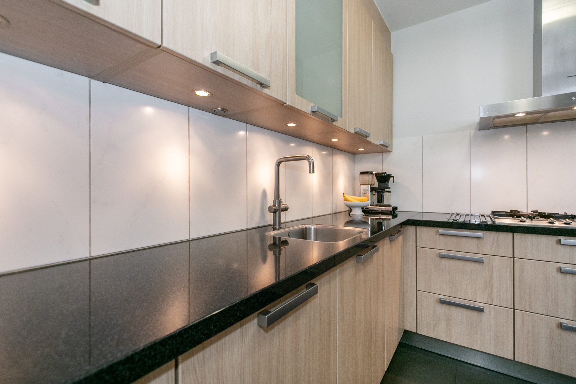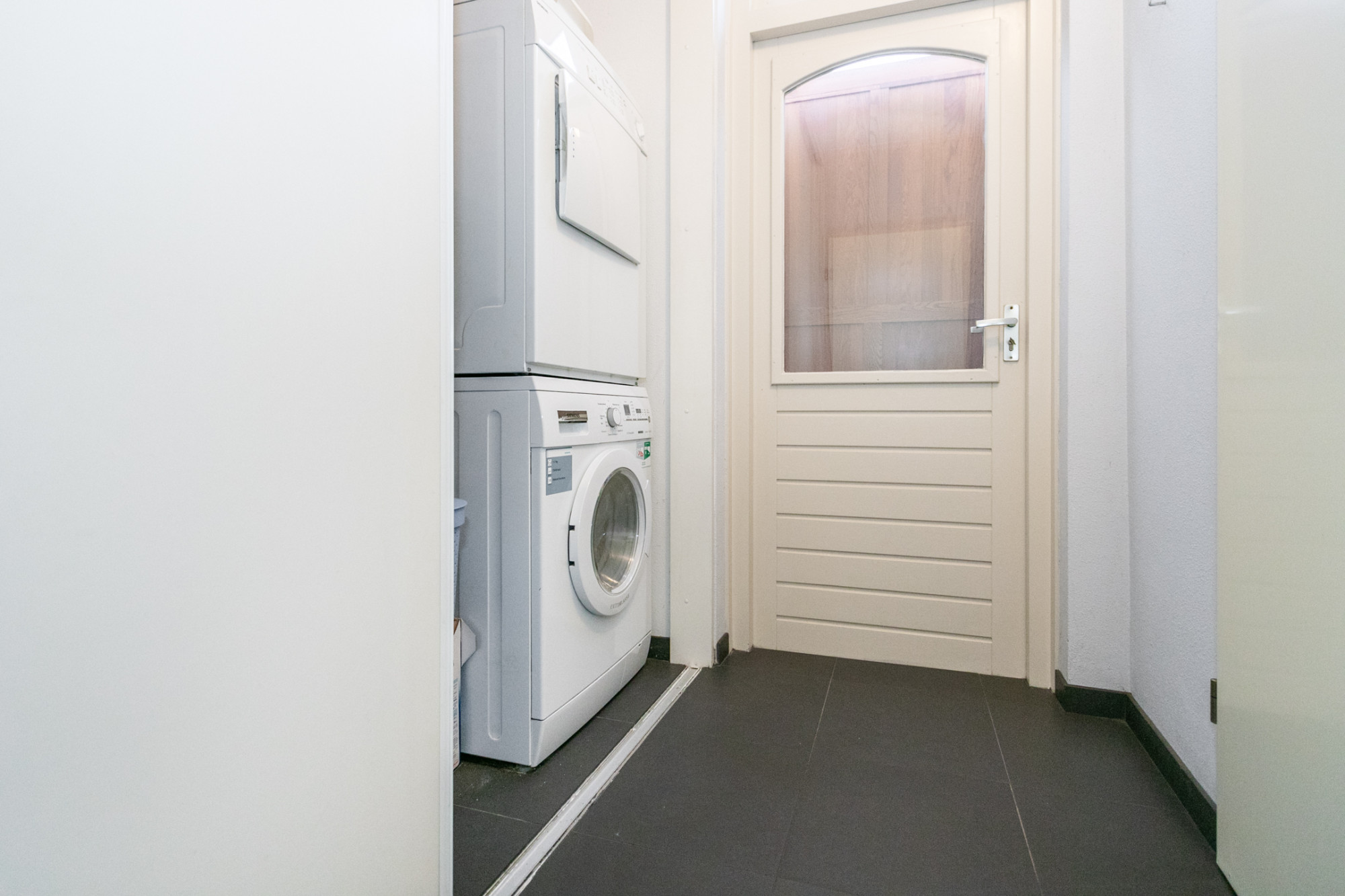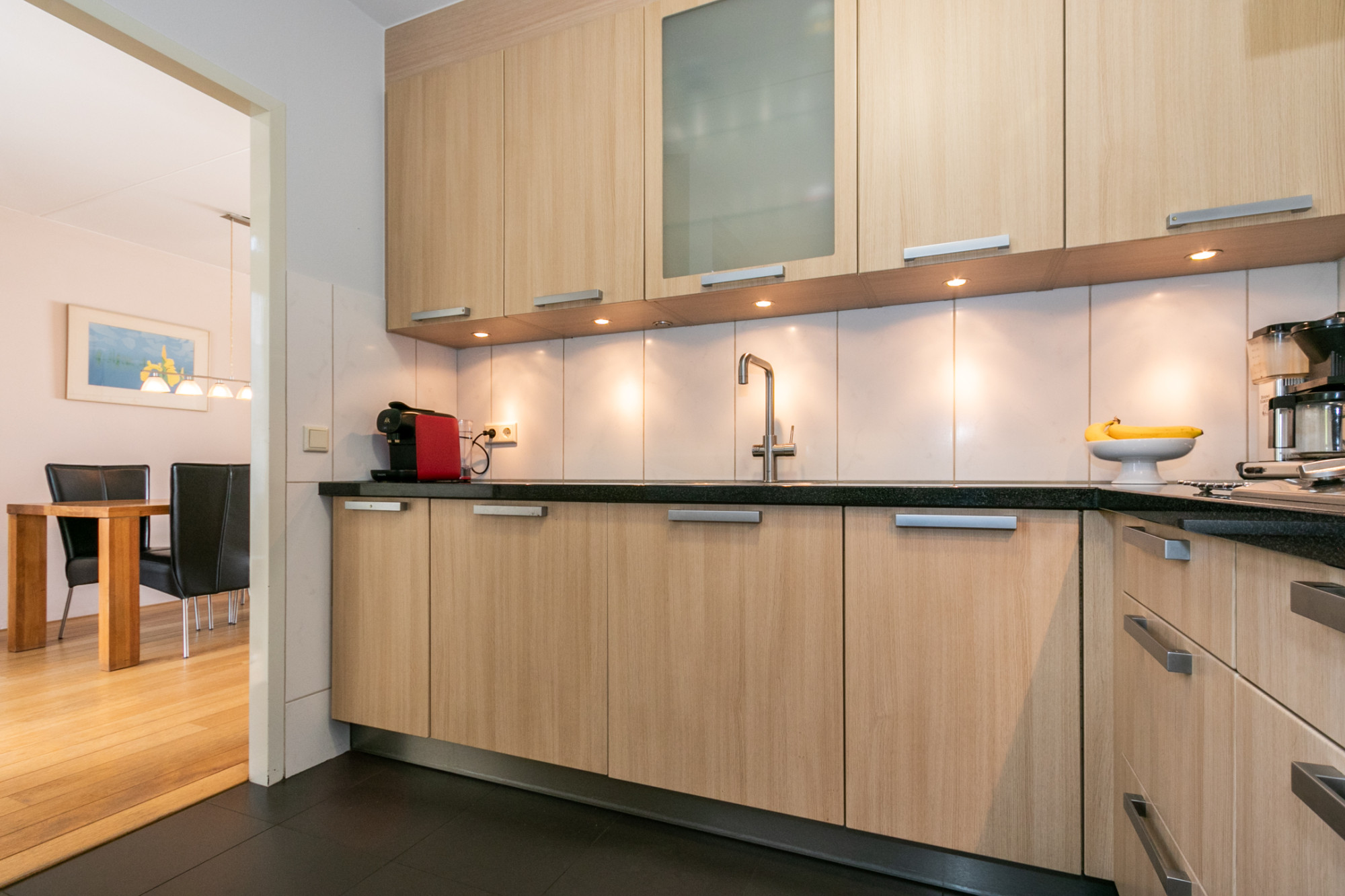 De ruime en complete L-vormige keuken is voorzien van een 5-pits gasfornuis, combi-oven, vaatwasser, koelkast, Grohe heet waterkraan en afzuigkap. Aansluitend vindt u een praktische bijkeuken met wasmachineaansluiting en inpandige garage met elektra, een vliering en dakisolatie.